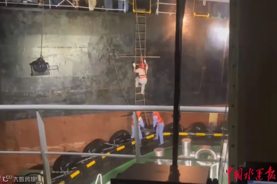 经过近两小时的不懈努力, 拖轮船员们凭借丰富的航海救援经验,趁着风浪稍小的间隙和涌浪规律,将拖轮船位顶推至与外轮最佳并靠位置,并在外轮船员密切配合下,将伤员安全接送至拖轮上。