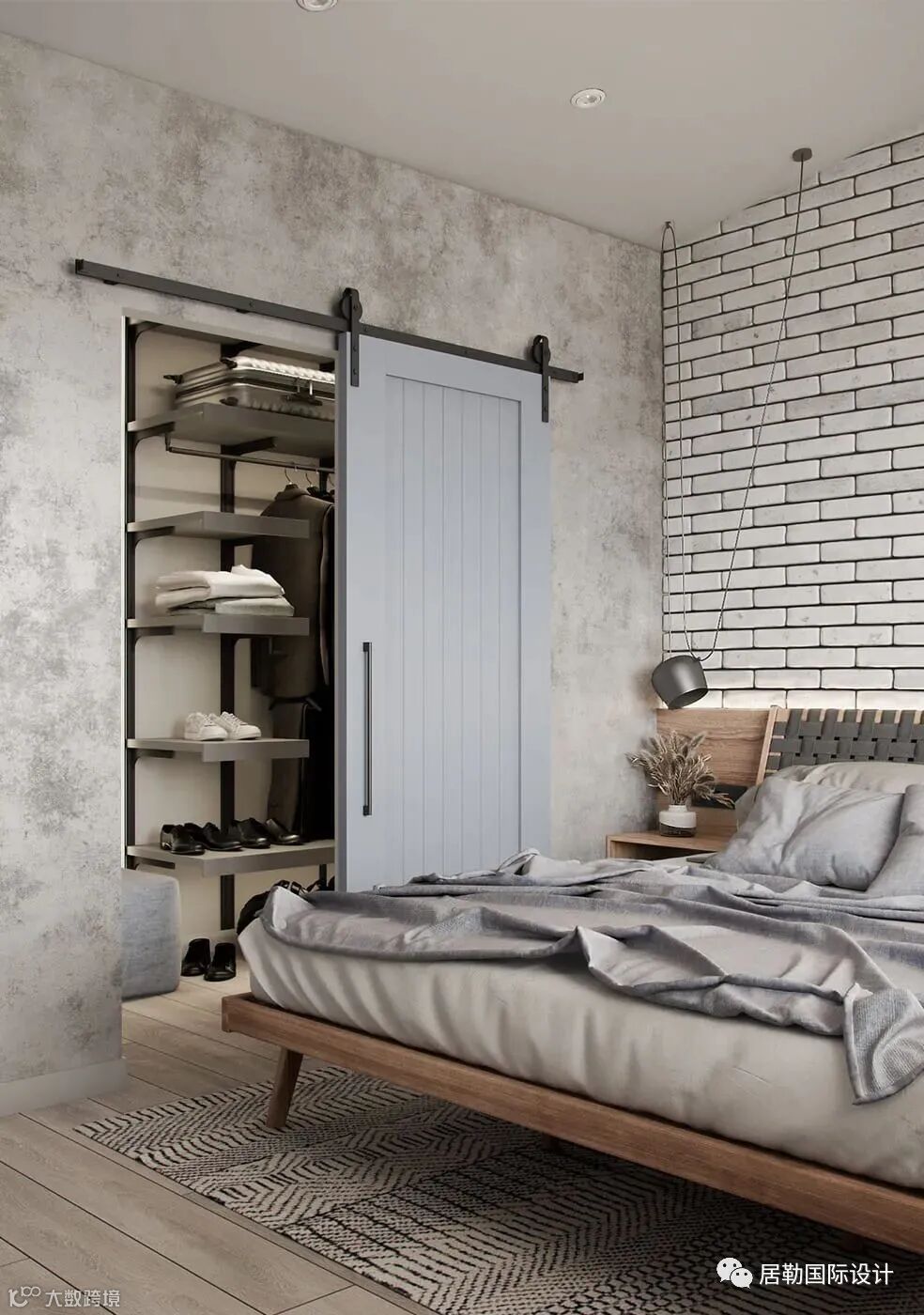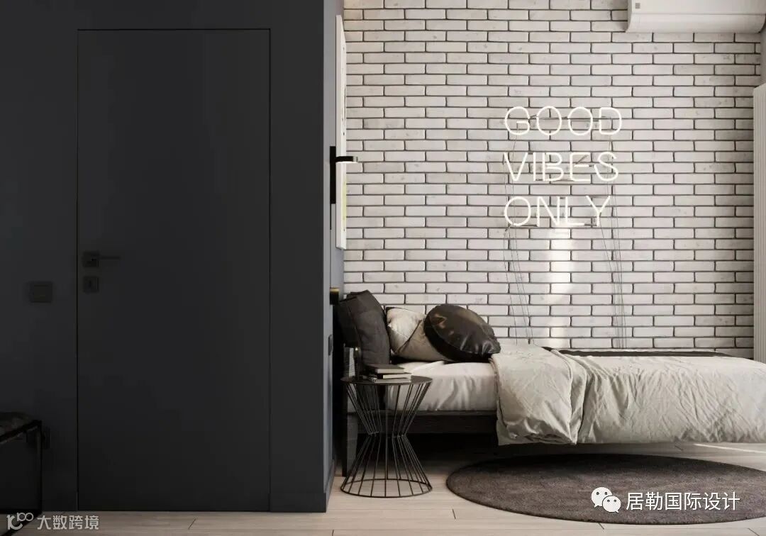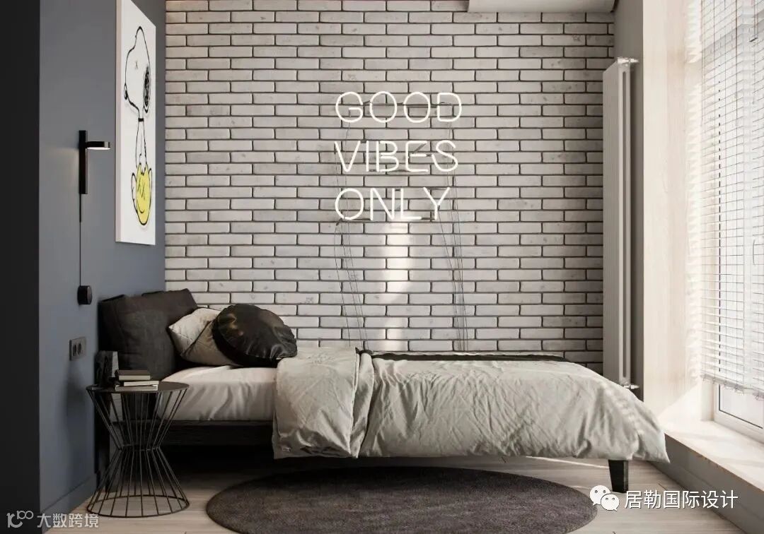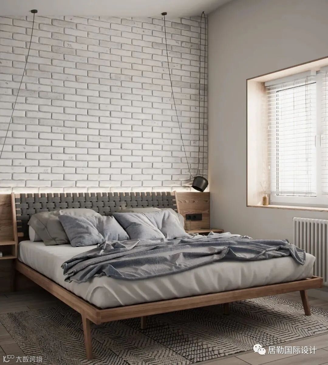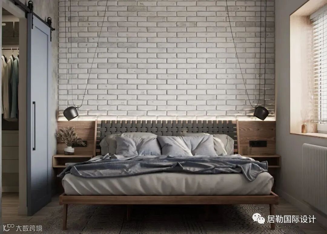 卧室同样以砖砖作为床头背景,床品衣柜的布置,一种轻古典的氛围,很安静的感觉。材料,灯光的设计,设计师在细节方面都做的很好,非常的舒适。