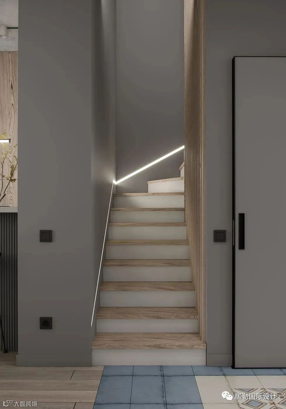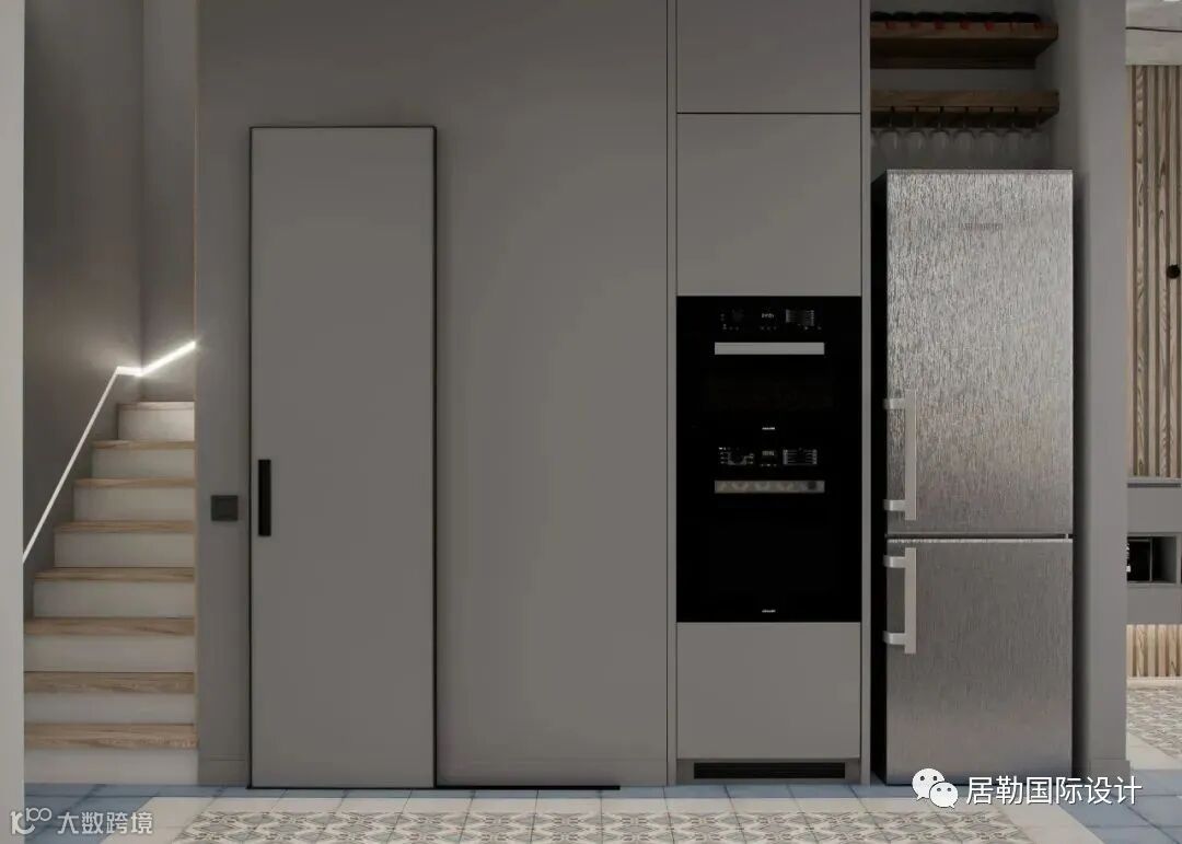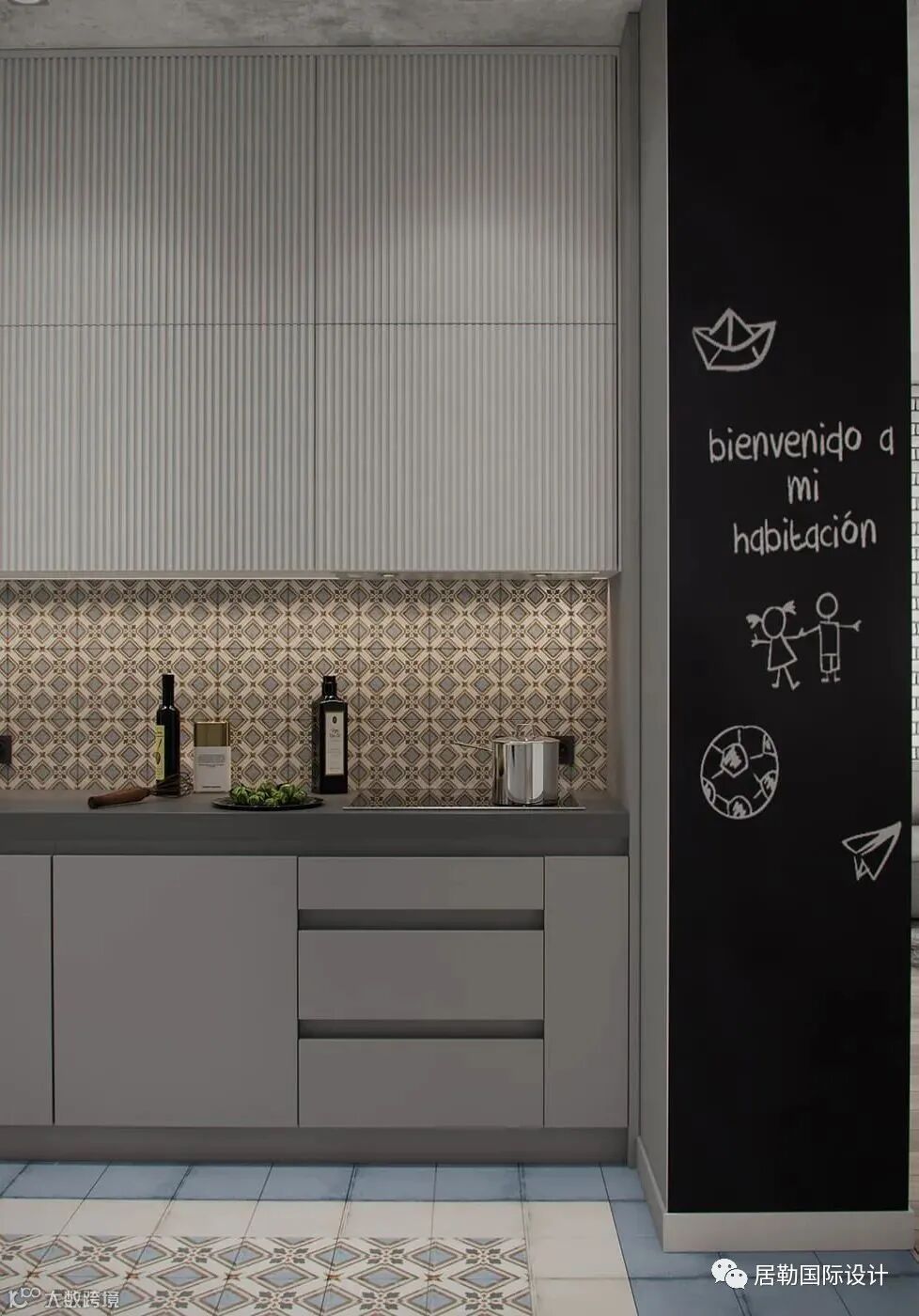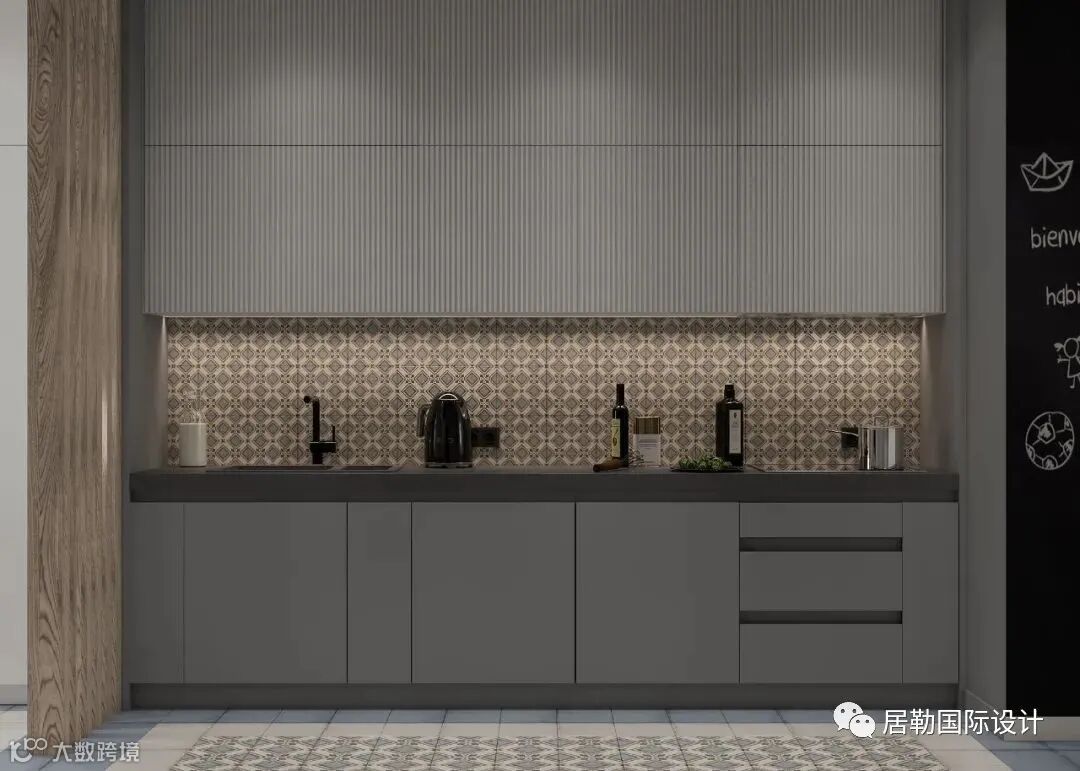 厨房区域以浅灰色搭配花纹的磁砖,一字型布局能保证足够的