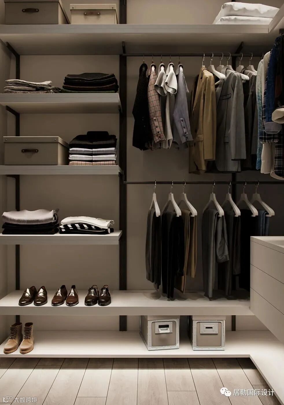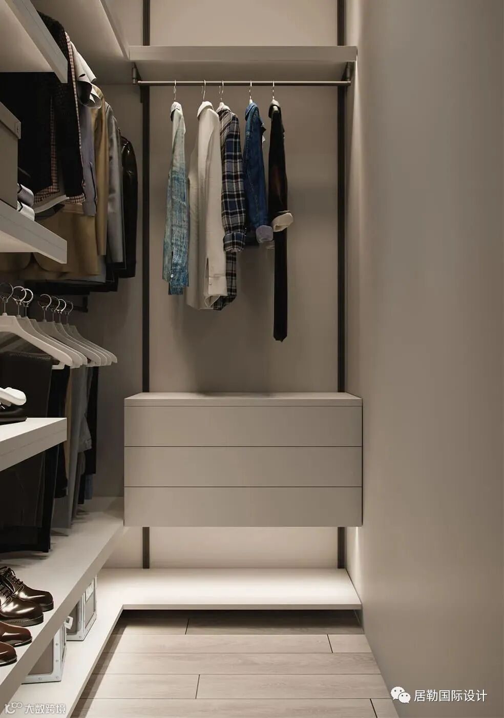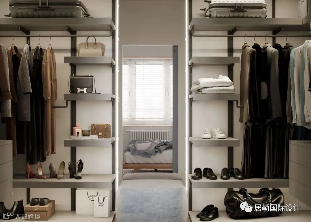 一个步入式衣帽间,空间布局零浪费利用率高,增加了收纳储物的功能且让区域非常有气质。