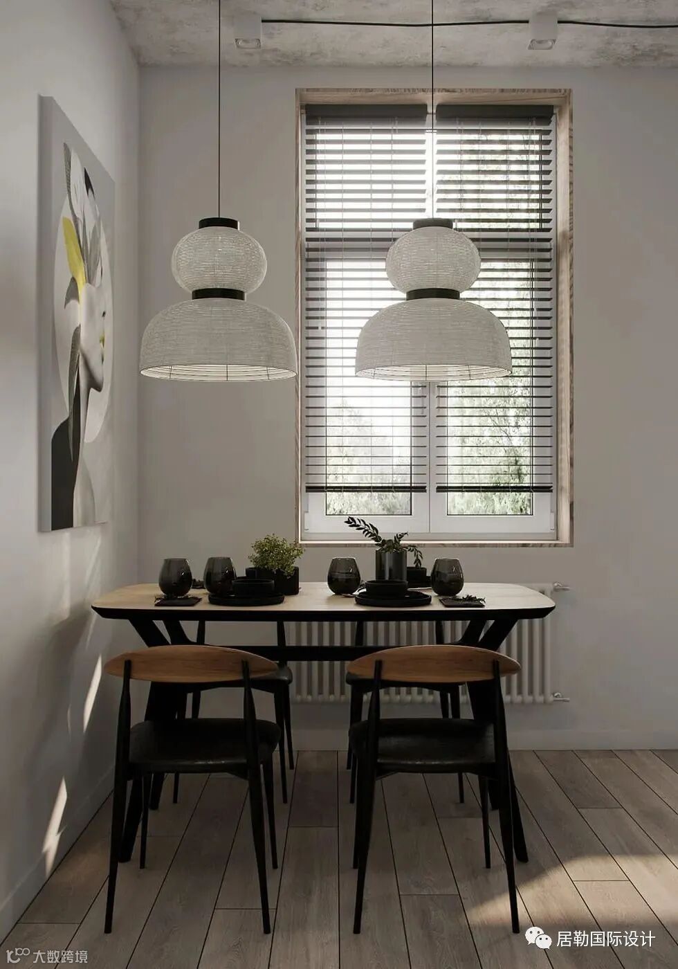 窗前的餐桌,光线充足,简约的吊灯的搭配