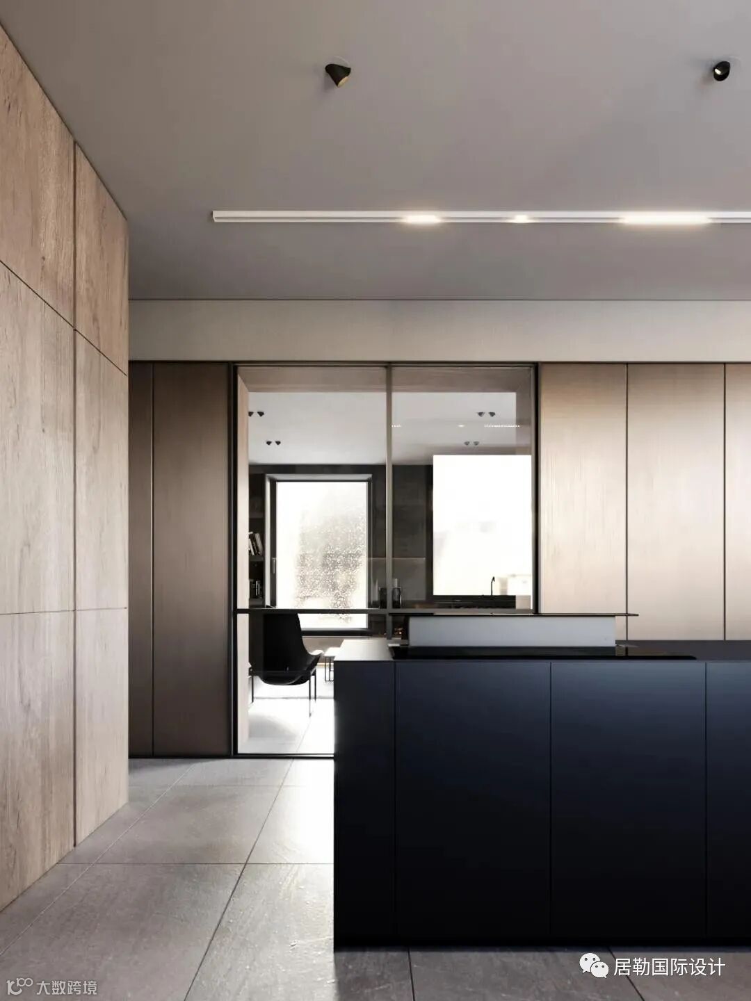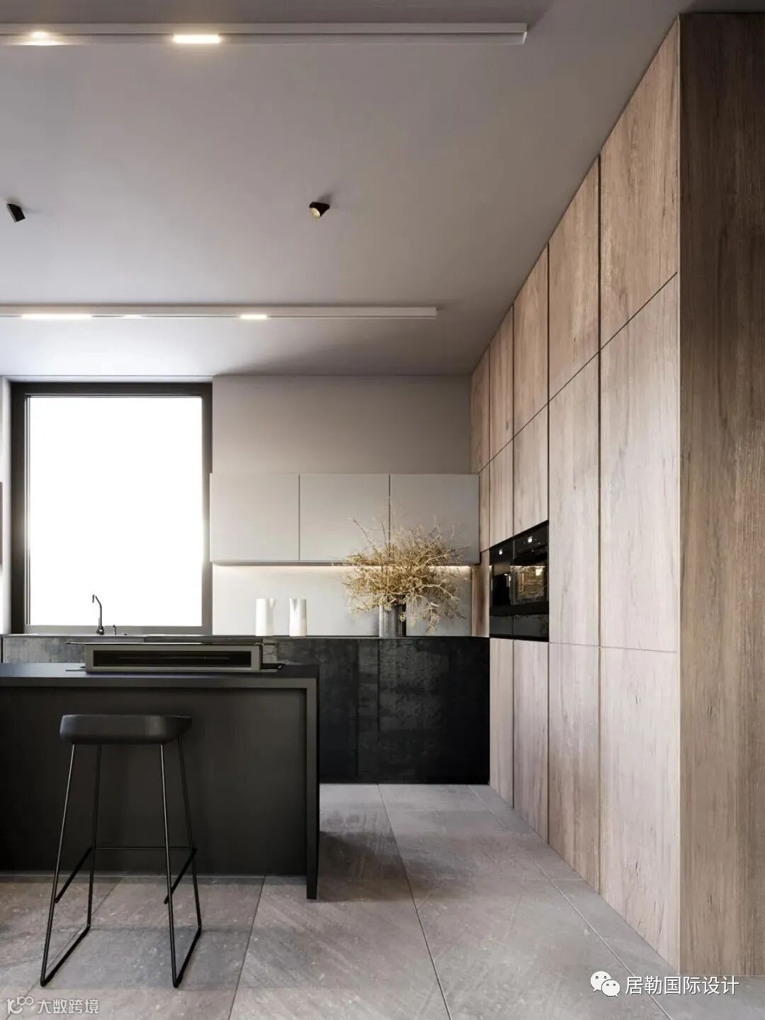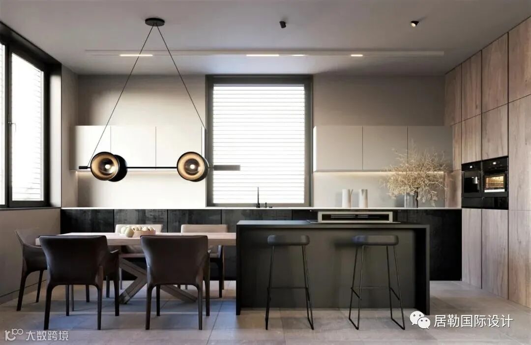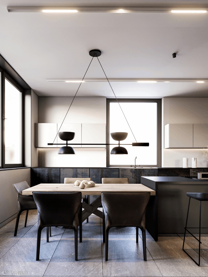 餐厨一休与客厅以大大的木质书架分隔开,黑色的厨柜黑色的岛台,木色的餐桌线条简单,餐椅出选择了黑色,灰色的大理石地板,边上以木色的背景墙,一盏艺术的吊灯,时尚有创意,整个空间简单却很时尚。