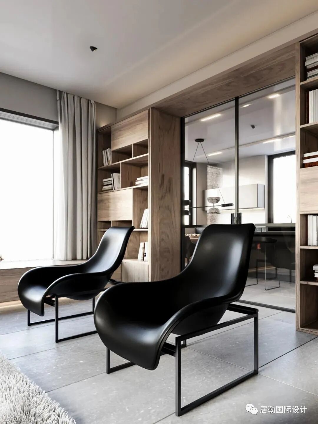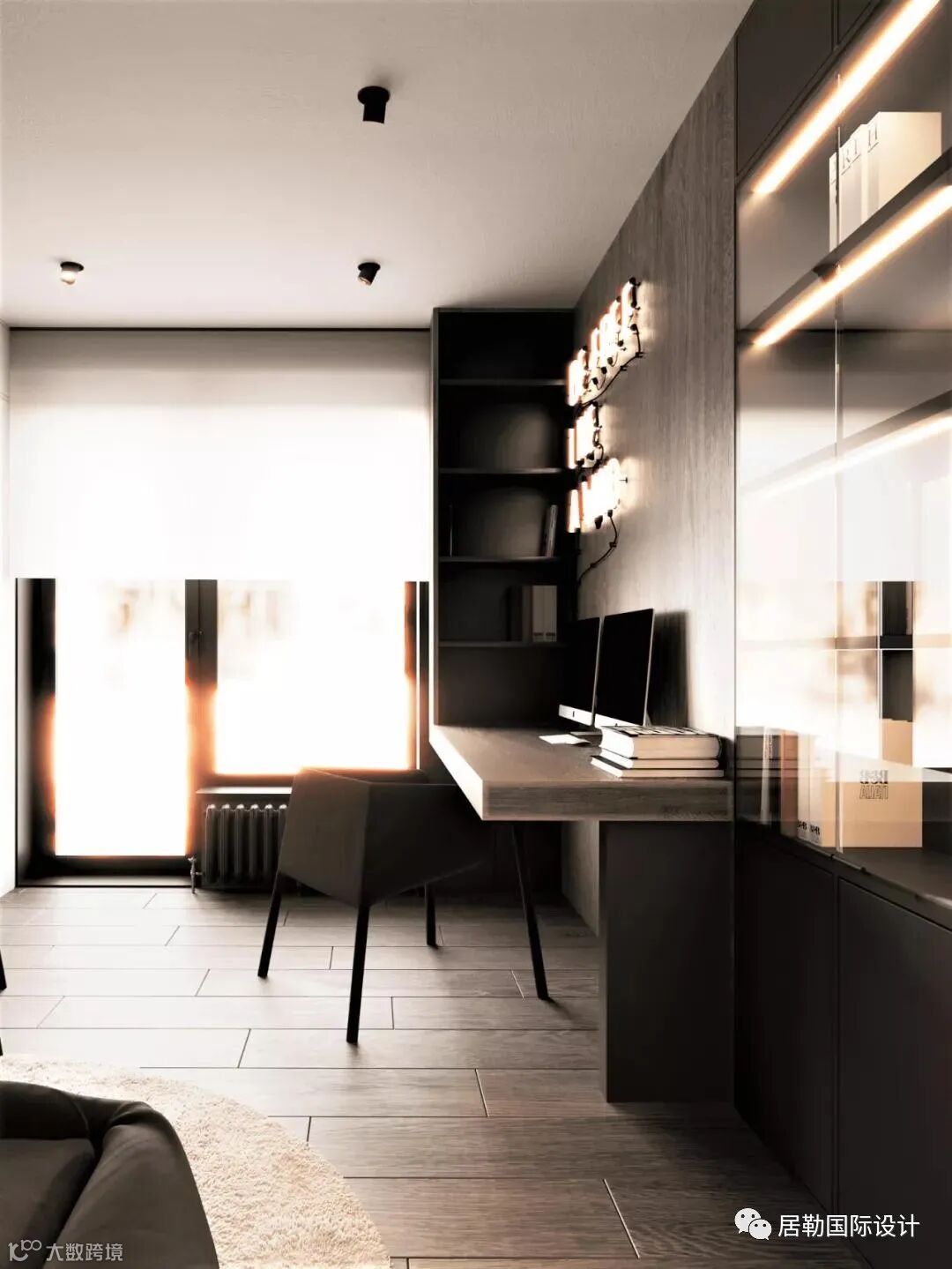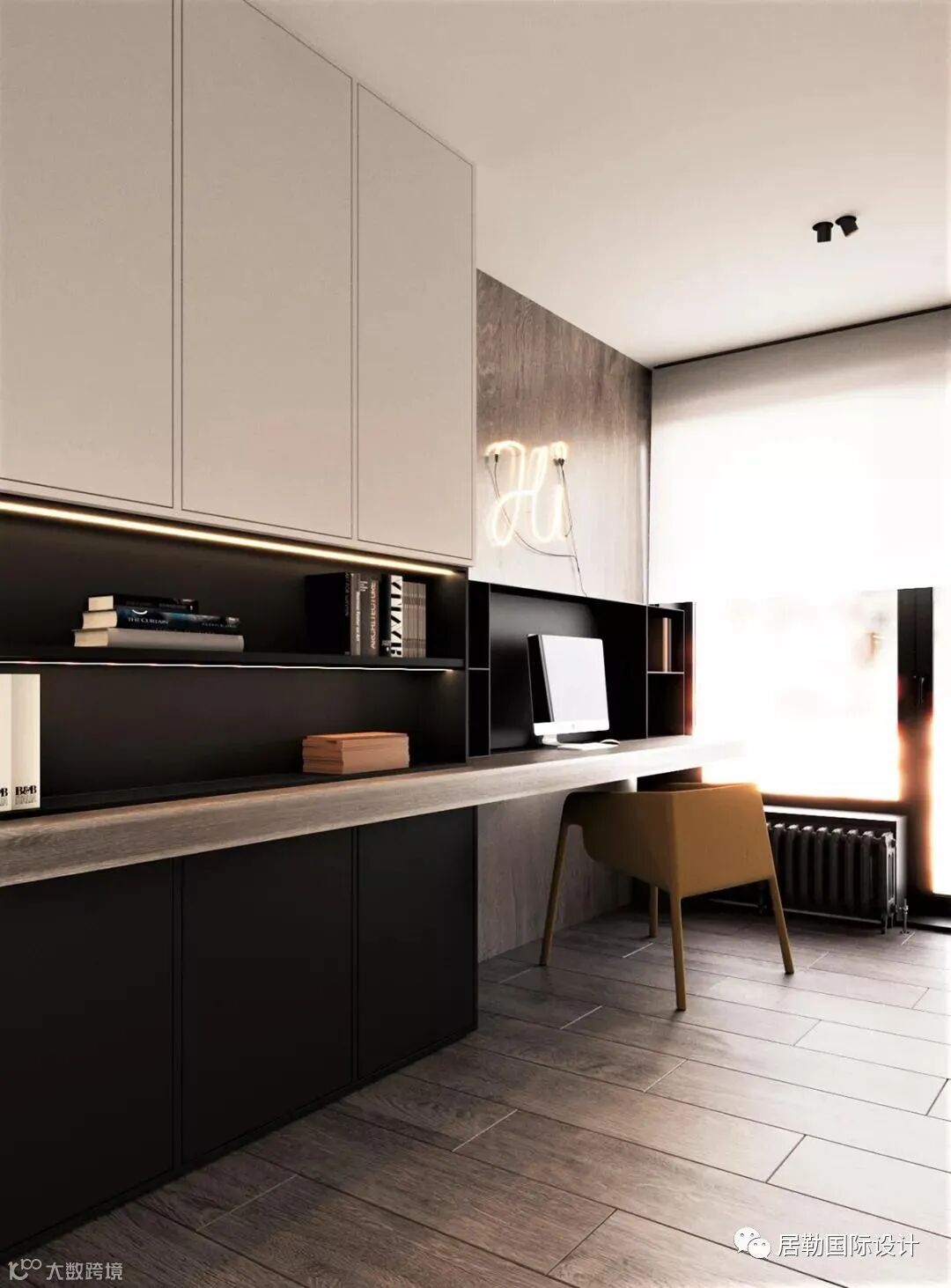 餐厨一休与客厅以大大的木质书架分隔开,黑色的厨柜黑色的岛台,木色的餐桌线条简单,餐椅出选择了黑色,灰色的大理石地板,边上以木色的背景墙,一盏艺术的吊灯,时尚有创意,整个空间简单却很时尚。