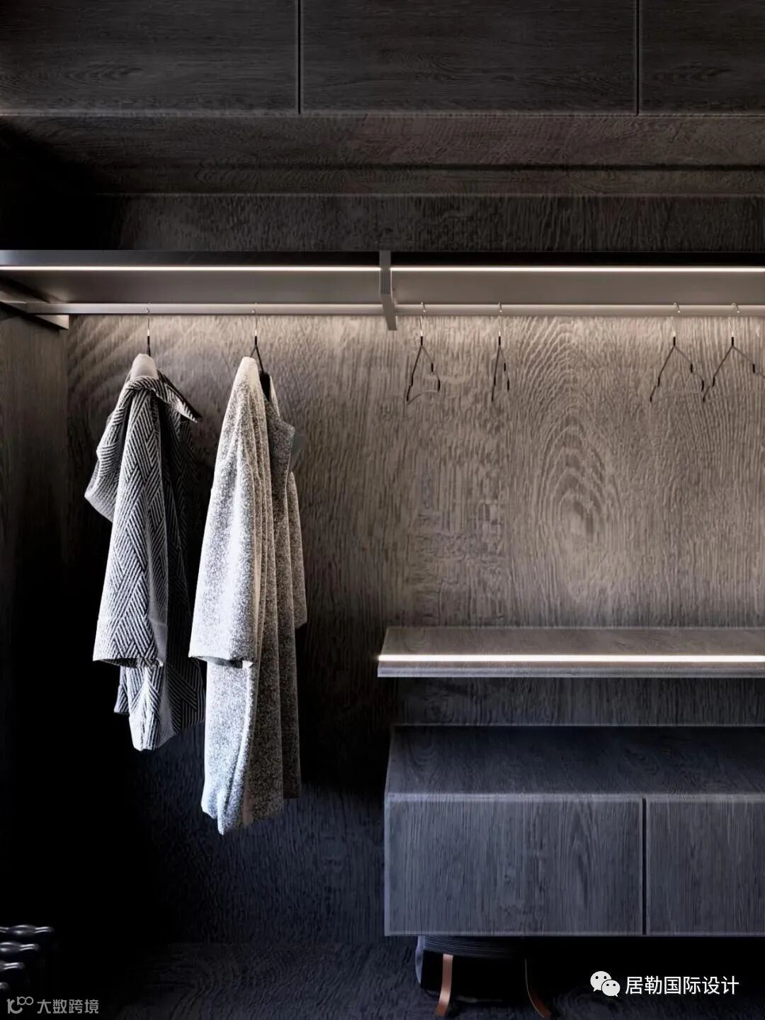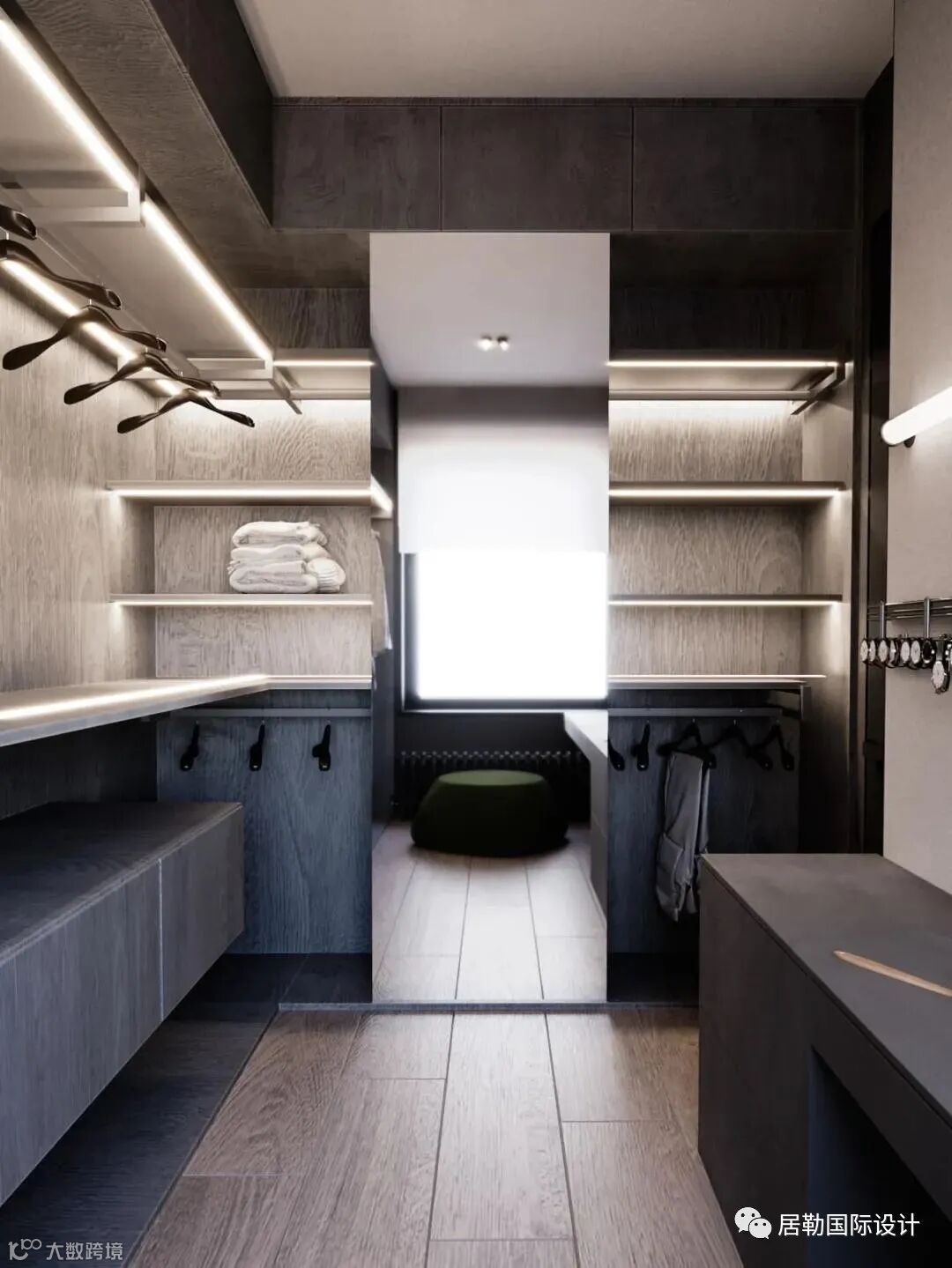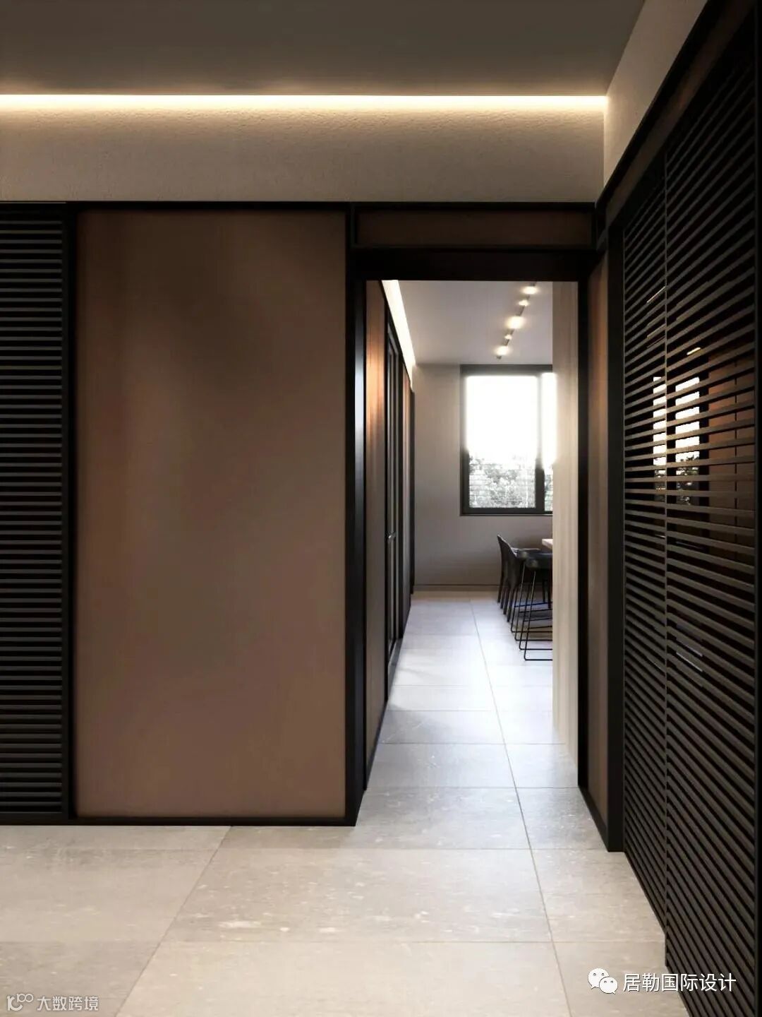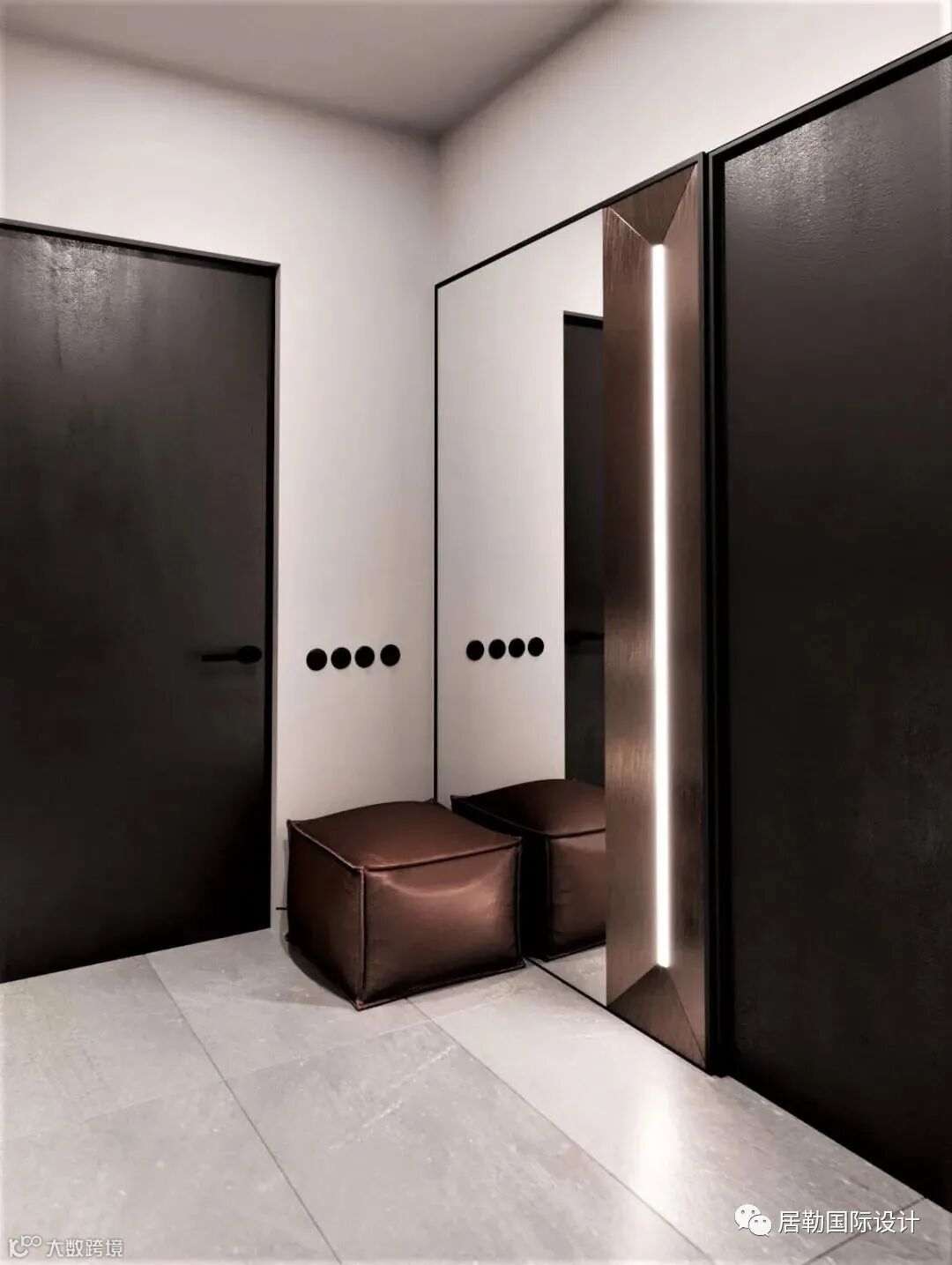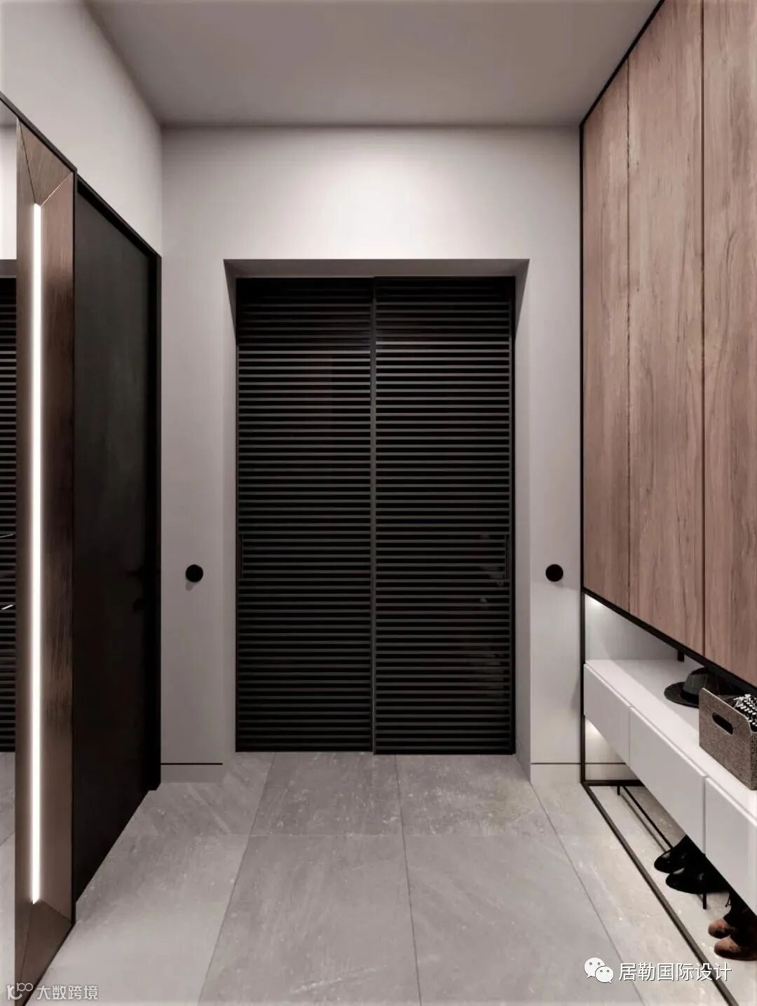 玄关设计延续了客厅的风格,低彩度基调,刚毅峻冷,简洁雅致,一进门看到这样的家居心情也会很舒畅。