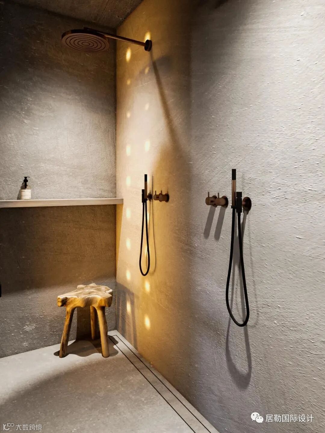 在一楼,有一个超现代、极其自然的淋浴间,配有一个巨大的石制盥洗盆。
