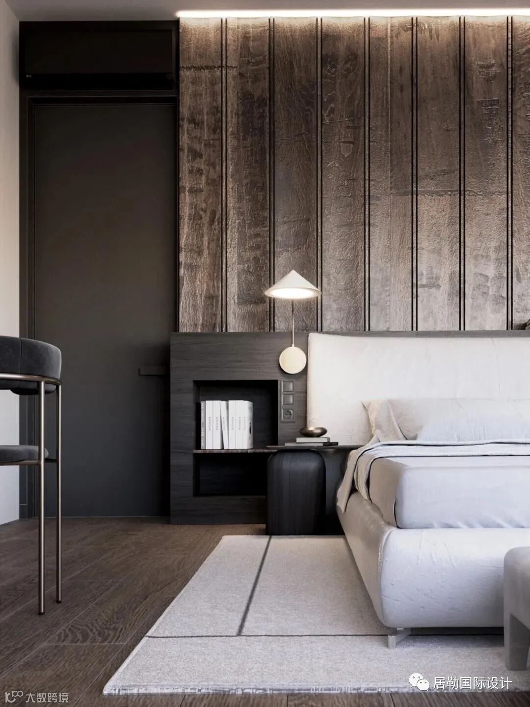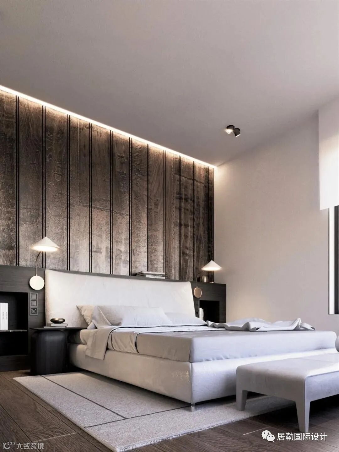 主卧,木色的地板,灰色墙面与灯带的搭配,很漂亮,床品是以灰色为主,十分的温柔,整个空间色彩搭配和客厅一样,体现着刚毅峻冷、简洁雅致的格调。