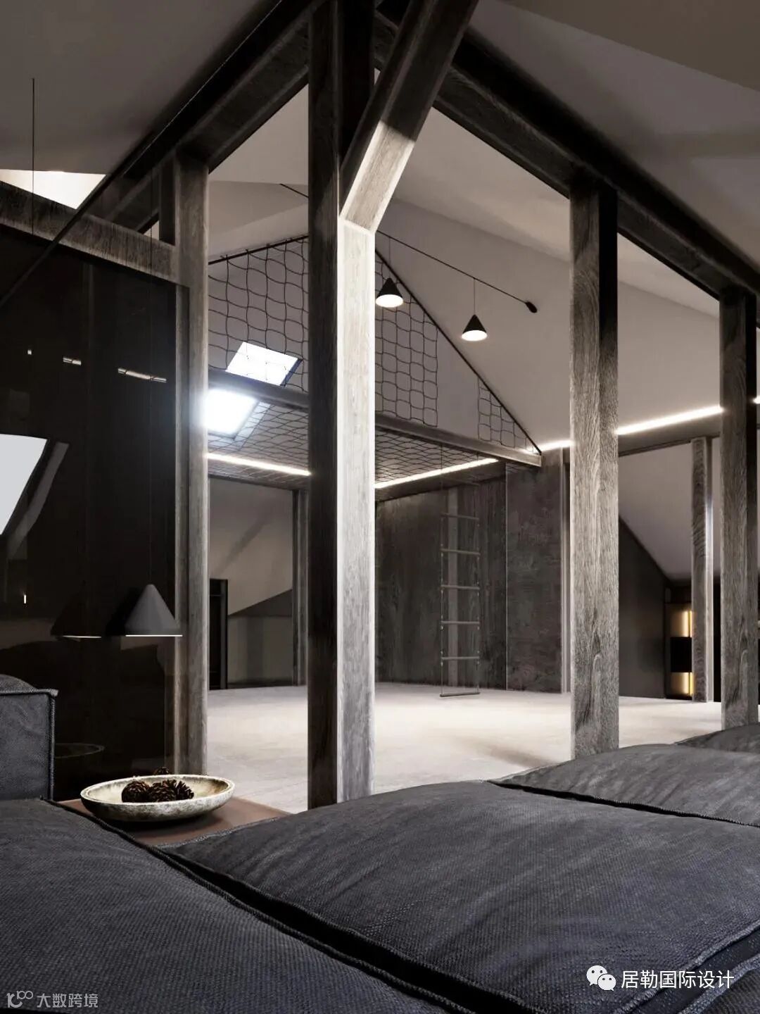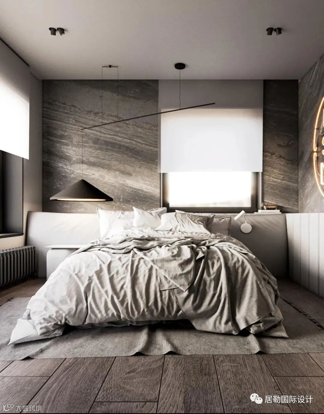 次卧同样以灰色为主调,其中黑色的吊灯很有个性,绿植点缀,床品同样是以灰色为主,十分柔和,将舒适与时尚相结合。
