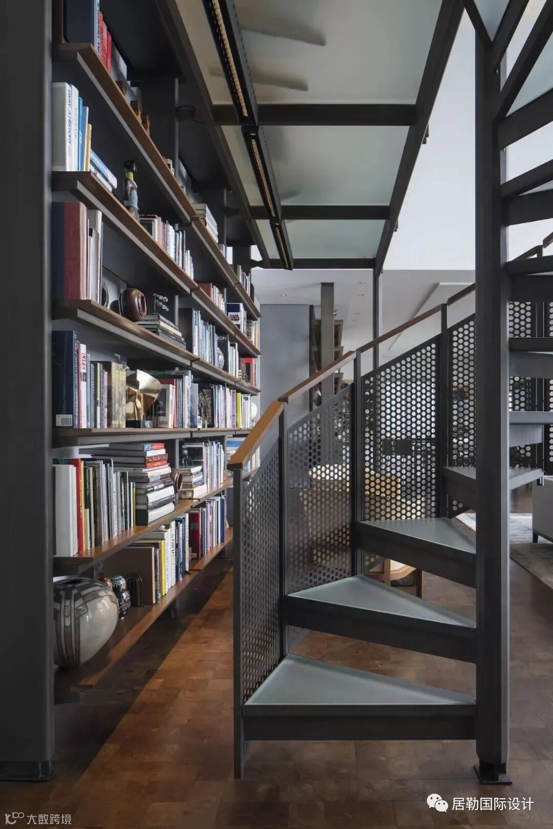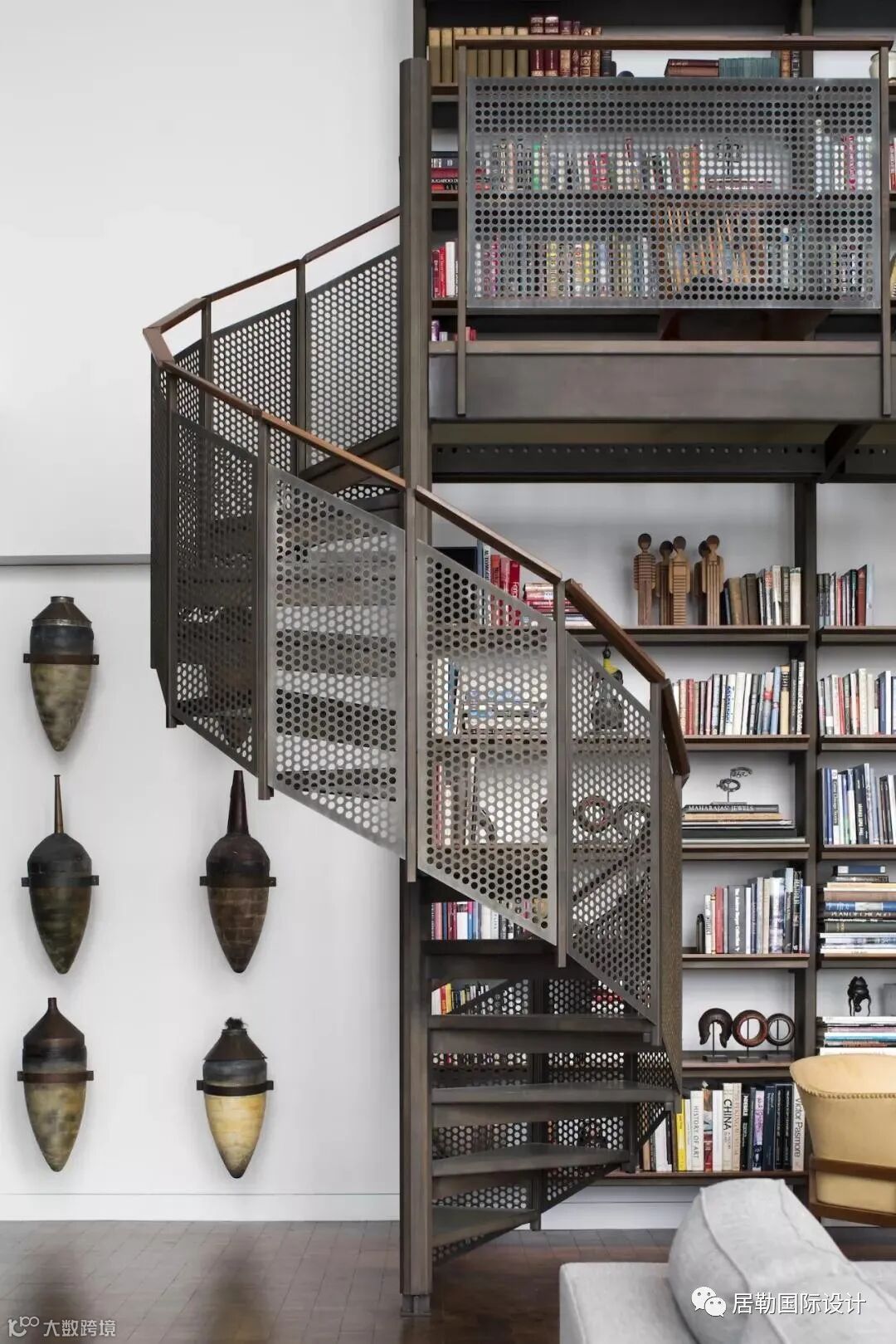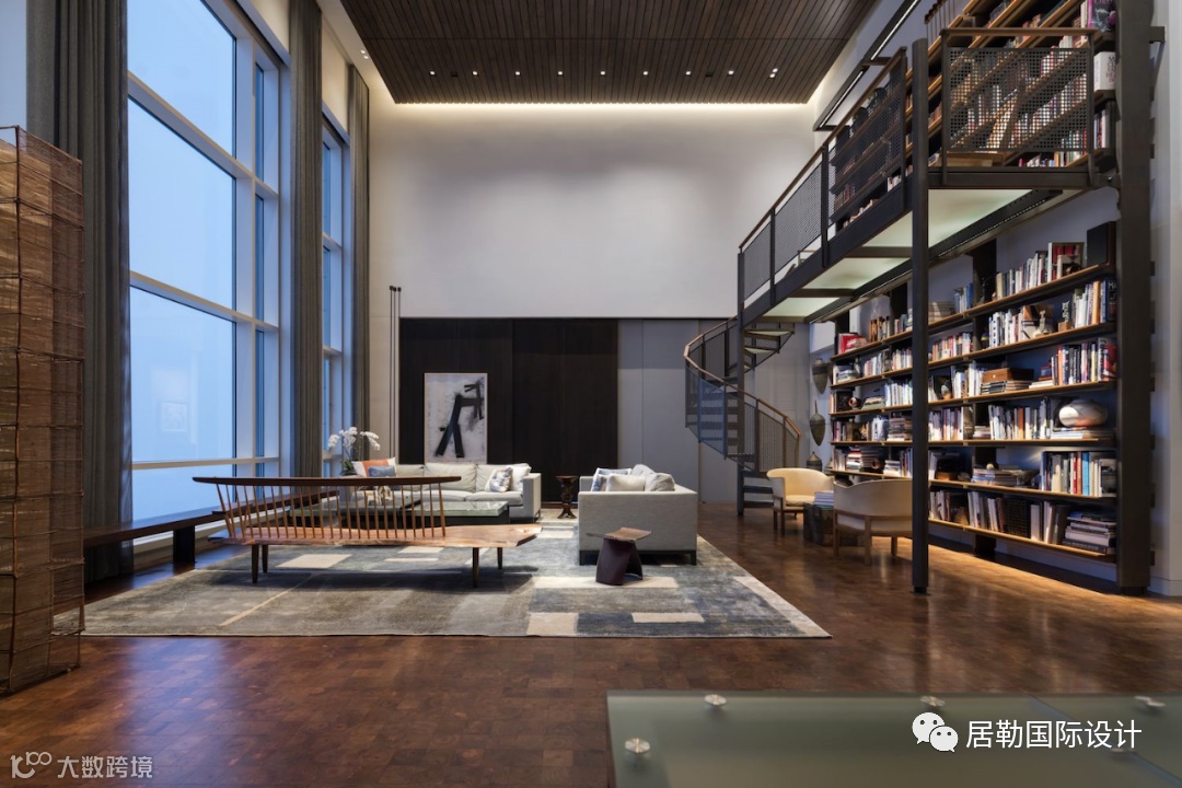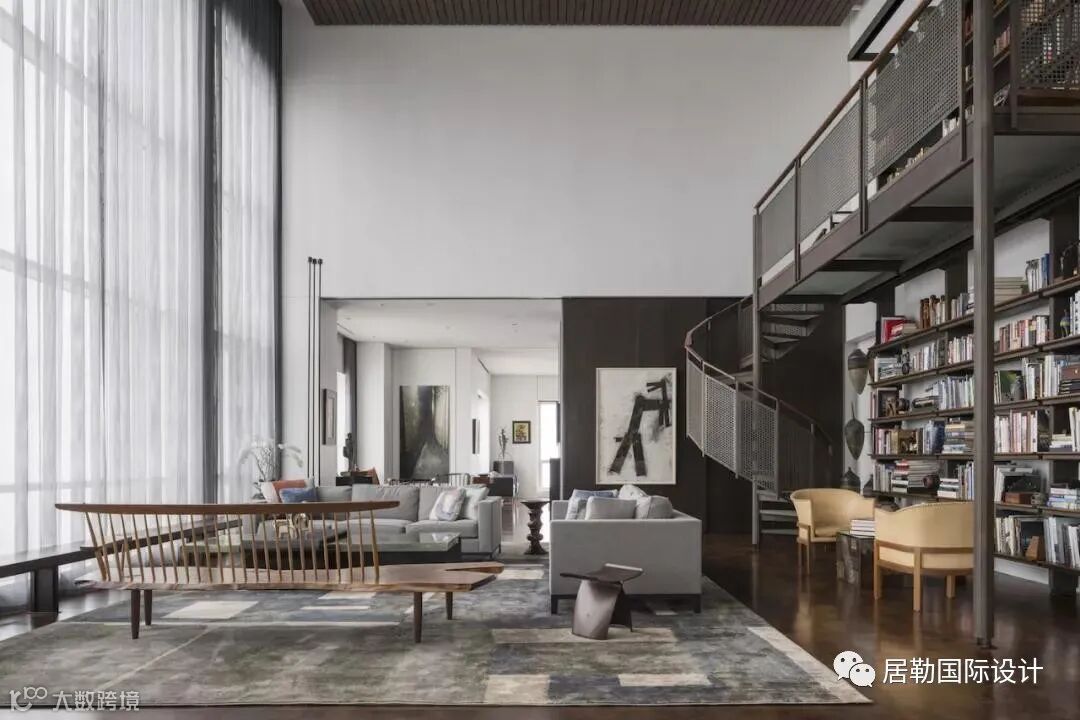 在客厅的沙发后方设有一个阅读区,大型的定制书架附带专用螺旋楼梯,远观朴实,近看精美。