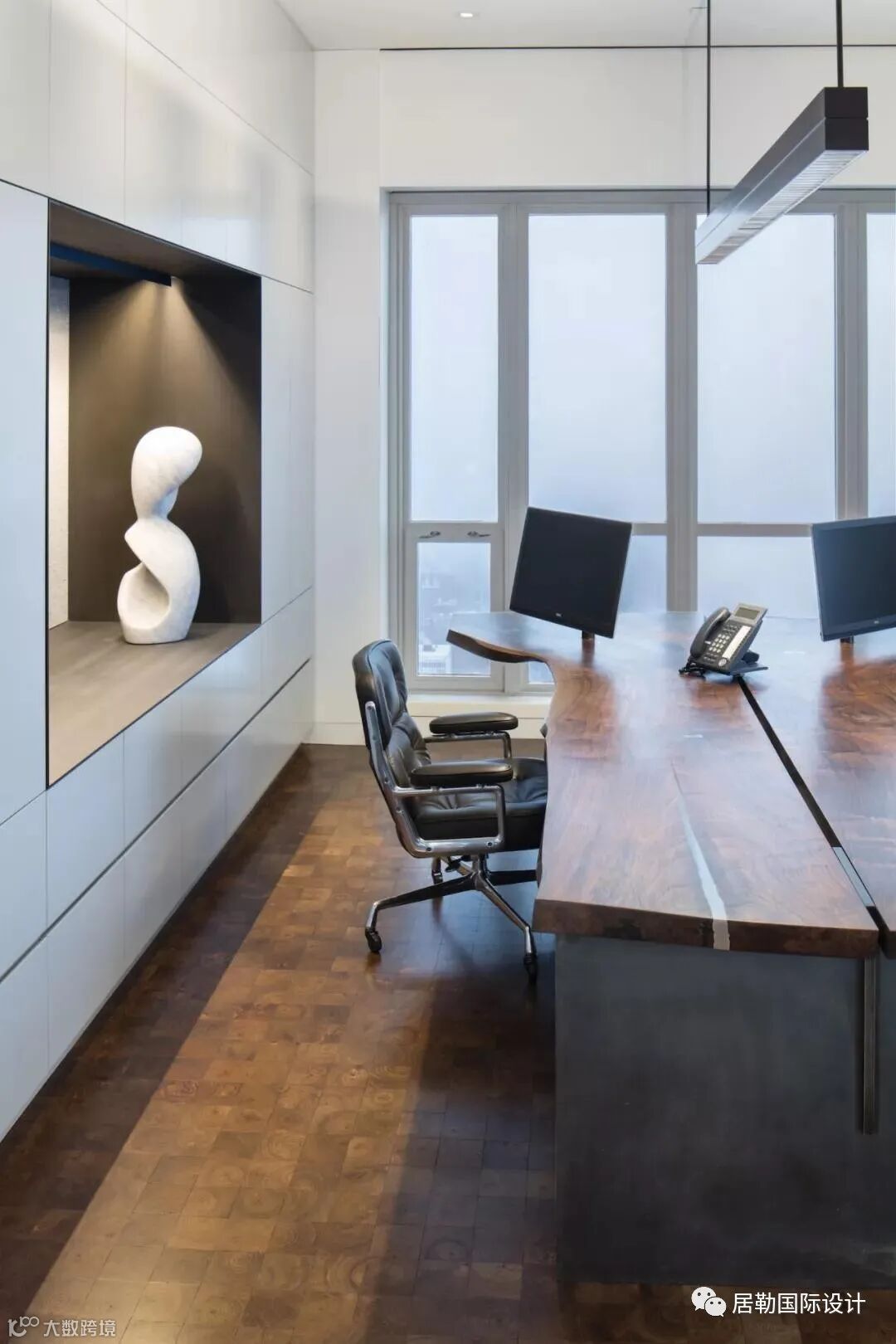 办公区的设计比较简单,天然造型的木质办公桌,搭配小方格木地板,上下呼应,画面和谐,呈现出另一种奢华气质。