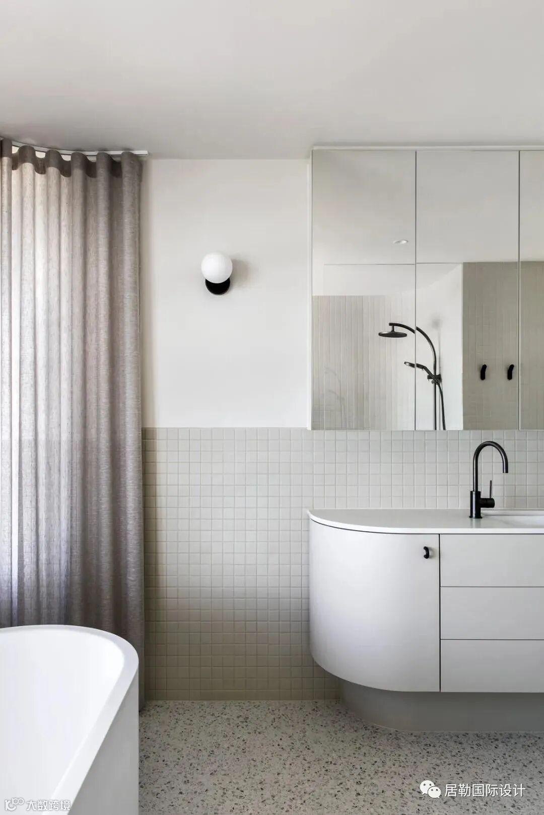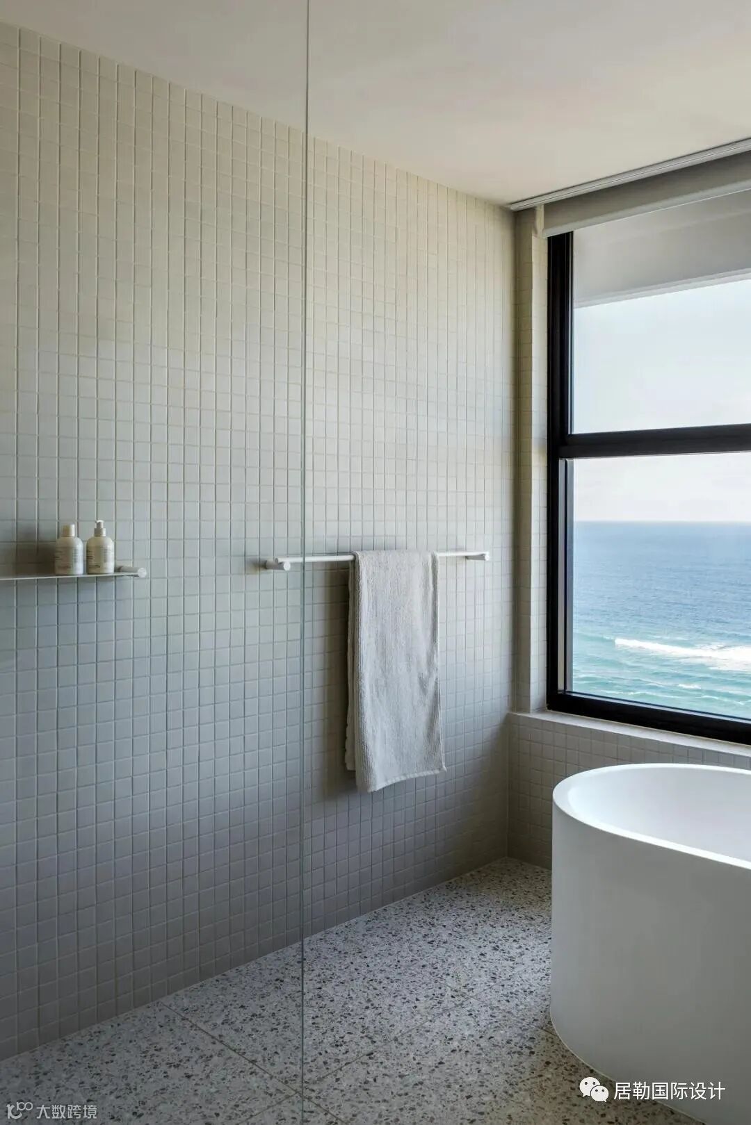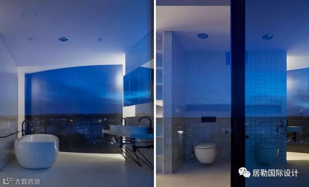 浴室中放置一个独立浴缸在可俯瞰海浪的宽大窗户旁,而另一个浴室里,沐浴间则用玻璃砖嵌入,与大厅的设计巧妙的联动在一起。
