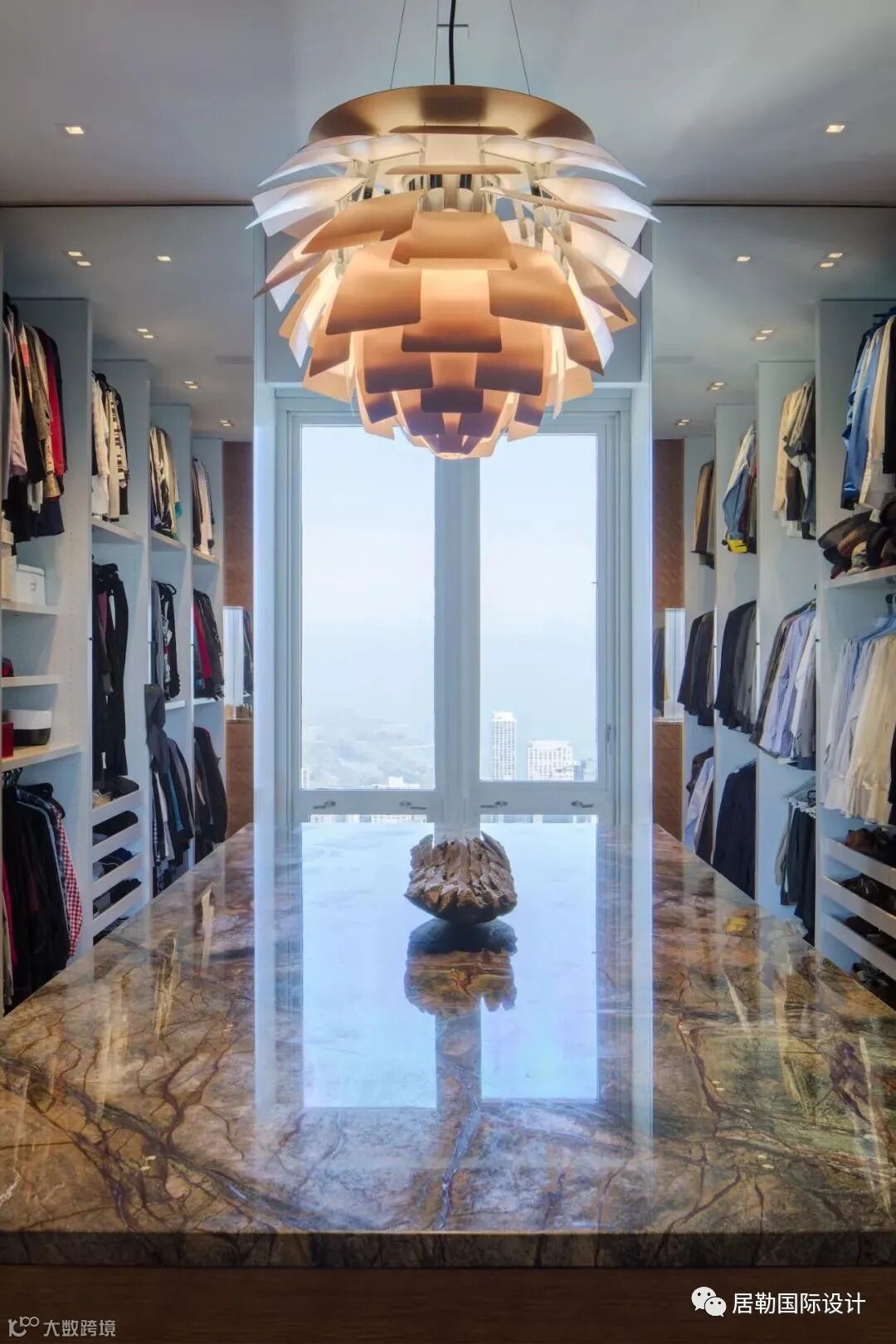 主卧的旁边是一个相当大的衣帽间,开放式的衣柜储物功能强大,能够存放更多衣物,中间还有一个首饰柜,顶部用一盏前卫的吊灯装饰,更显腔调。