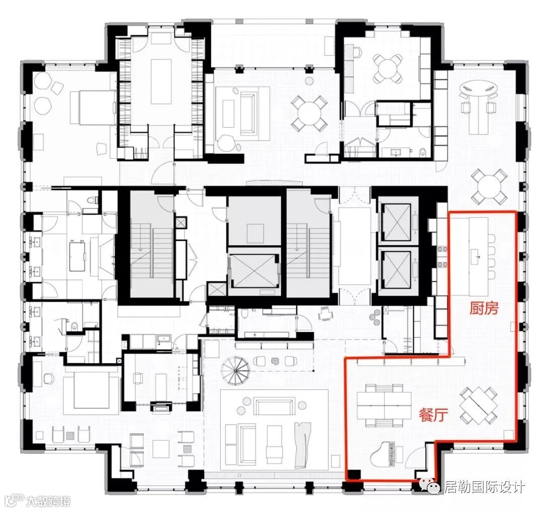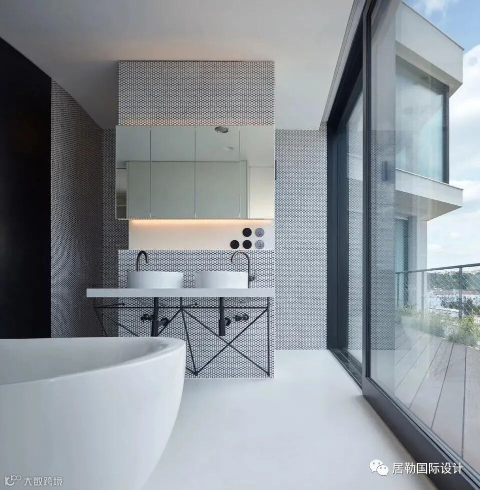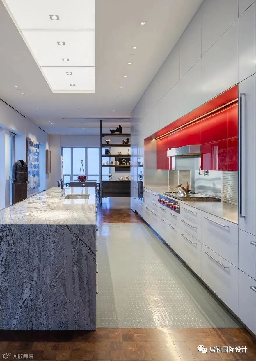 该顶层复式采用了双餐厅的设计,厨房品牌是德国著名的Bulthaup,卫浴则是意大利顶级品牌Boffi,产品设计出自设计大师Piero Lissoni之手。
