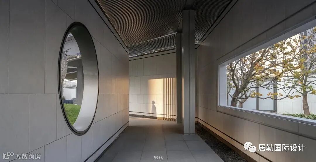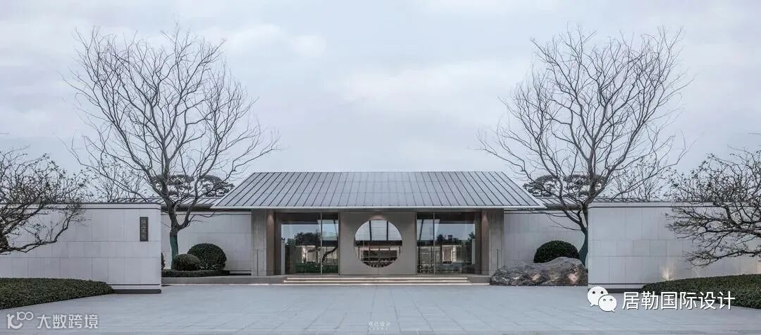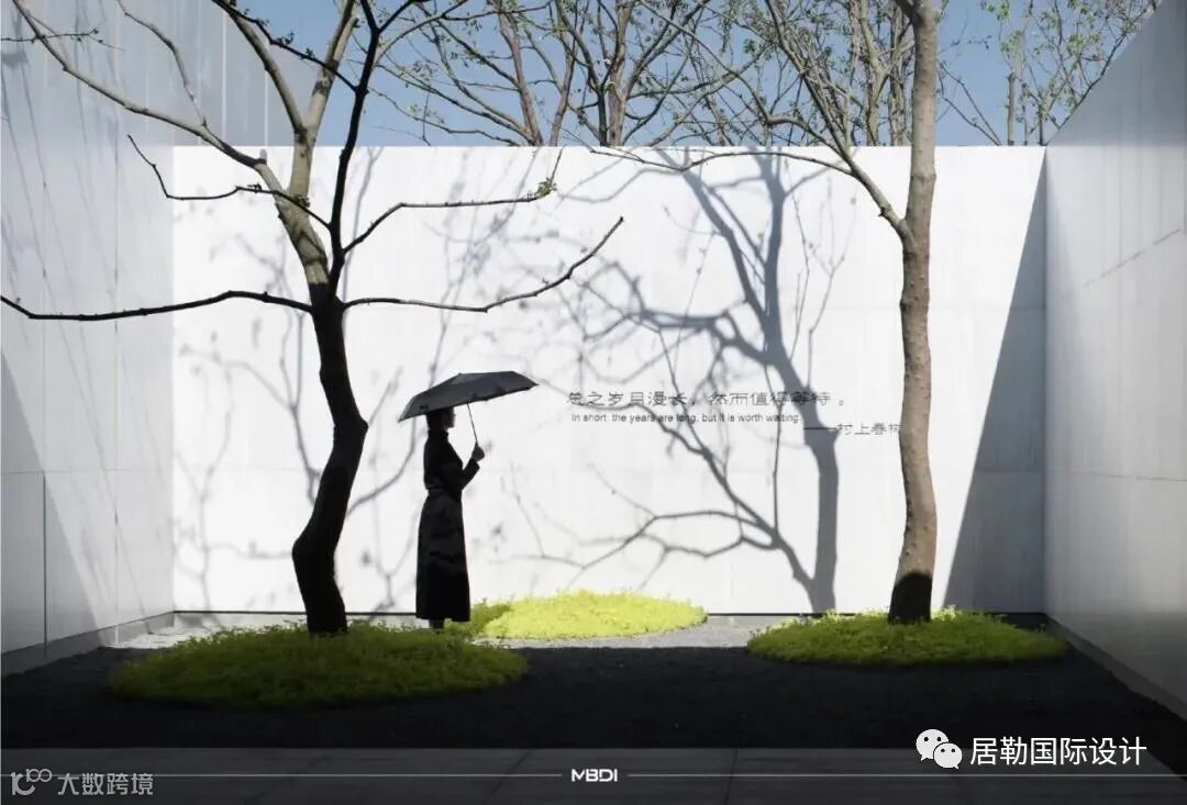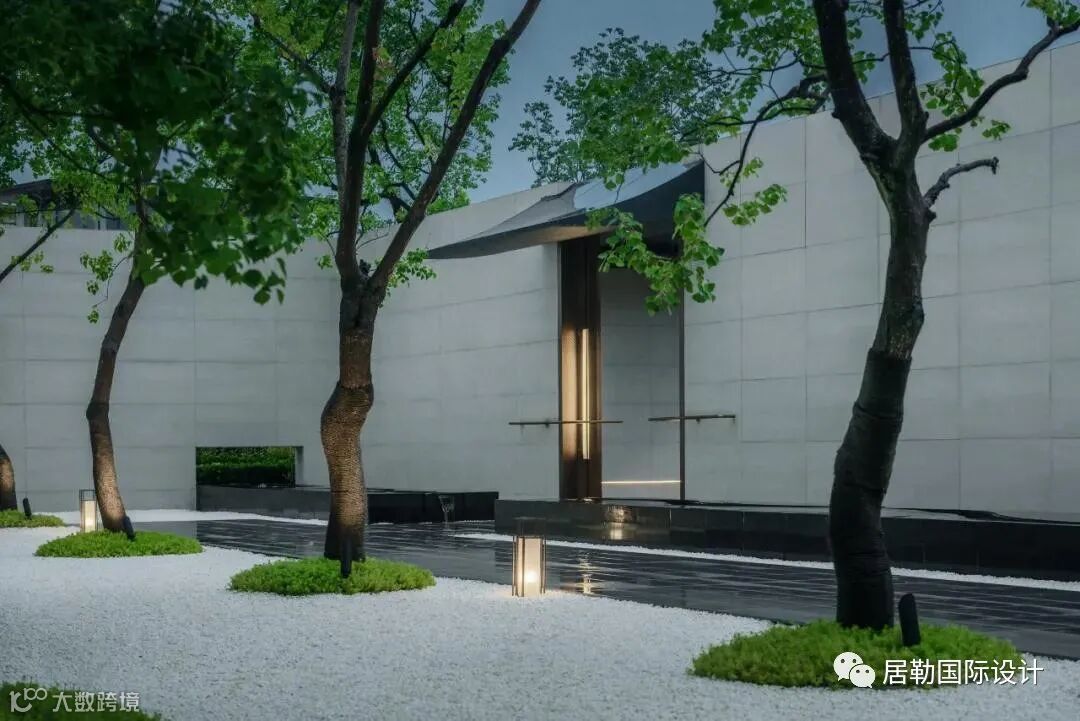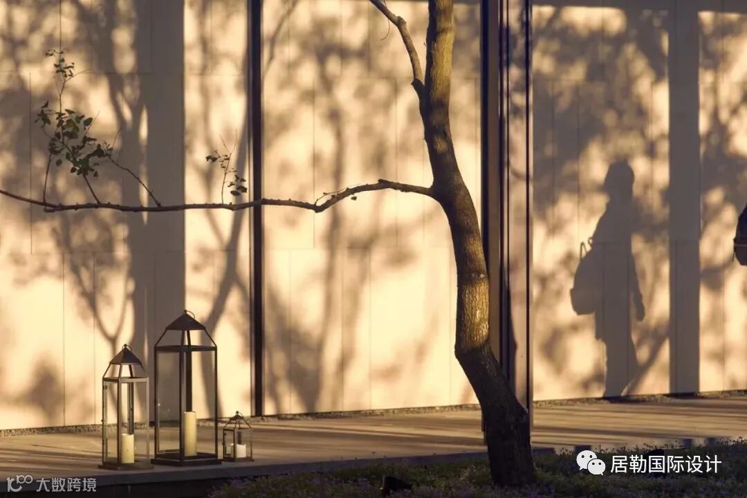 干净的墙面围合,如同丝帛一样展开,呈现出极强的开放性和视觉舒朗感。两侧的乌桕婀娜多姿,就像身形曼妙的侍者,以合适的距离,树荫交错,恬静而悠然。