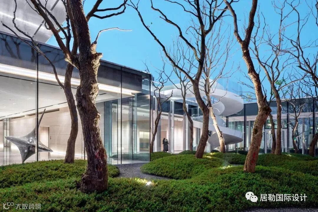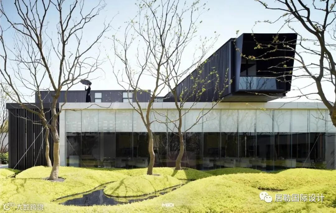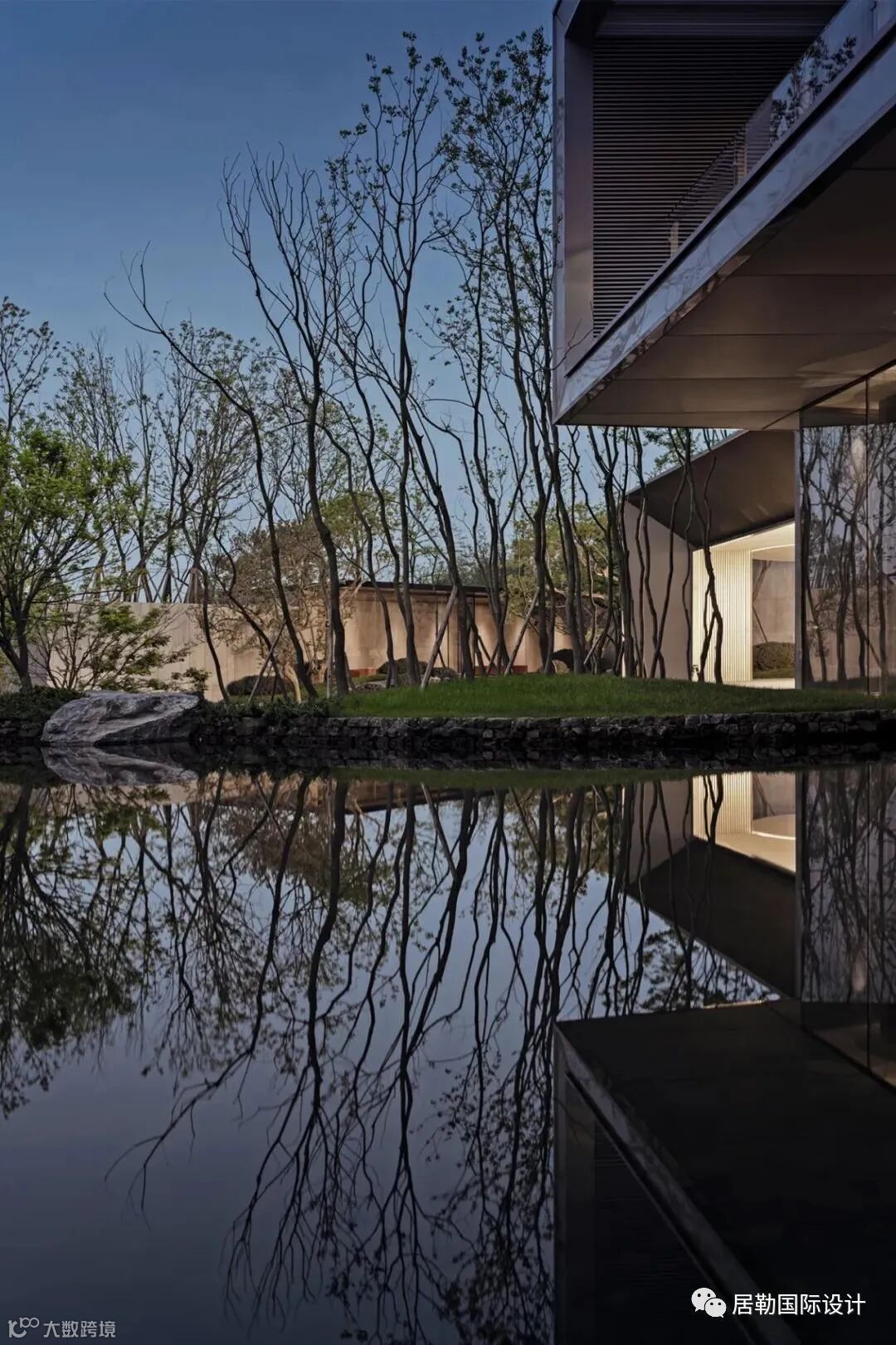 沿着此处台阶而上,一片简约的现代建筑群掩映在乌桕树林后边。建筑金属与玻璃的体块光影交错,并倒影在眼前的一湾湖水之中。乌桕摇曳,百转千回,追本溯源。洞穴尽头,山河、瀑布赫然在目,也许这就是我们寻找到的回归自然的理想生活。