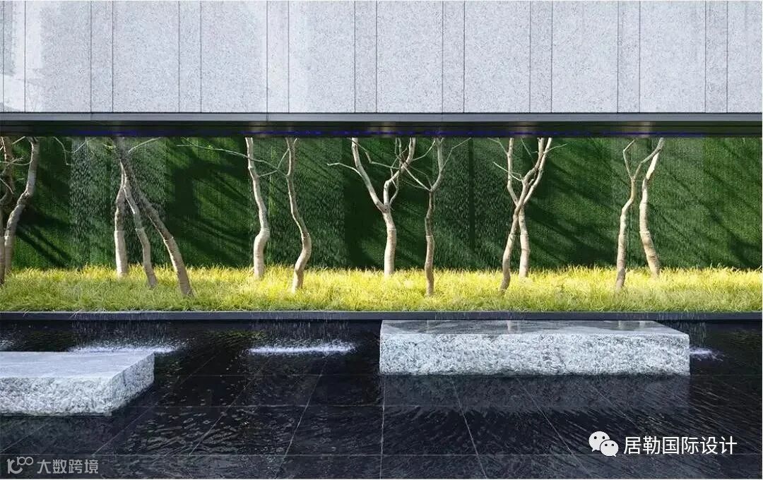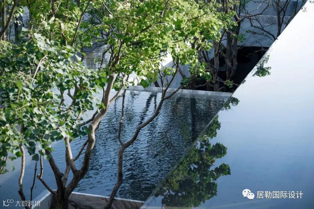 “水苑”空间丰富,设计师初想访客经过水苑之时,必先看到乌桕穿出三层水面,乌桕树影配合流光溢彩,使得水幕生动有趣。