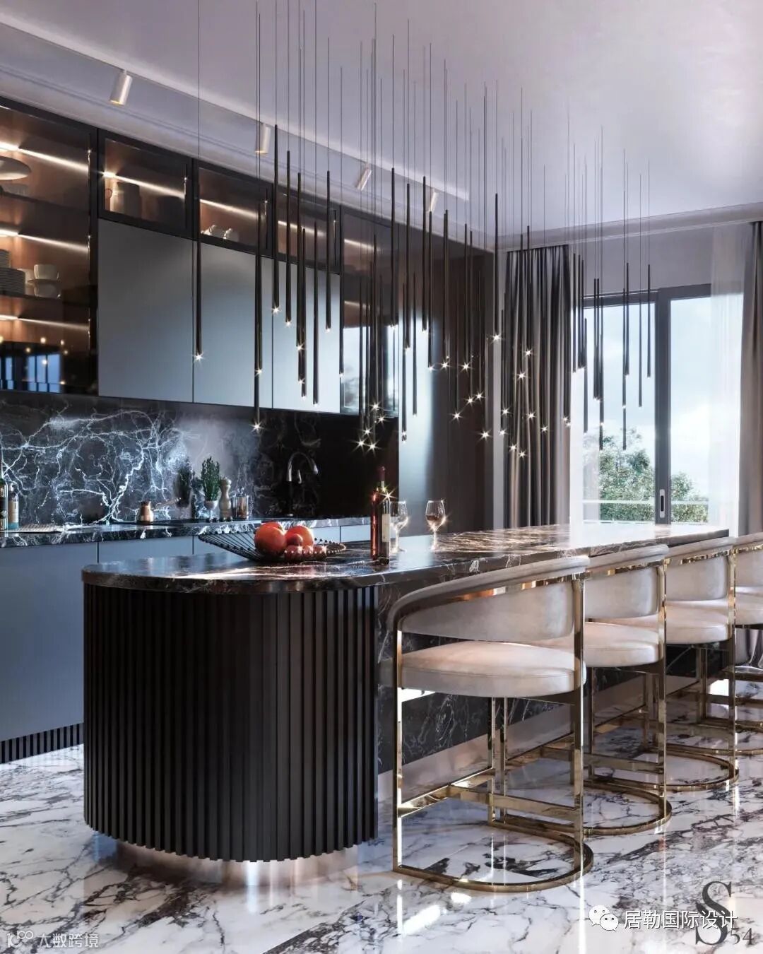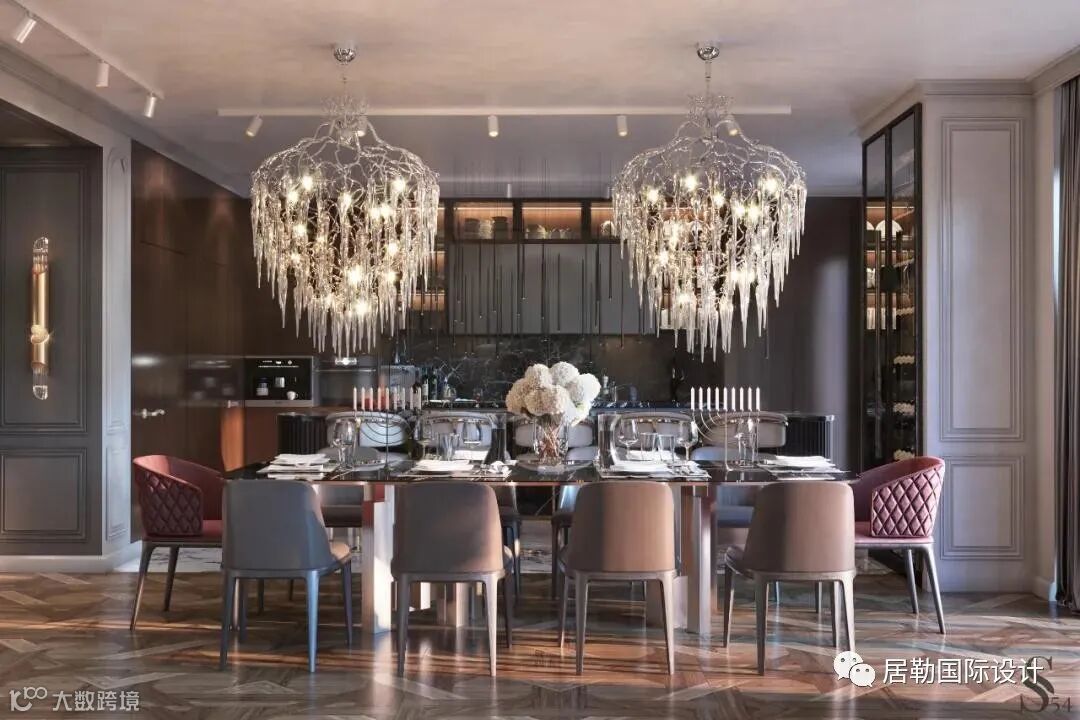 法国巴黎的230㎡的新项目,豪华Catellan Italia 餐桌,Brand van Egmond大吊灯。餐桌后面是厨房岛台,岛台顶部采用黑色大理石装饰,厨房后挡板的设计也采用了黑色大理石,营造出空间的整体性。