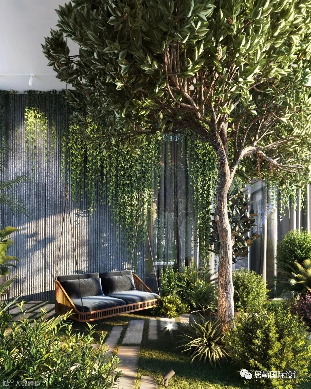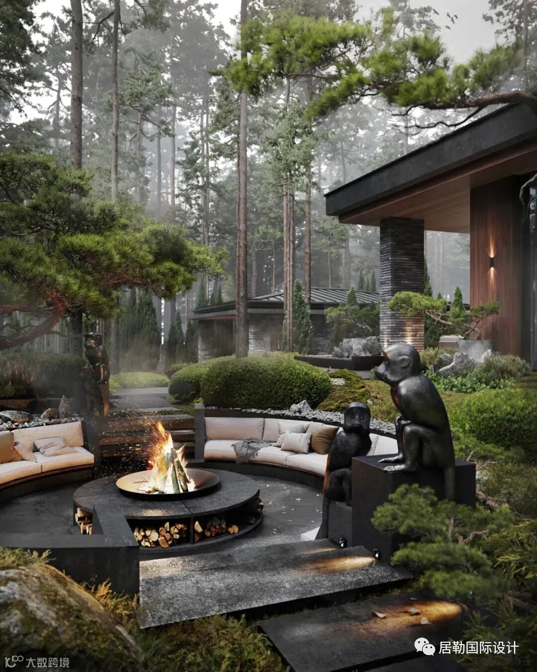 有三个大型户外休息区:一个带壁炉的圆形休息区,带餐桌的大露台,精致的灰色调沙发和电视区,以及带秋千的僻静凉亭。这里的生活与繁华的大都市完全相反:它只有自然、空气、放松。