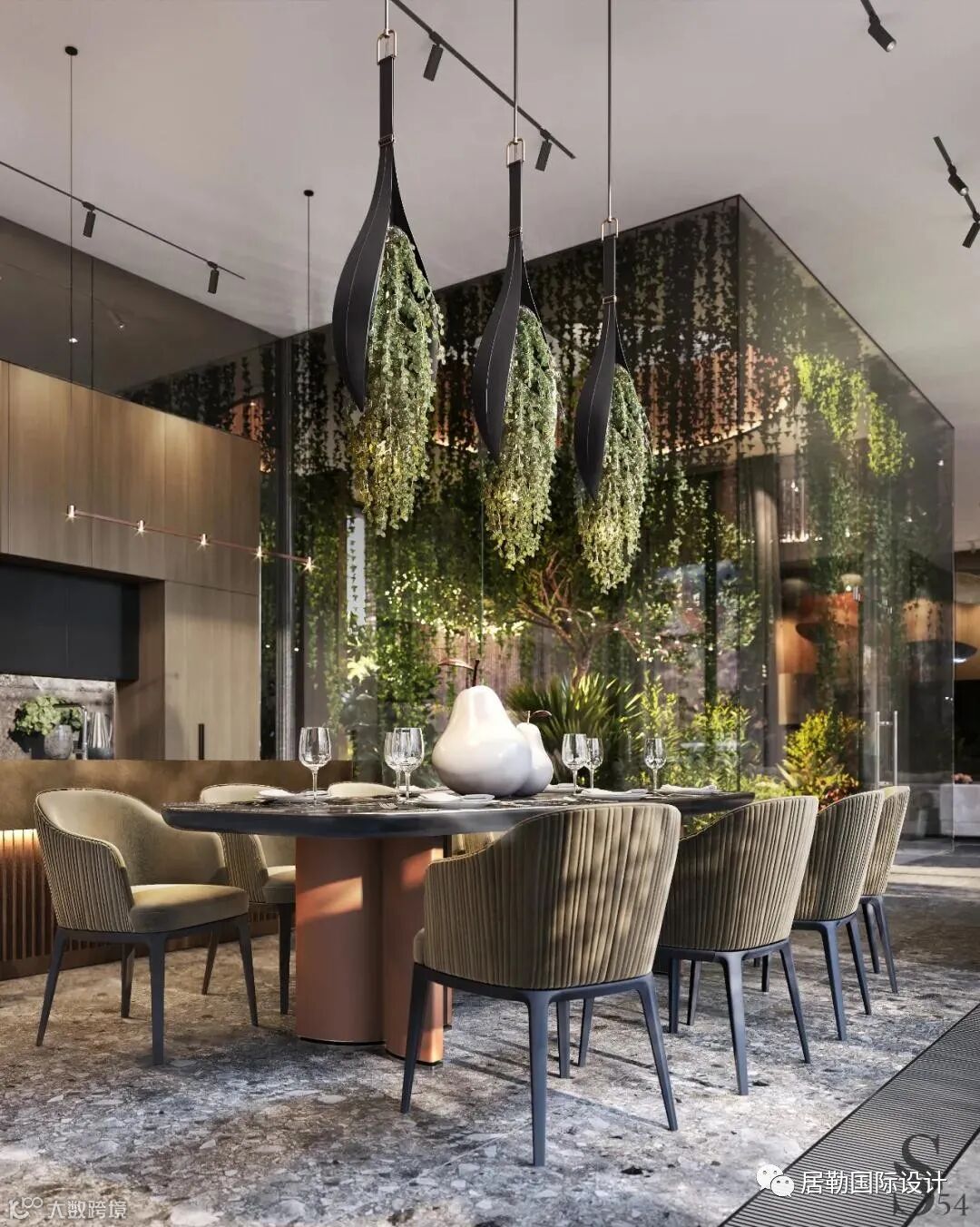 用餐区位于玻璃温室和主客厅旁边,大自然的所有元素都为业主提供舒适服务:植物图案和色调、天然环保材料营造出完整的形象。雕塑基座上餐桌的原始形状使其成为餐厅的主要装饰,吊灯作为额外的表现力,与冬季花园相协调。