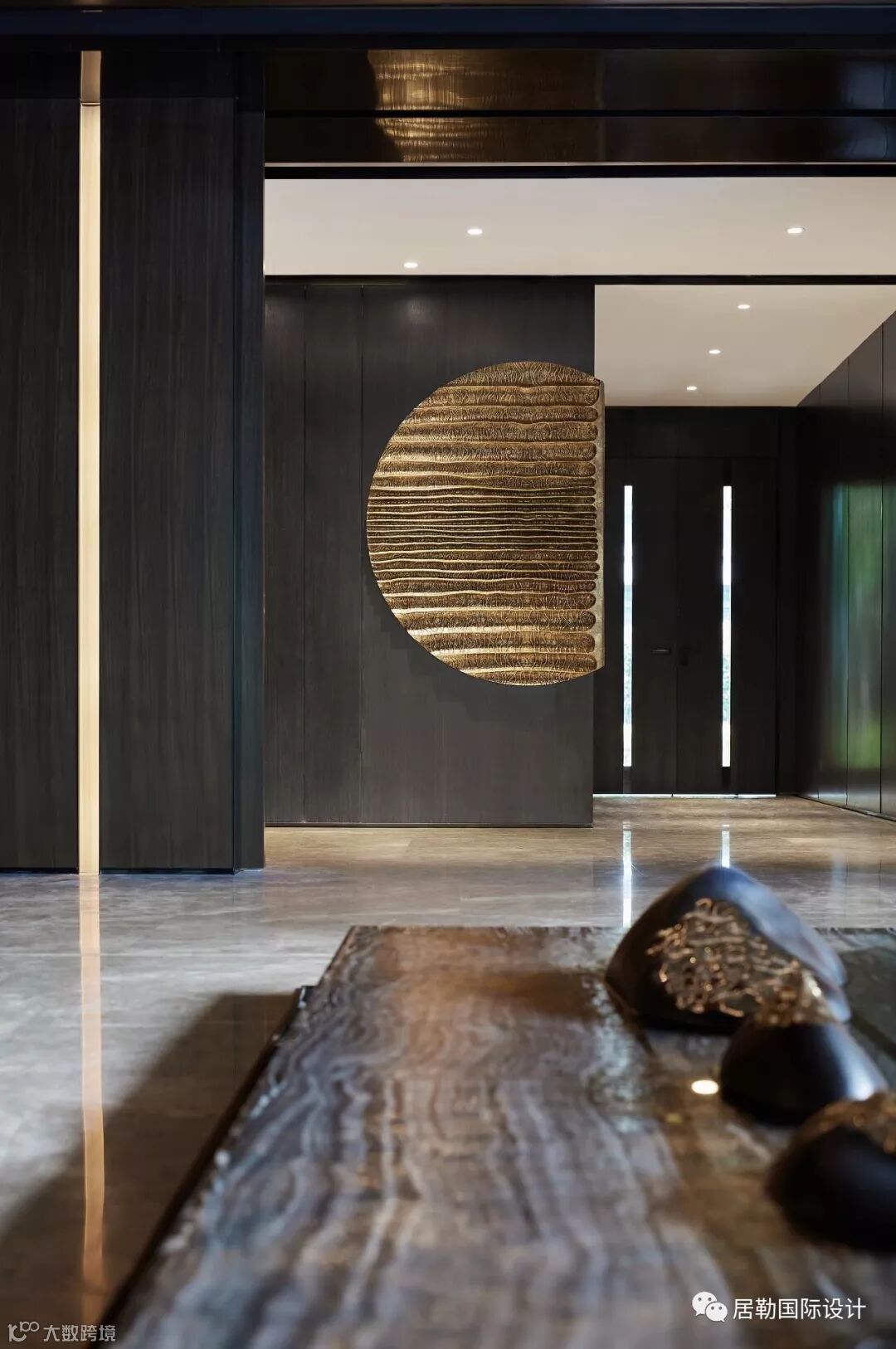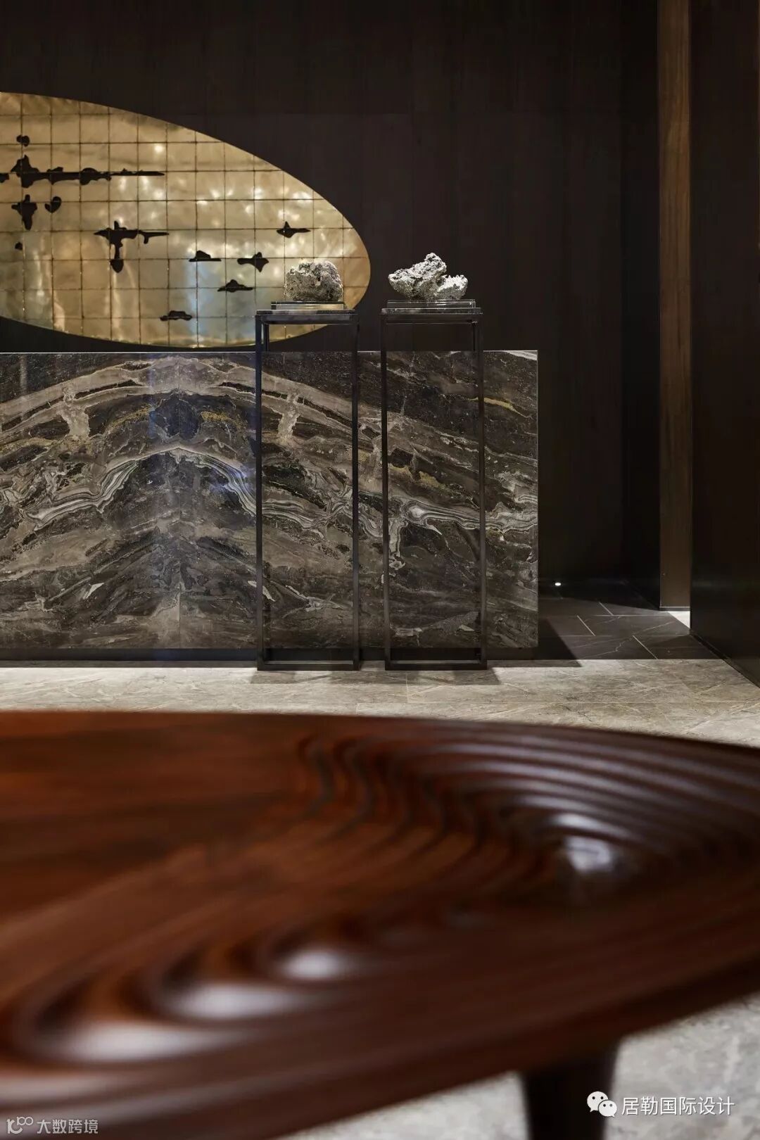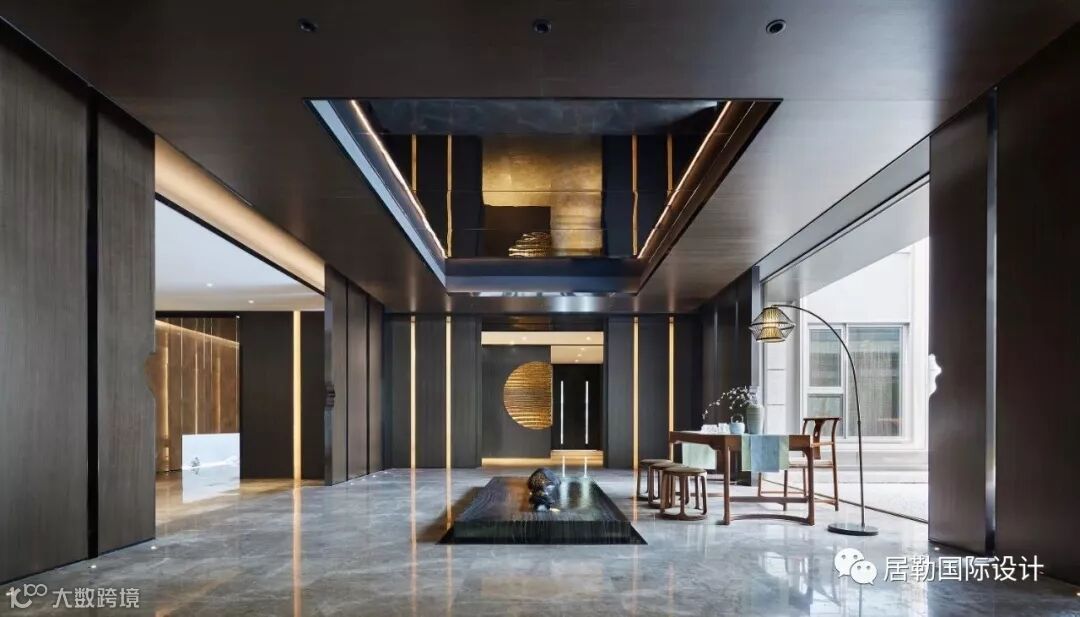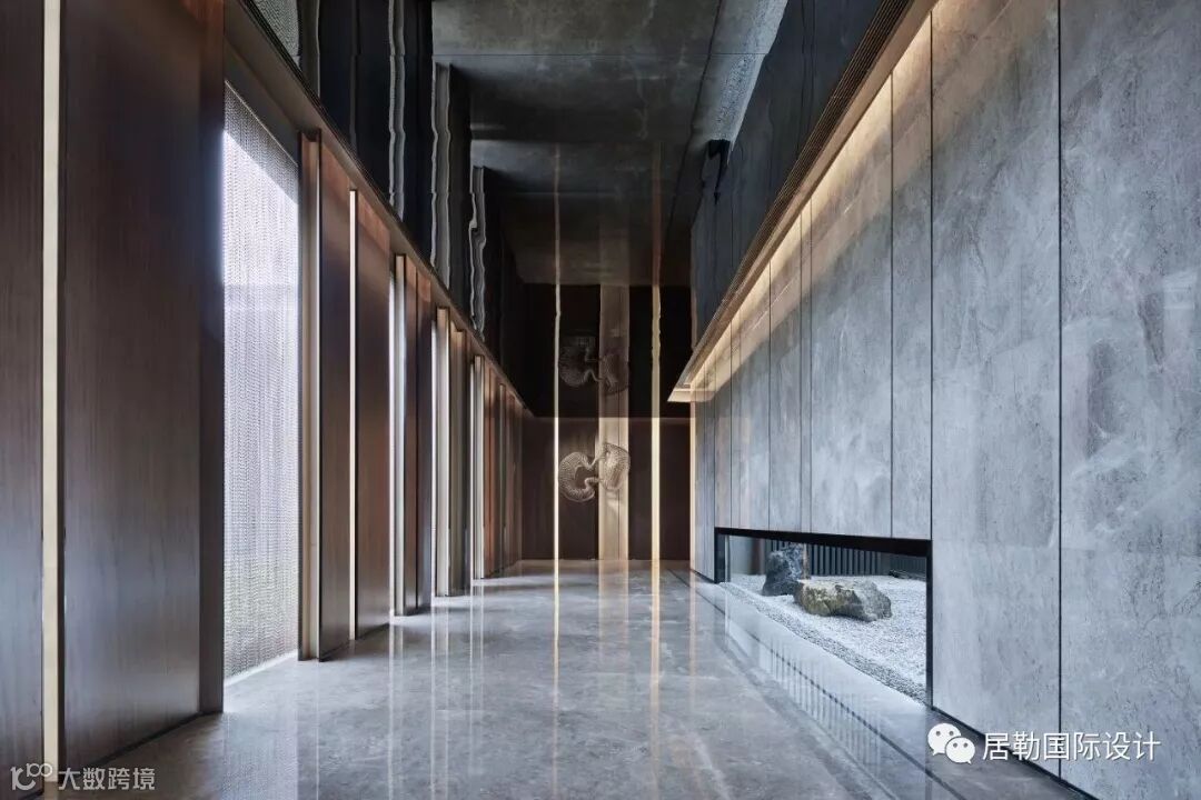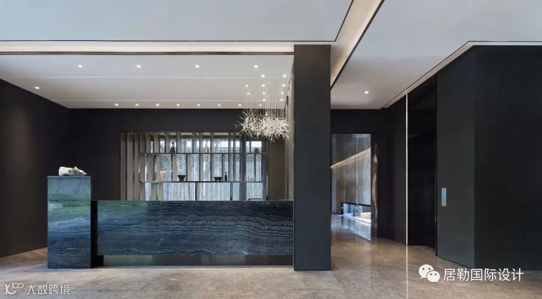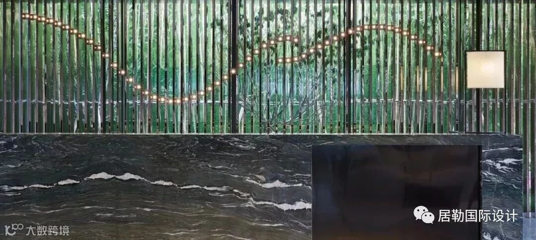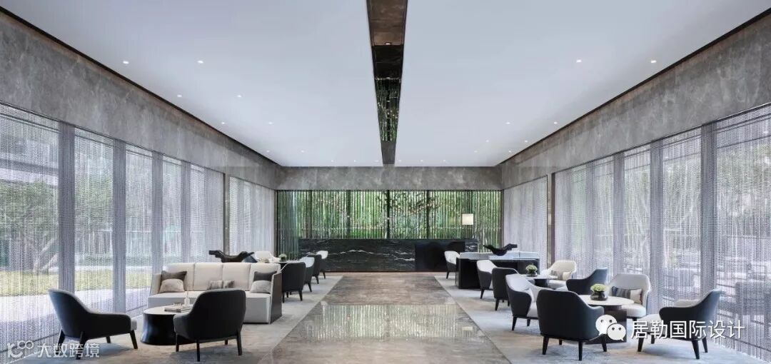 中庭的大理石装置反射在天花的玻璃上,利用视觉的交错模仿户外潺潺流水的景象。自然韵律与现代设计手法结合,令空间中更富灵动。