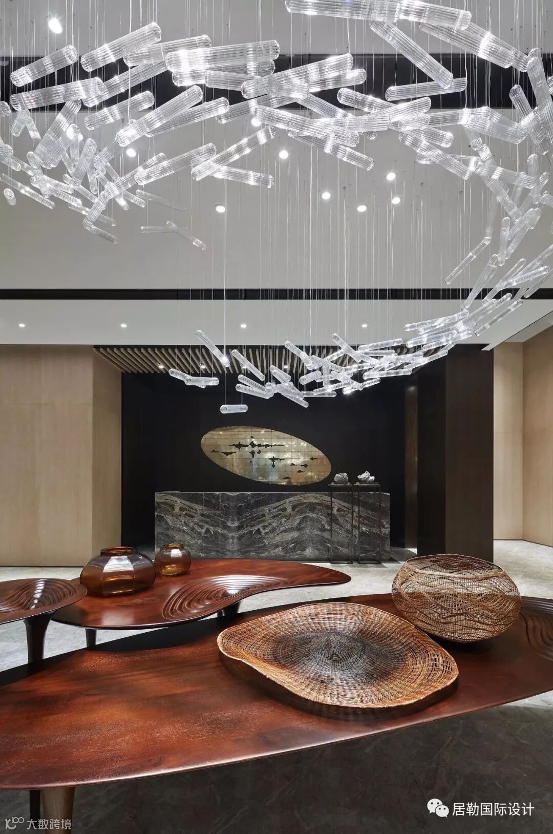 转眼地下空间,功能的分布更加的紧密。大厅的为开放式的洽谈空间,螺旋式的吊灯盘旋其中,联动整个空间,不规则的红木桌子,凹凸起伏。