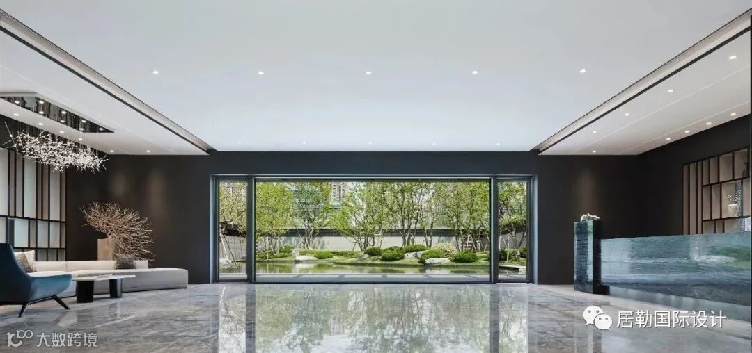 首层的接待大厅,以简约的设计去衬托户外园林的景色,大堂内一个全透明的画框,让户外的景色展露无疑,像是原本就在空间中的画卷一般无缝结合。大厅区域一个接待台和一个休息区,简单的组合为后面的精彩做个铺垫。