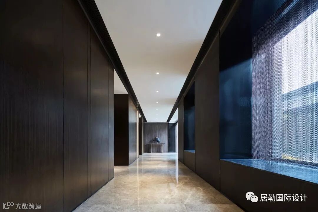 以不同的艺术品作为空间切换的连接点,在一层大堂走道的每个转角处都会放置一个艺术装饰,走廊两侧一面是木纹的屏风隔断,另一侧是可看到中庭景观的大理石墙面,层层叠进。