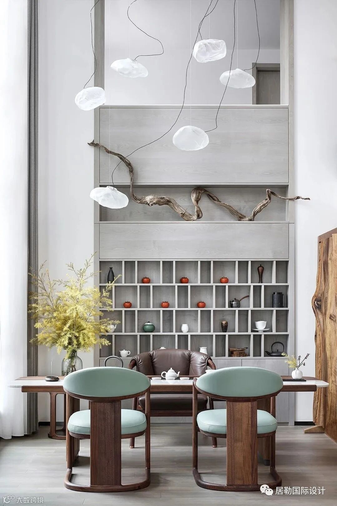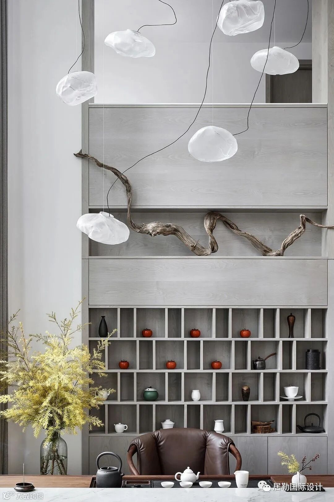 挑高的茶室,依势设景,置入设计师个人收藏多年的崖柏,苍劲飘逸,鬼斧神工,与整个空间浑然天成。云朵造型的Bocci吊灯,溢出枝桠,轻盈空灵,仿若置身云端。