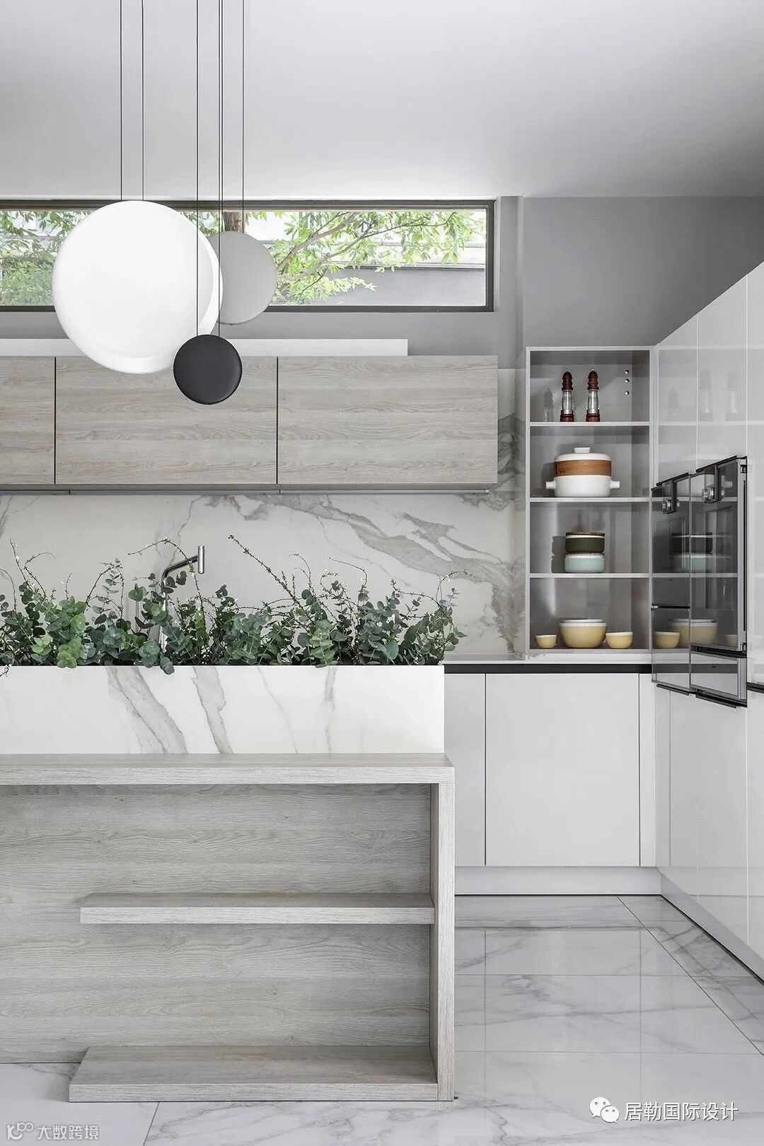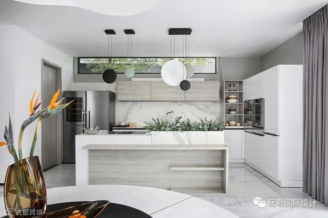 西厨、餐厅合中有开,造型别致的Vibia吊灯和Catellani & Smith吊灯为空间增添了些许艺术气氛,开放式的西厨与餐厅增加了家人间的亲密互动,便于情感的交流与沟通,“合”亦是为了更好的“开”。