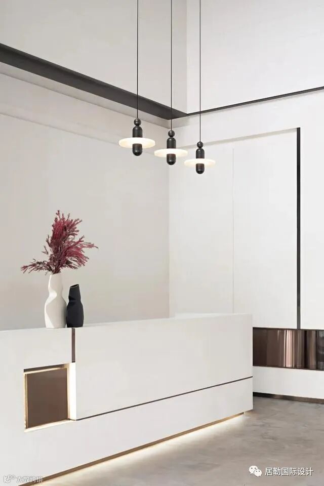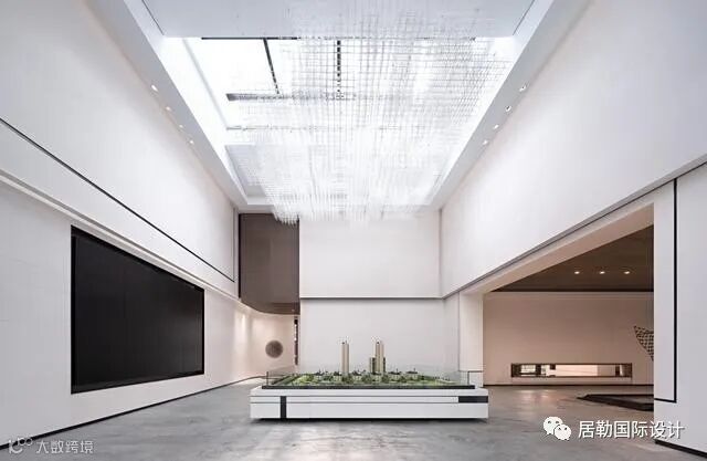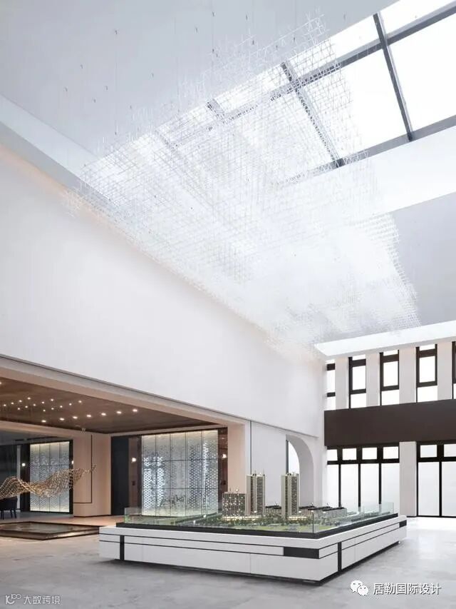 沙盘区的设计依旧延续简洁的设计,黑白灰的色彩搭配营造出高级质感,硬朗的线条的和吊灯互相呼应,白色墙面和花纹