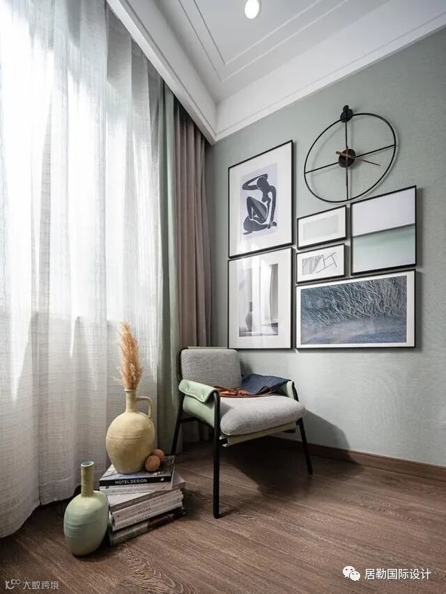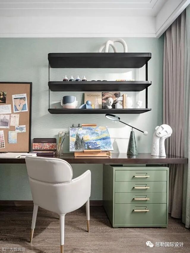 绘画主题的工作室通过别致的时钟设计和意境深远的挂画来加强空间艺术性的表达。淡绿色的自然色调围绕空间,各种绘画