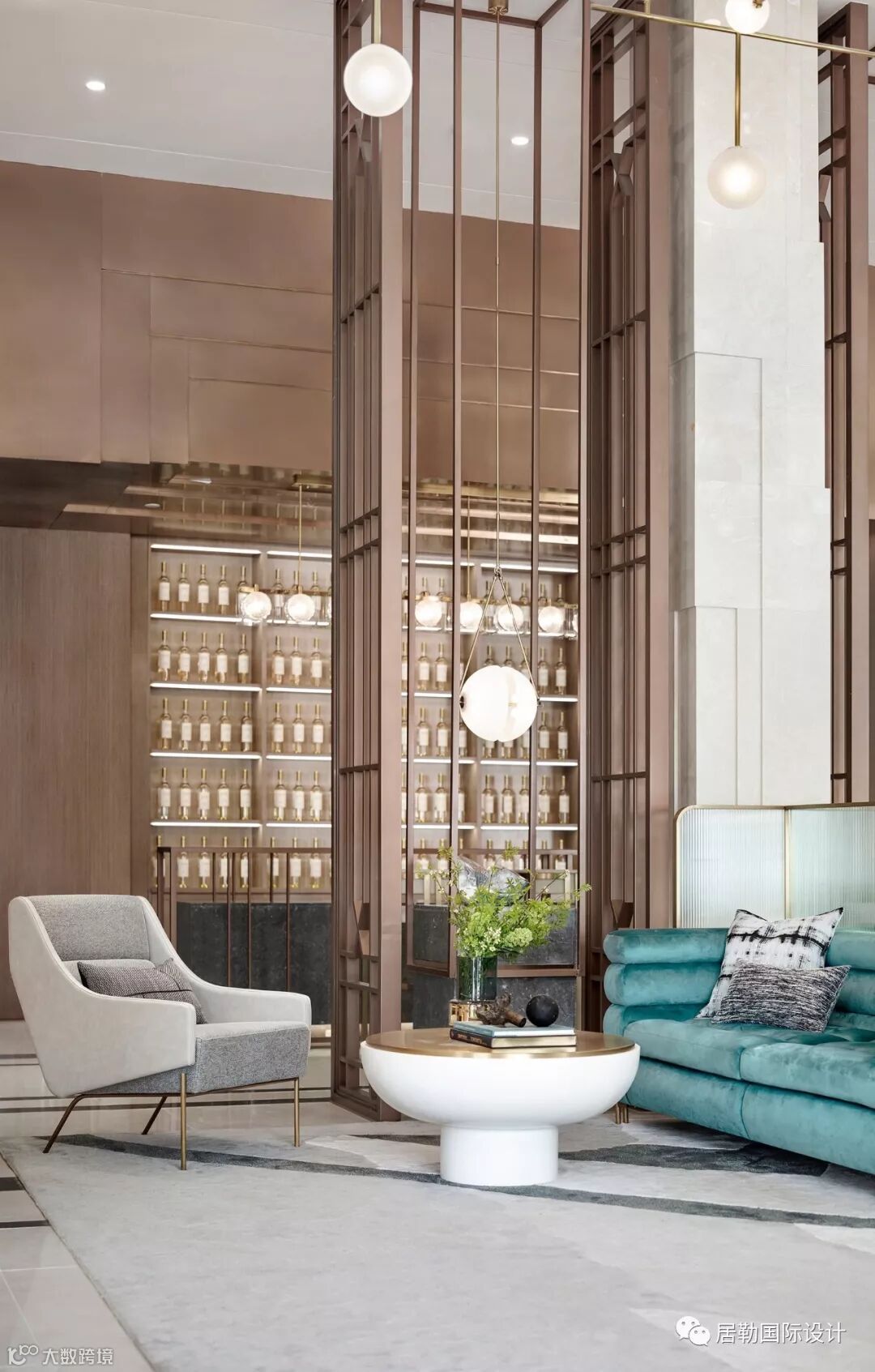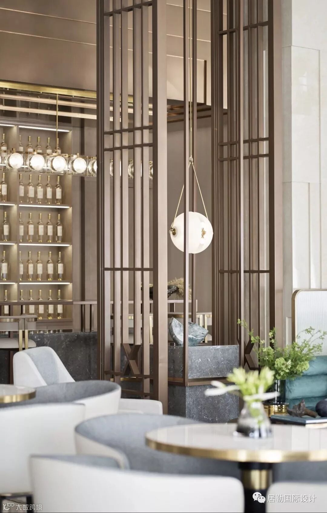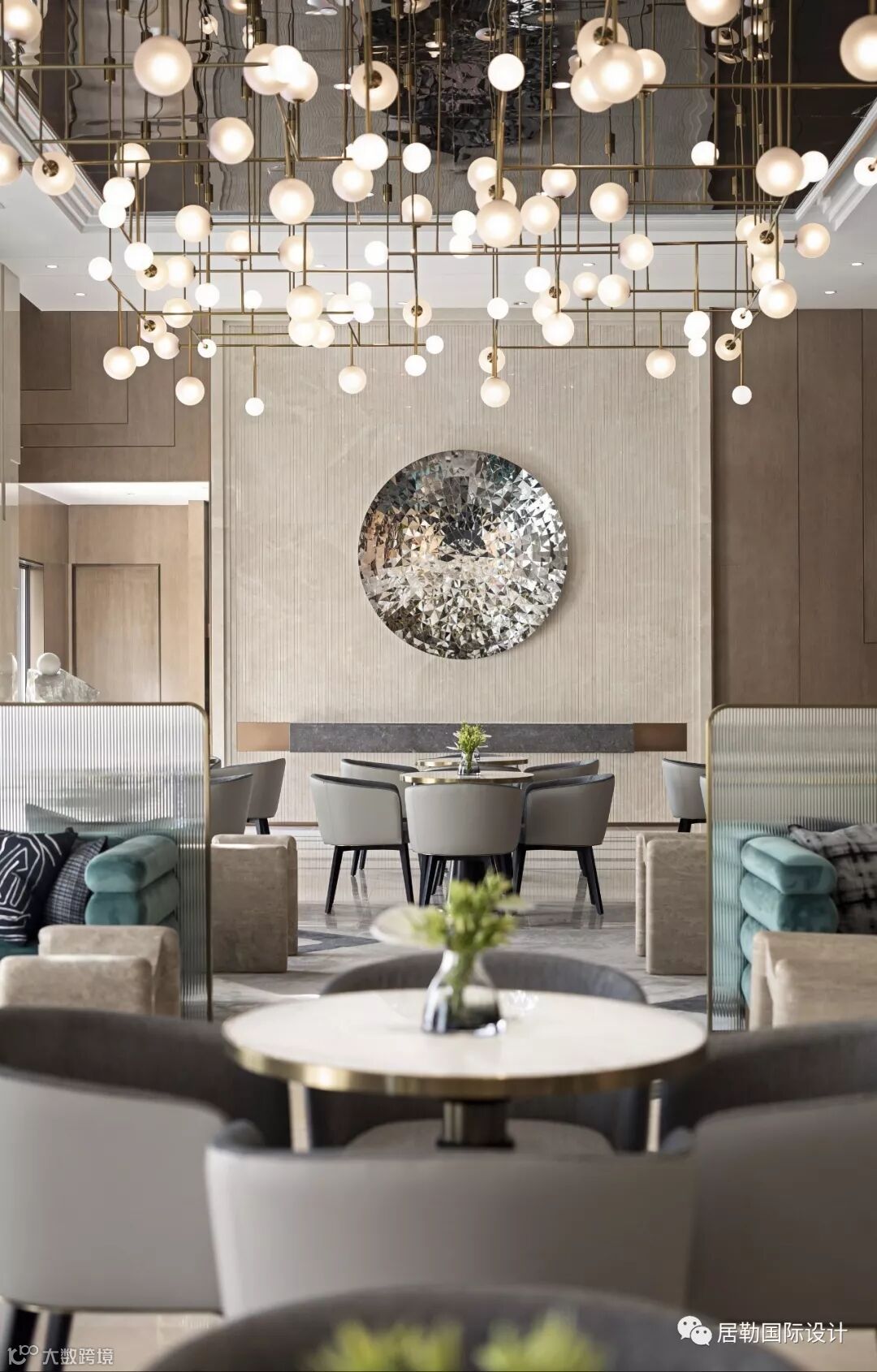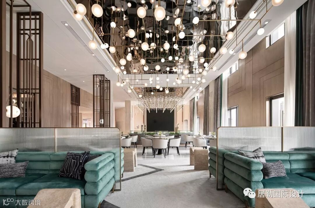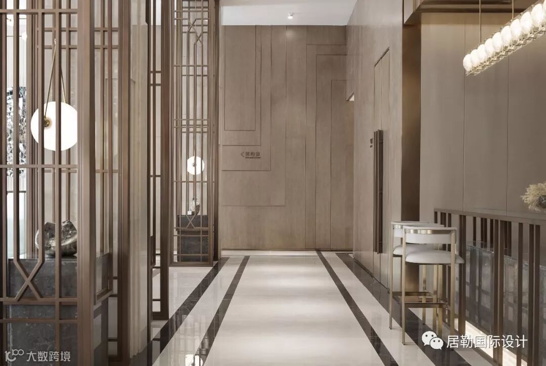整个室内空间开放、有序,通过中轴线上的金属艺术装置为视觉终点。