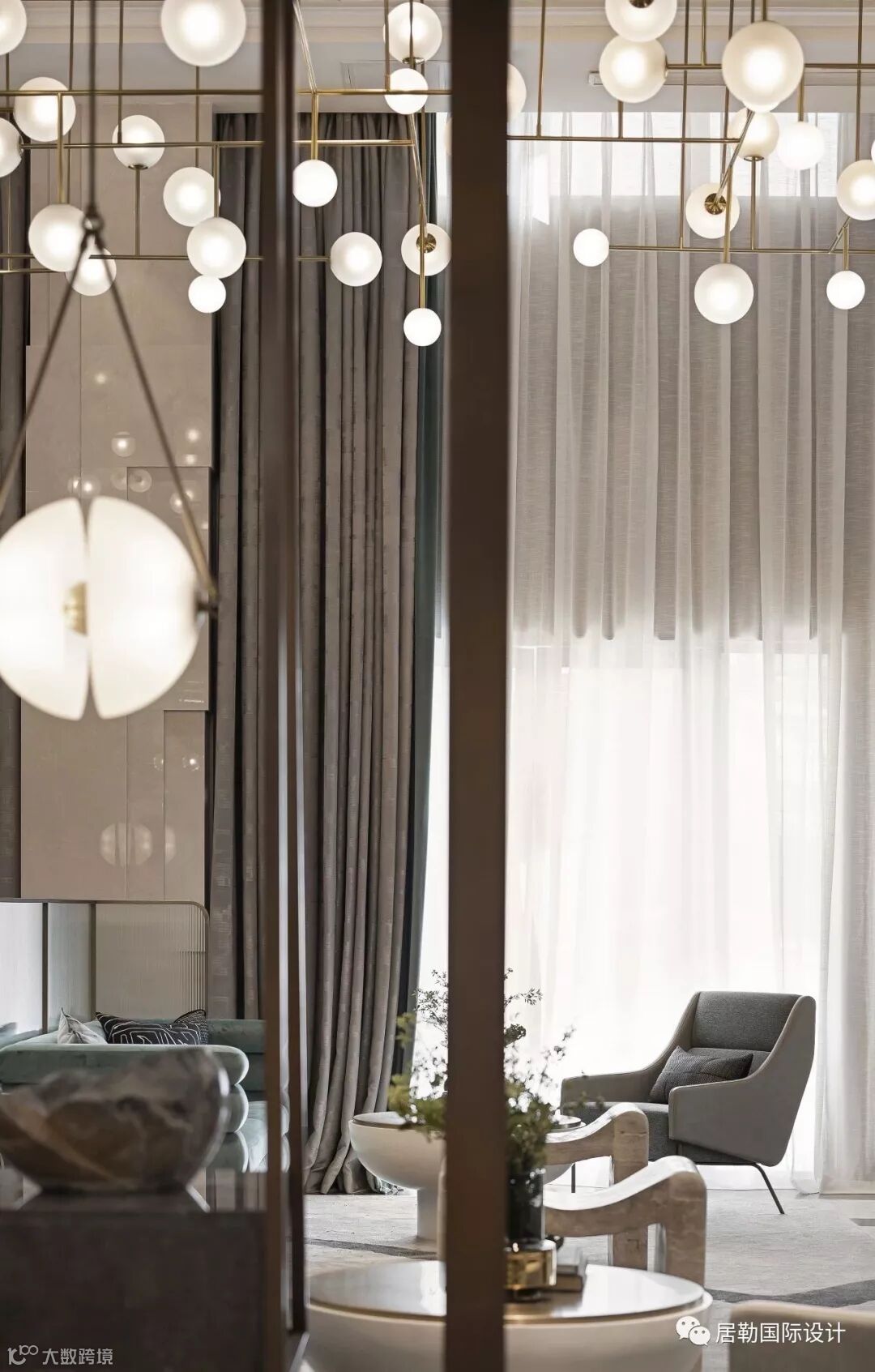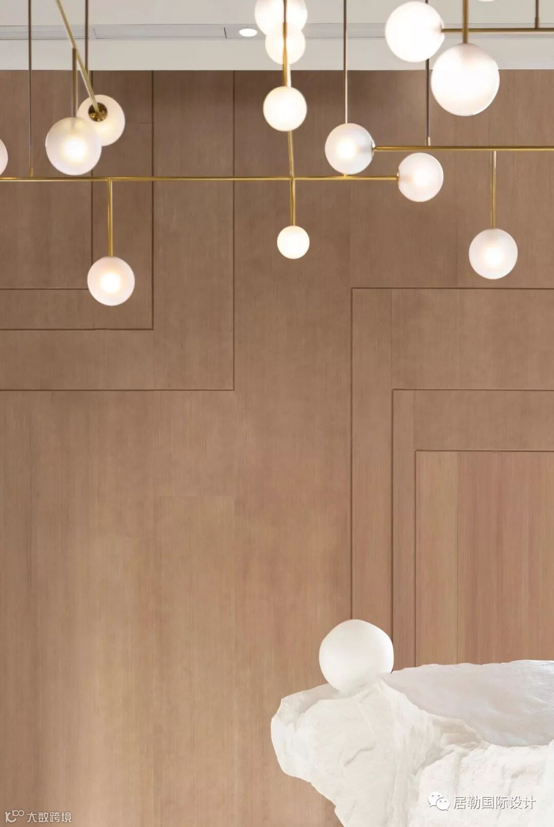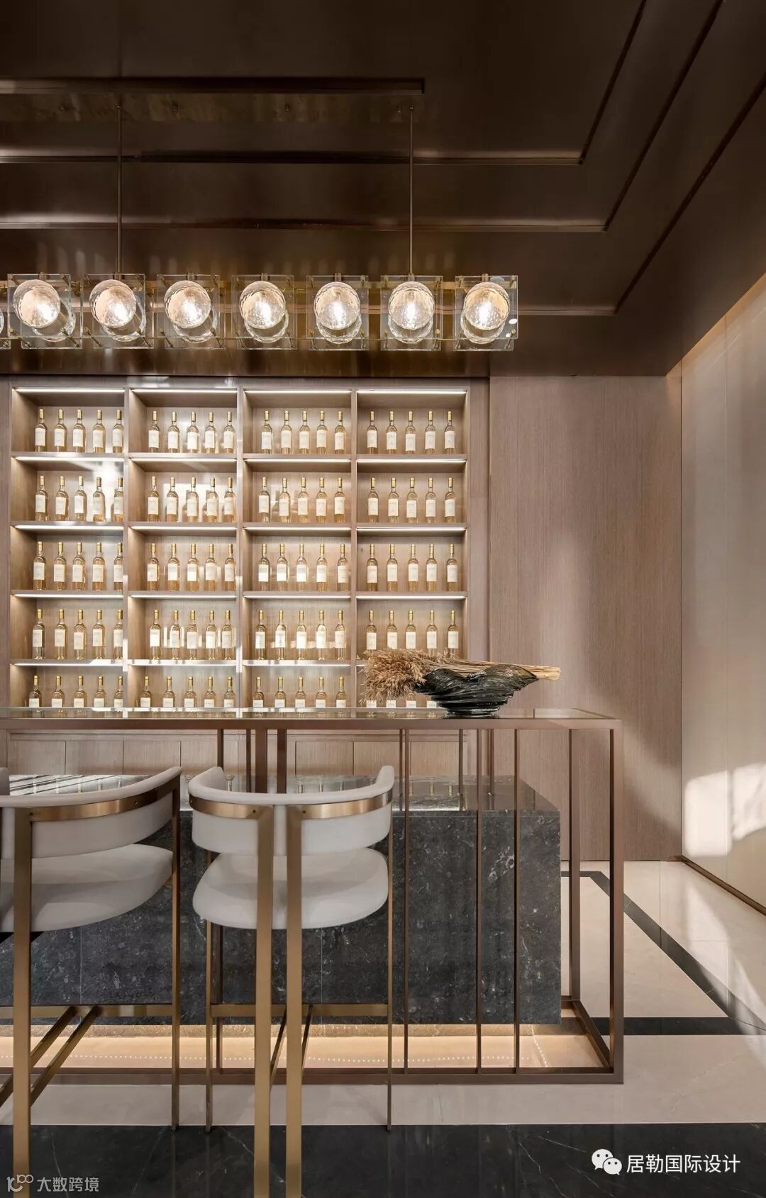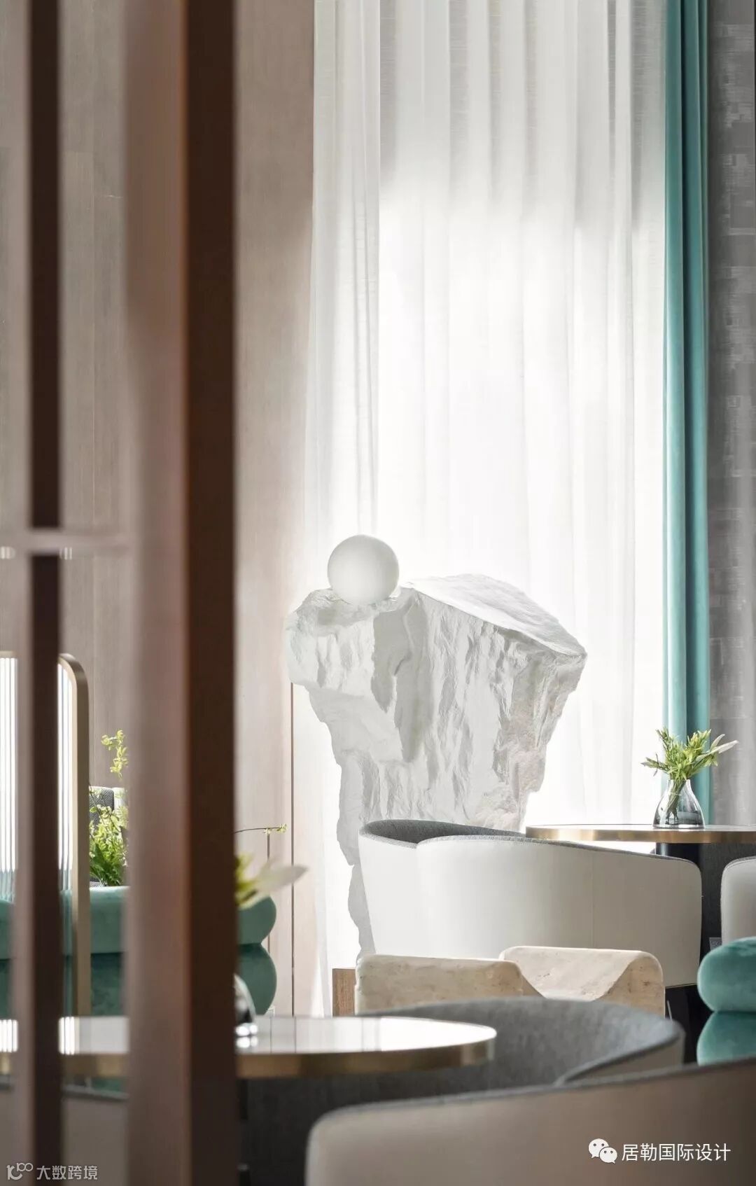 整个室内空间开放、有序,通过中轴线上的金属艺术装置为视觉终点。