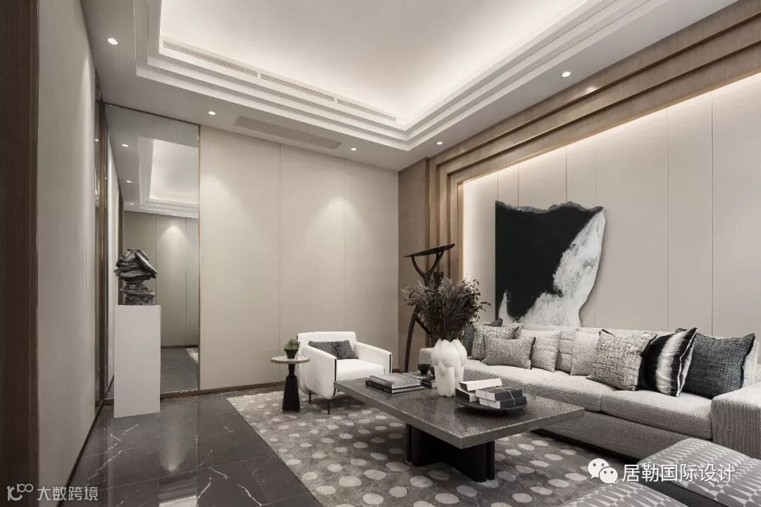入户前厅,高挑空层次及空间感,通过线条、叠级及灯光,气势恢弘,充满震撼感;错落有致的墙面线条感,沉稳而不失灵活,与金属门框,共同围合出一处空且灵净的美学殿堂。光影交落,沿着时间变化,组成撩动人心的细腻语言。