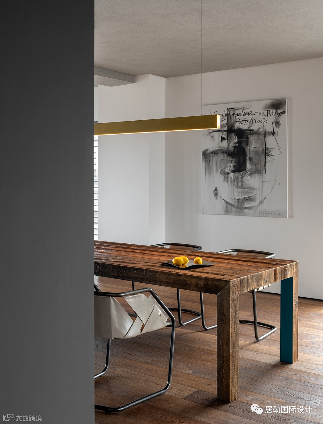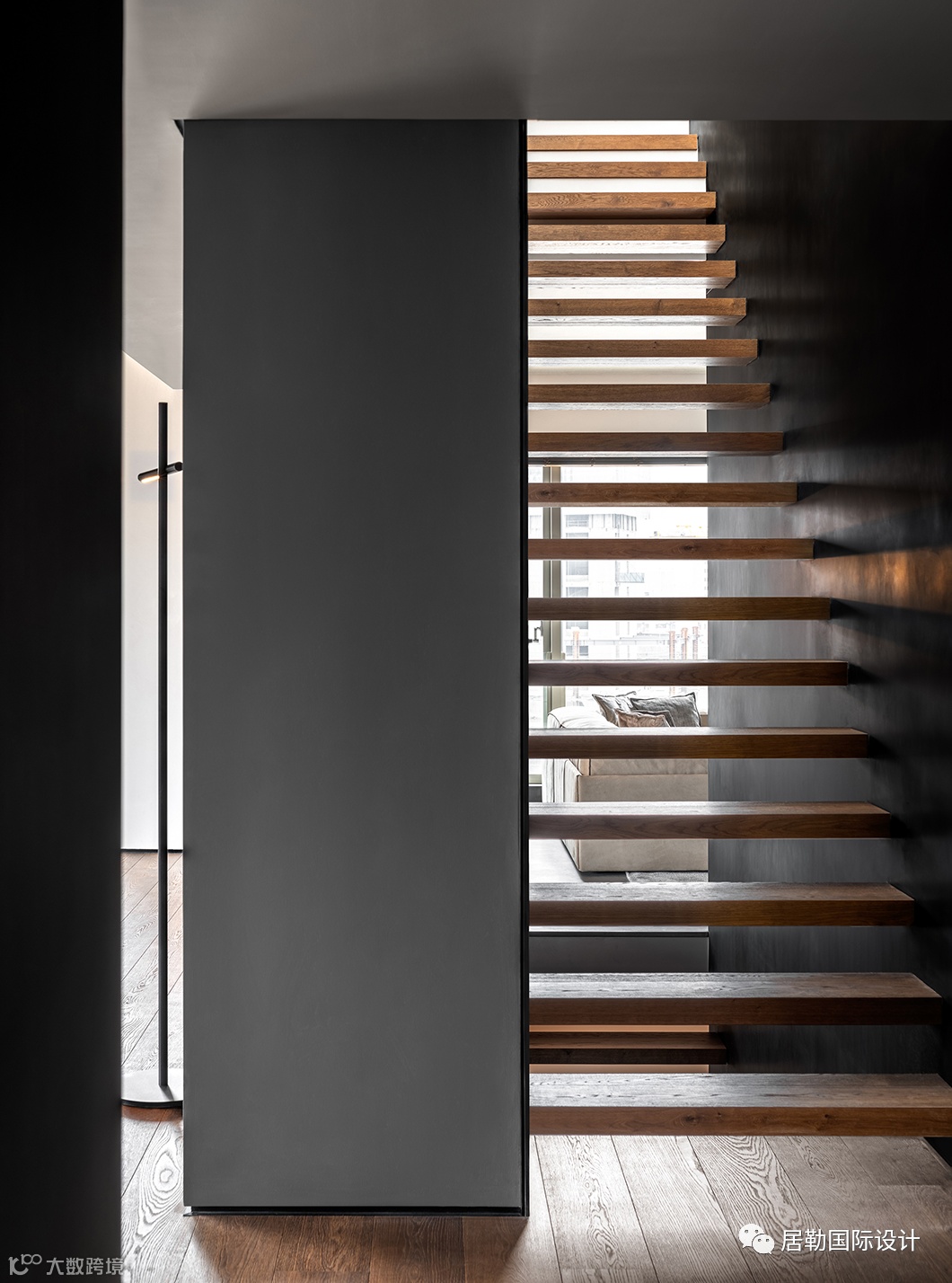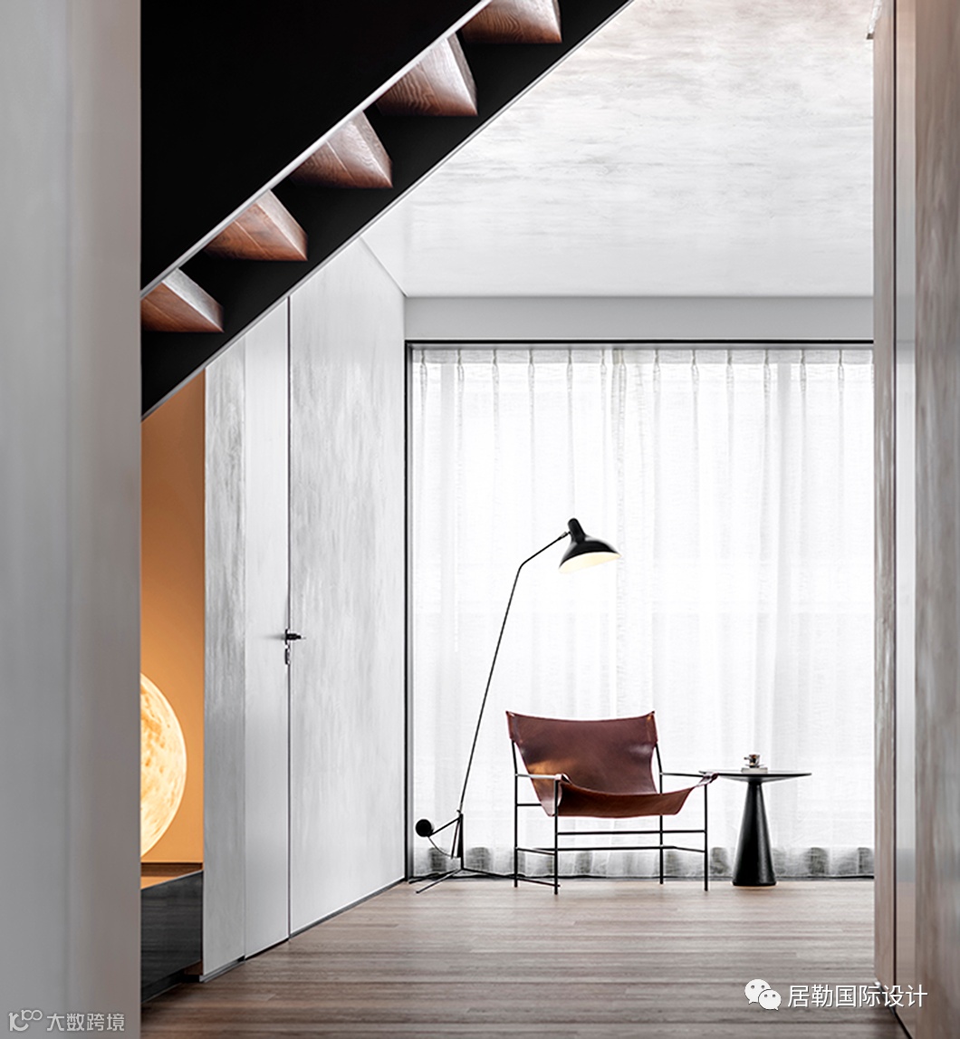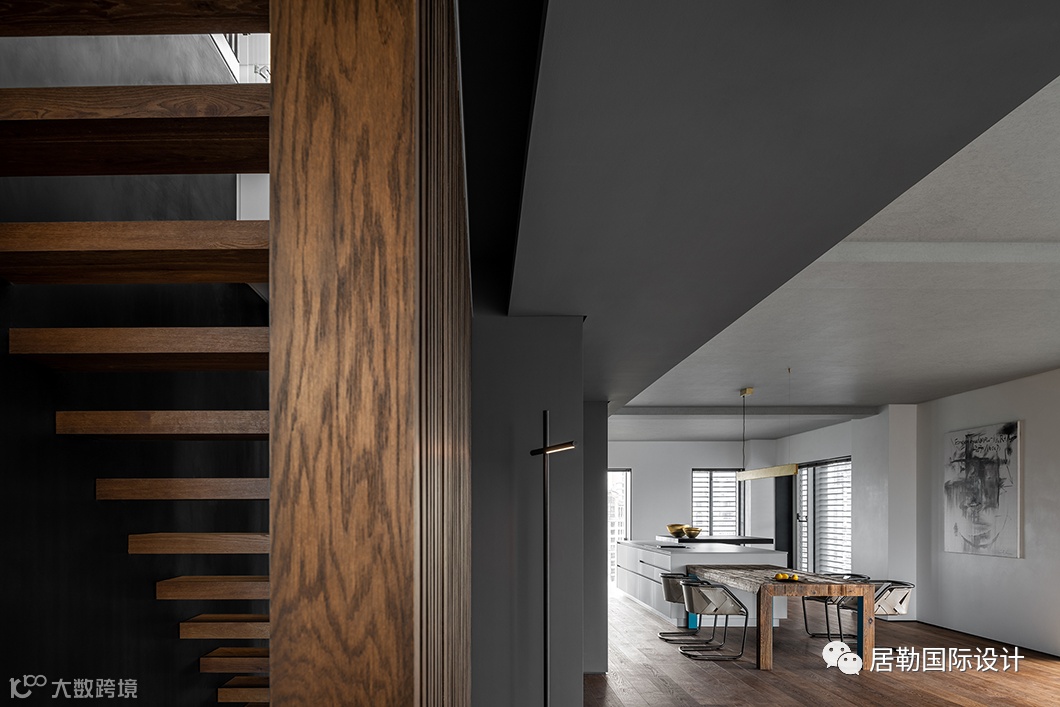 楼梯的位置经过设计师多次反复调整,基于整体布局,以及对横向、垂直枢纽便捷性的把握,最终确立其所在。木质踏步的镂空排列,呈现轻盈的悬浮感,又顺畅的将光照引入,材质的应用在冷暖调和中也显得刚柔相济。