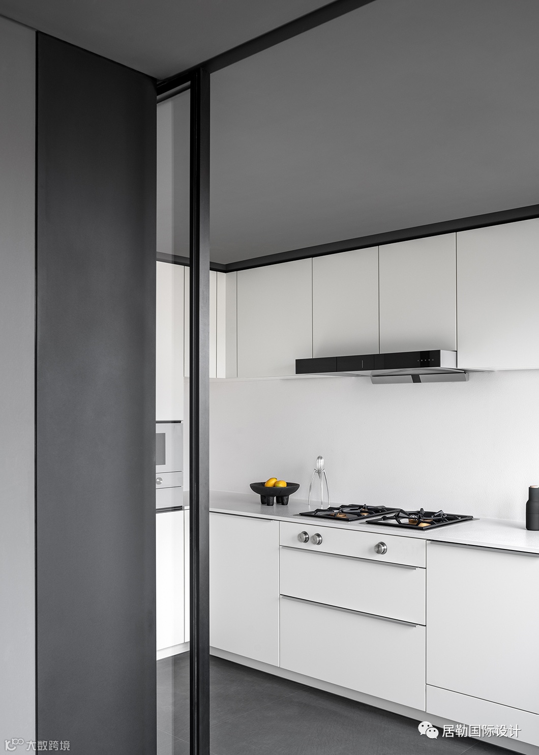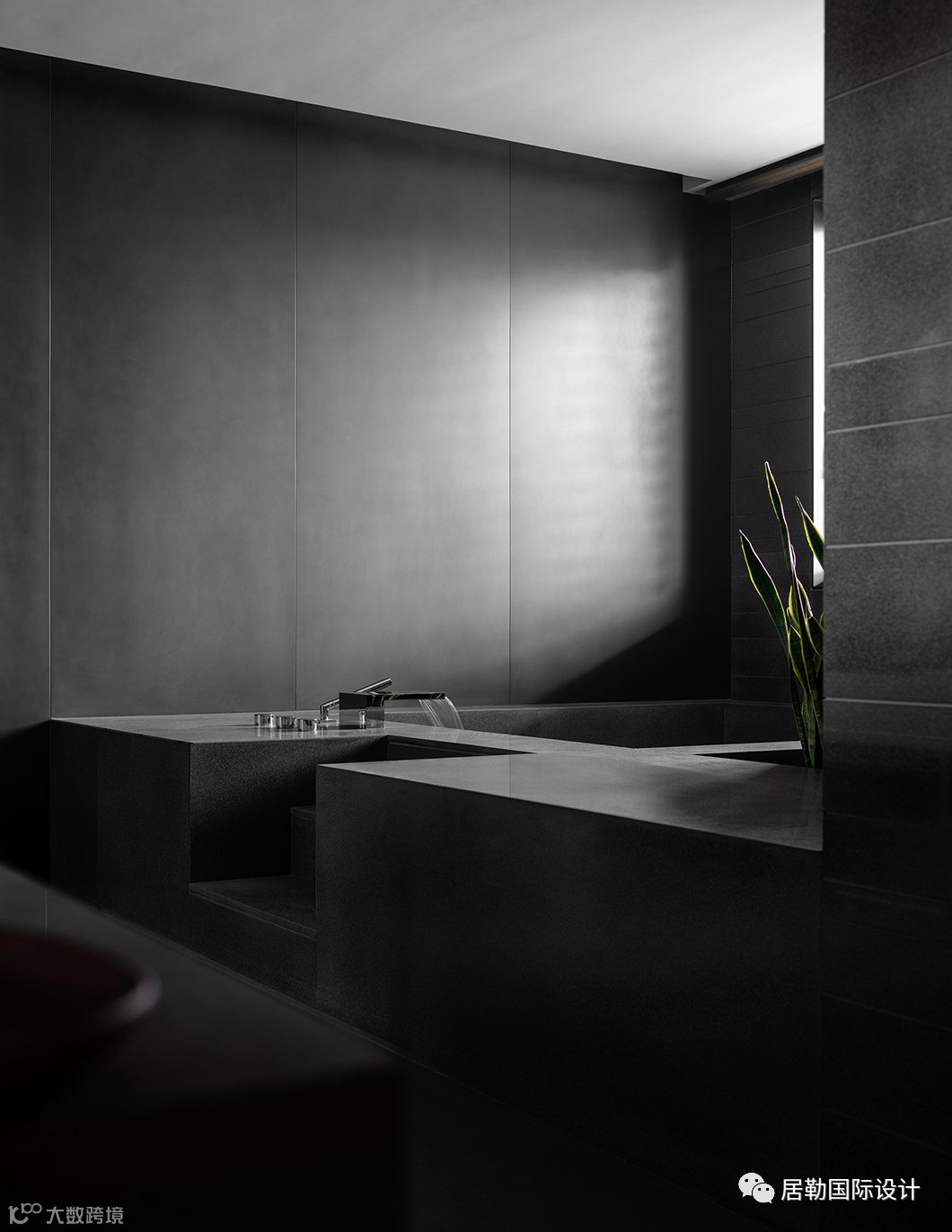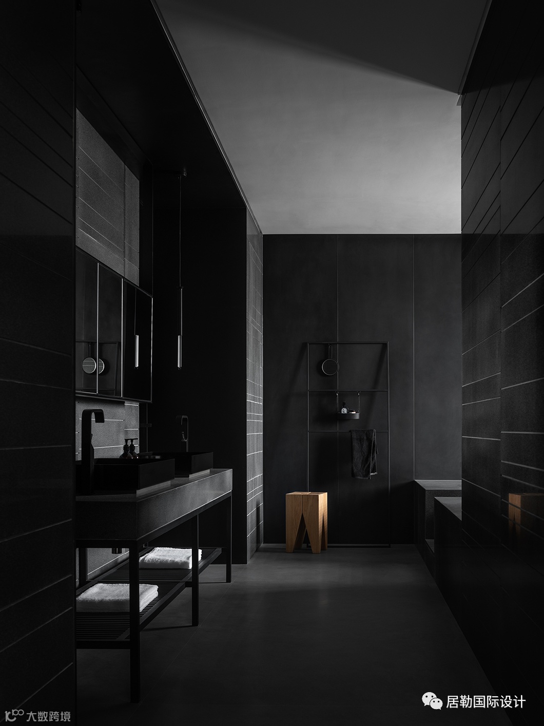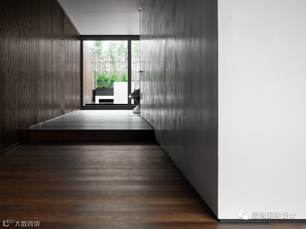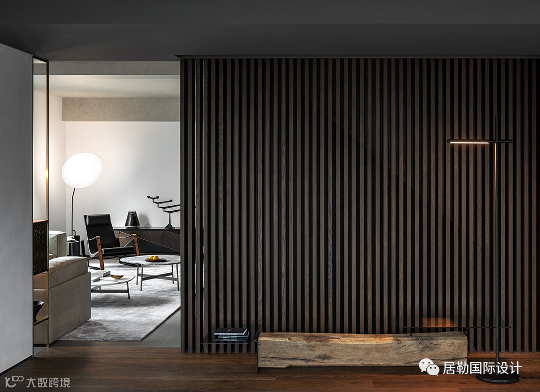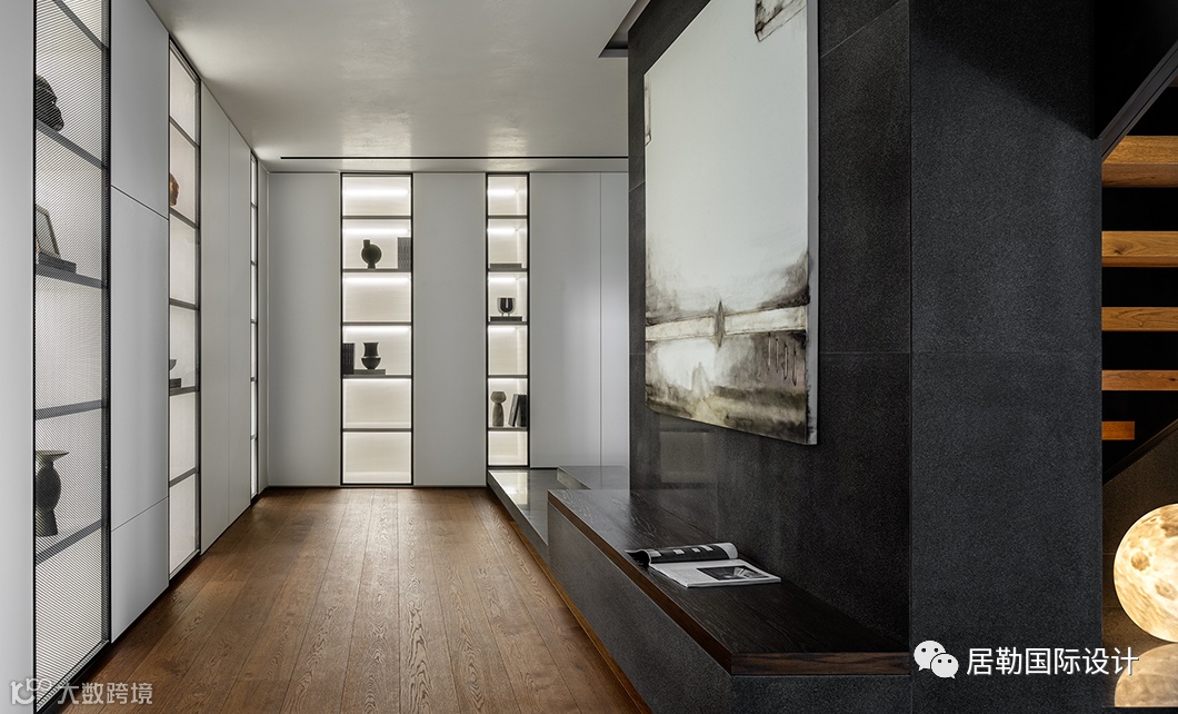 以层叠关系将楼梯衔接而下,并有效利用台面的高度差,设置座位形式,两侧立面格架与柜体将实用与美感合二为一,藏秀并举,这方枢纽也可作为楼下层的活动区域。