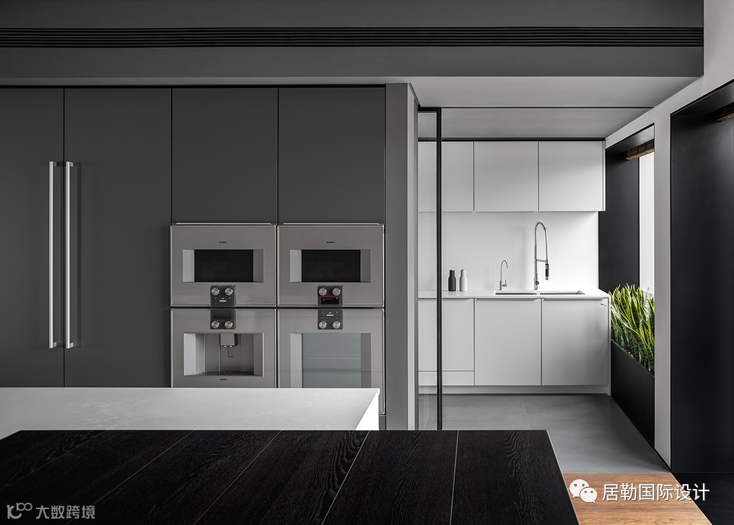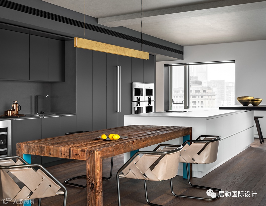 餐桌与岛台一体顺延,呈叠级状起伏,与西厨区的开放互联也遵循着豪宅应有的比例尺度。三面落地窗让这里拥揽绝佳的视野与采光,透过形态、材料、色泽与细节,越发诠释出大都会的俊朗风度。
