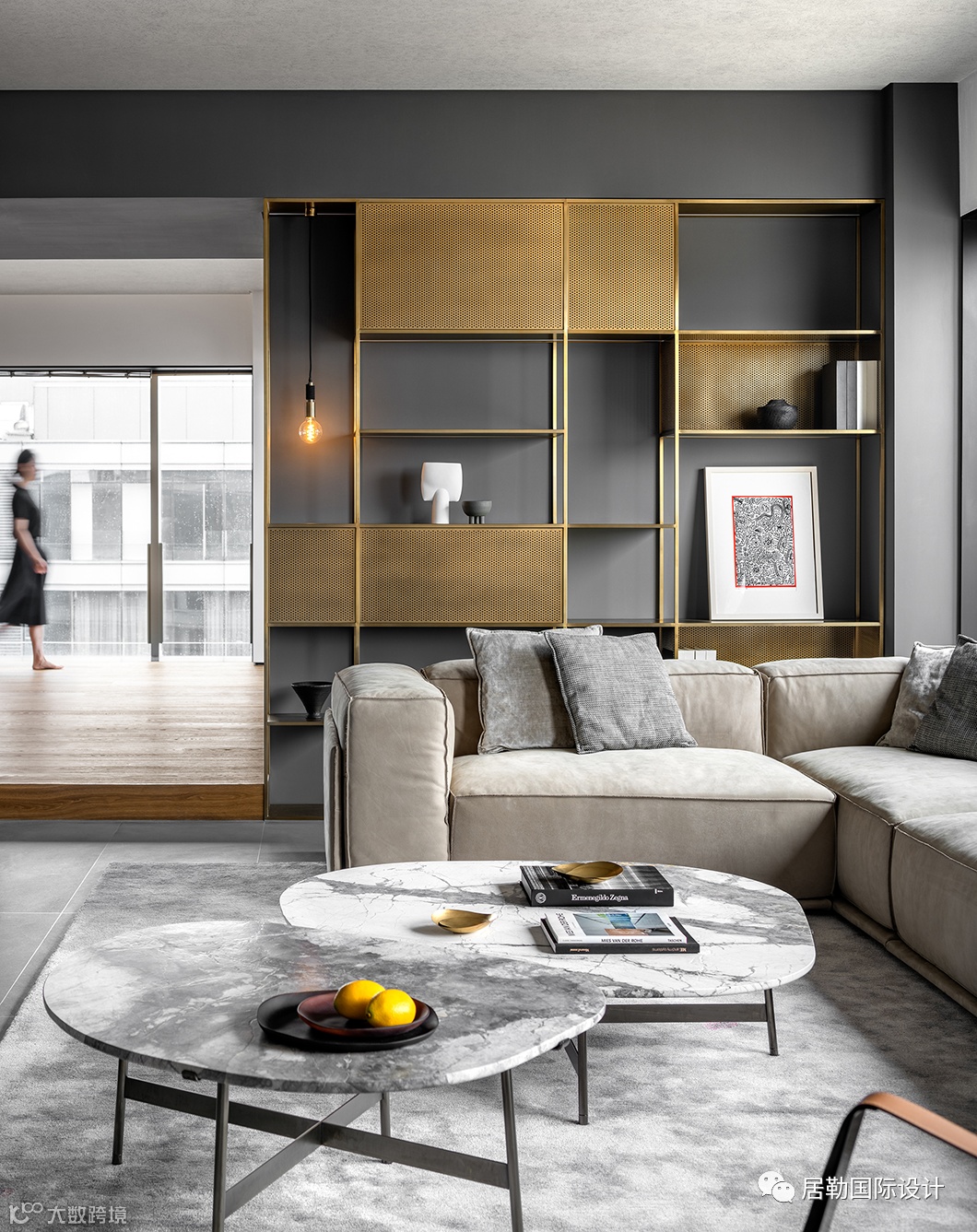 软装陈设在素净的基调下尽显随性自由气息,力求还原生活本真。L型沙发极尽柔软,而定制的黄铜格架,借由冲孔板的穿梭点缀,在不拘一格的形态关系中有效拉升层次,可谓恰到好处的调和。
