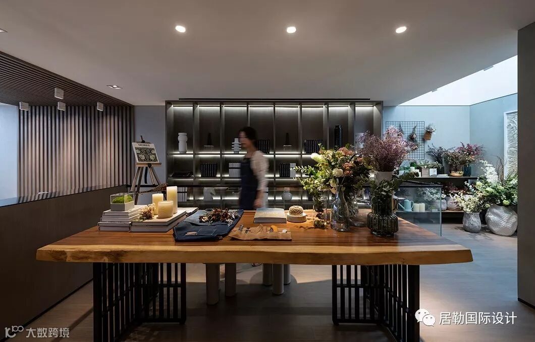 夹层花艺区,是日常为精神供给养料的狭小空间。墙纸饰面吸纳自然的色彩、肌理,在其中打理各色花艺,定气凝神间纯粹的观感被无限放大。