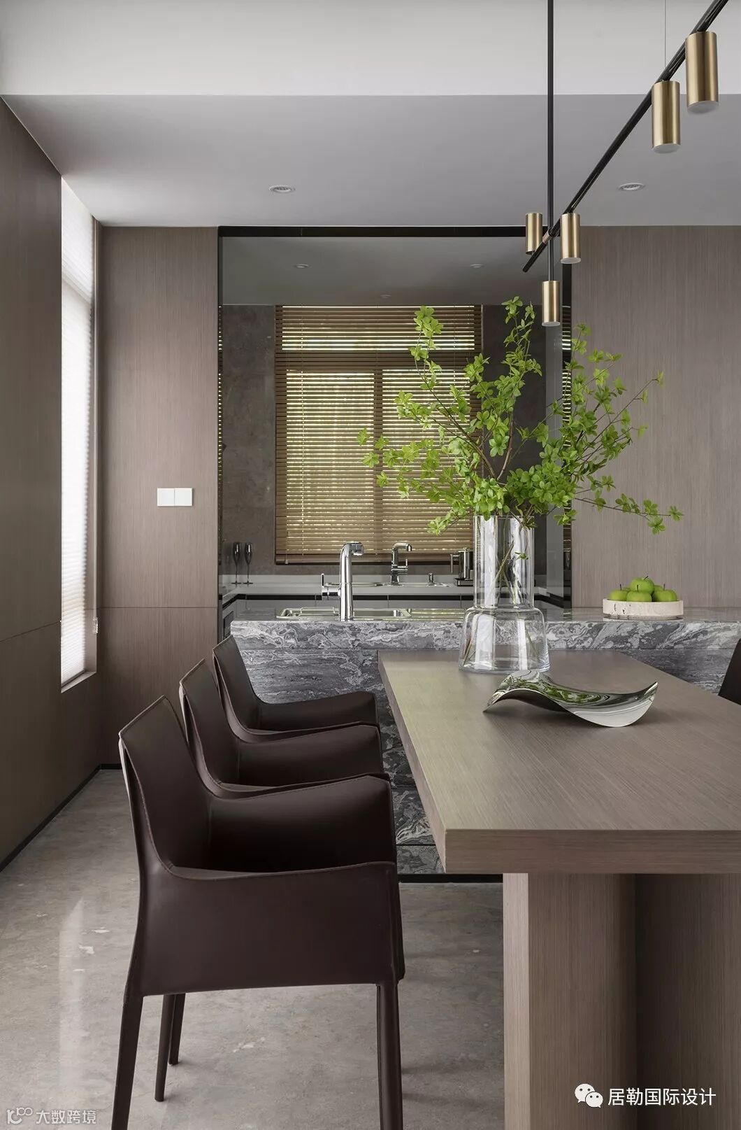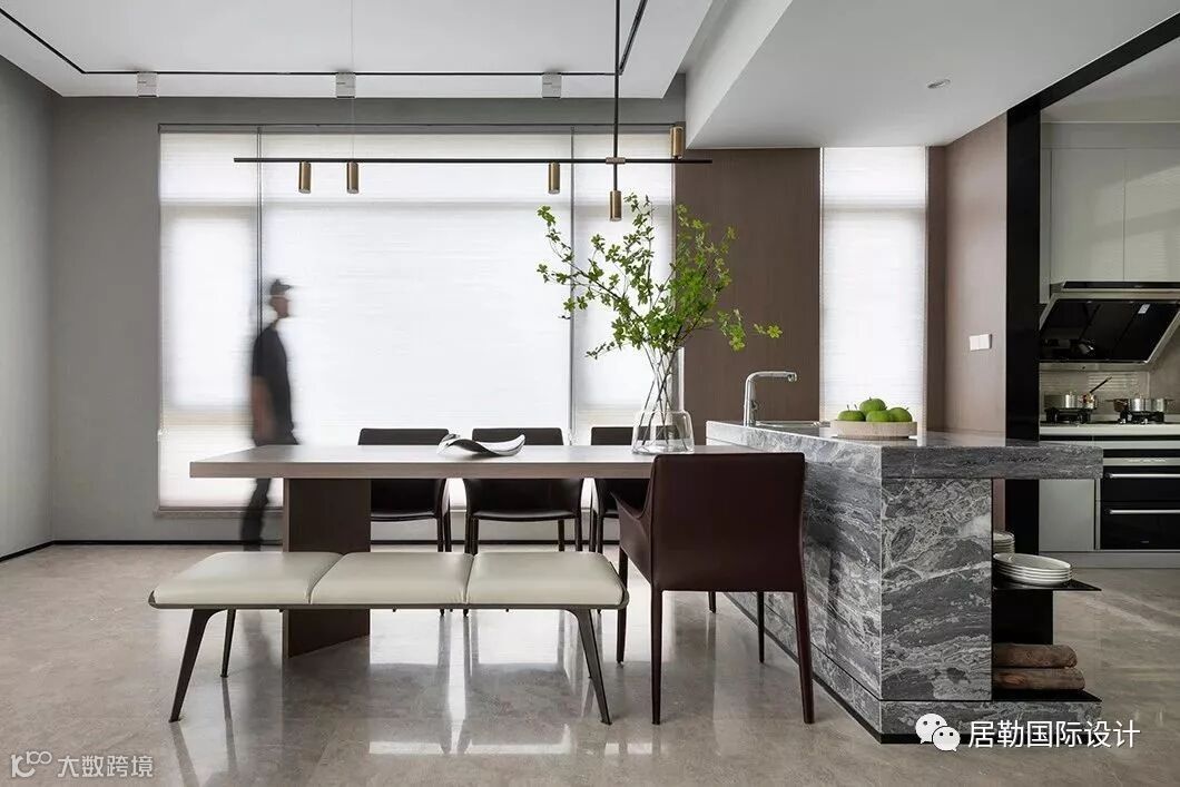 与客厅连通的厨房是偌大的开敞空间。灰绿色大理石材质岛台,为空间增加了几分细致入微的质感