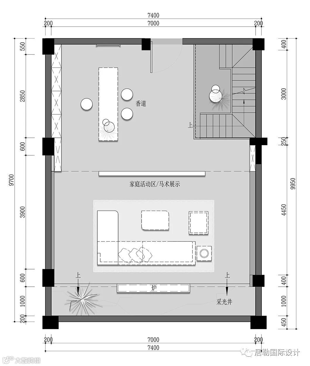 白色沙发是空间气质的具象化身,自有一股不食烟火的灵气。另一侧墙面陈列着马术用具,和悄然伫立的经典藤编椅自成一体,是对贵族精神由内向外的凝视。