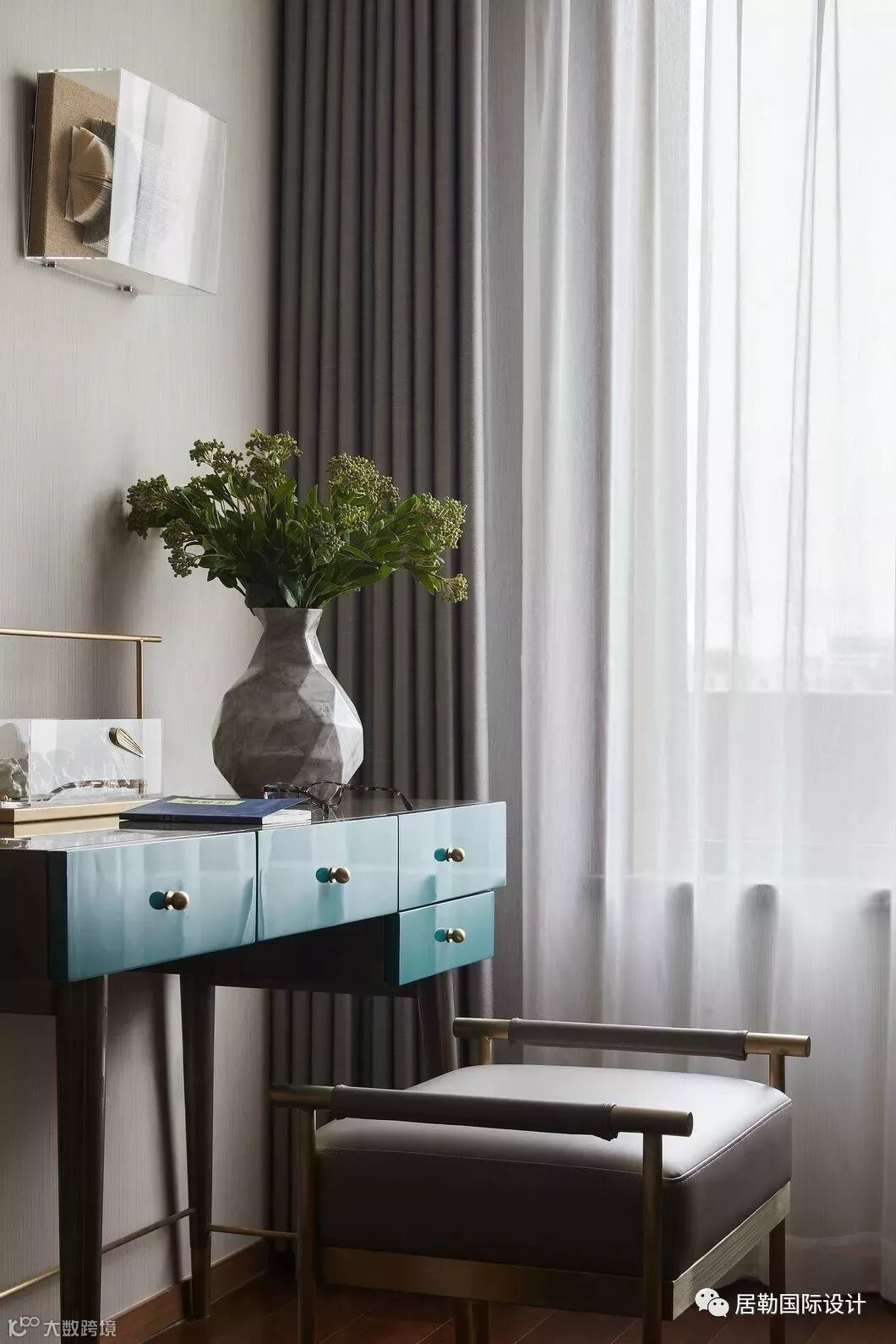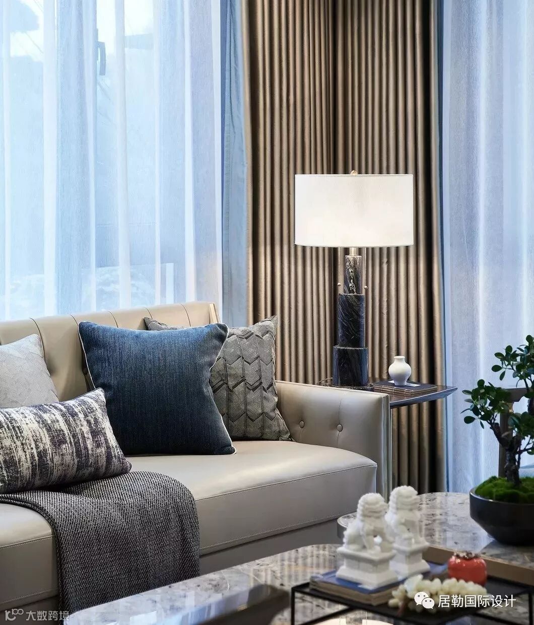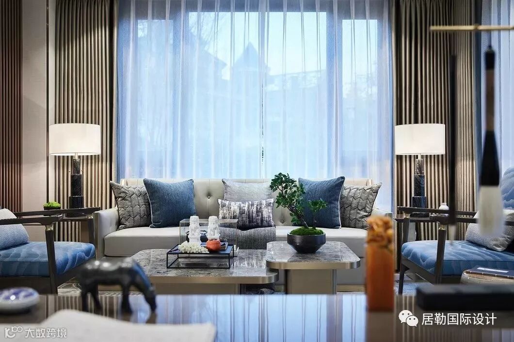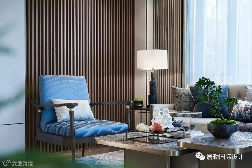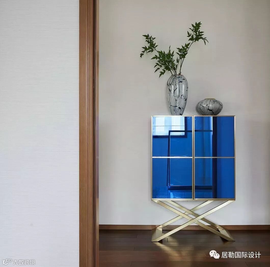 院墅内的设计,处处透露着对东方清雅生活意境的美好追求。室内的主色调汲取了江南水乡的湖蓝色,清雅的色调与现代简约形制融构于一体,在空间中铺陈出别有风致的现代中式美学意涵。