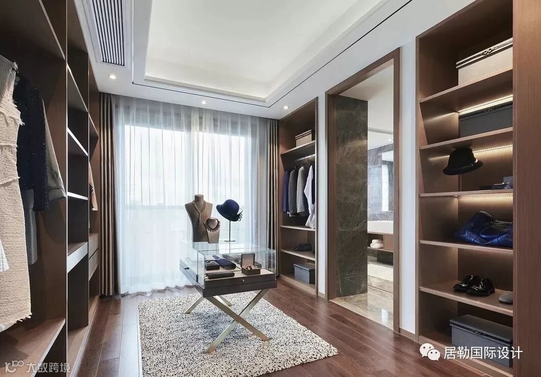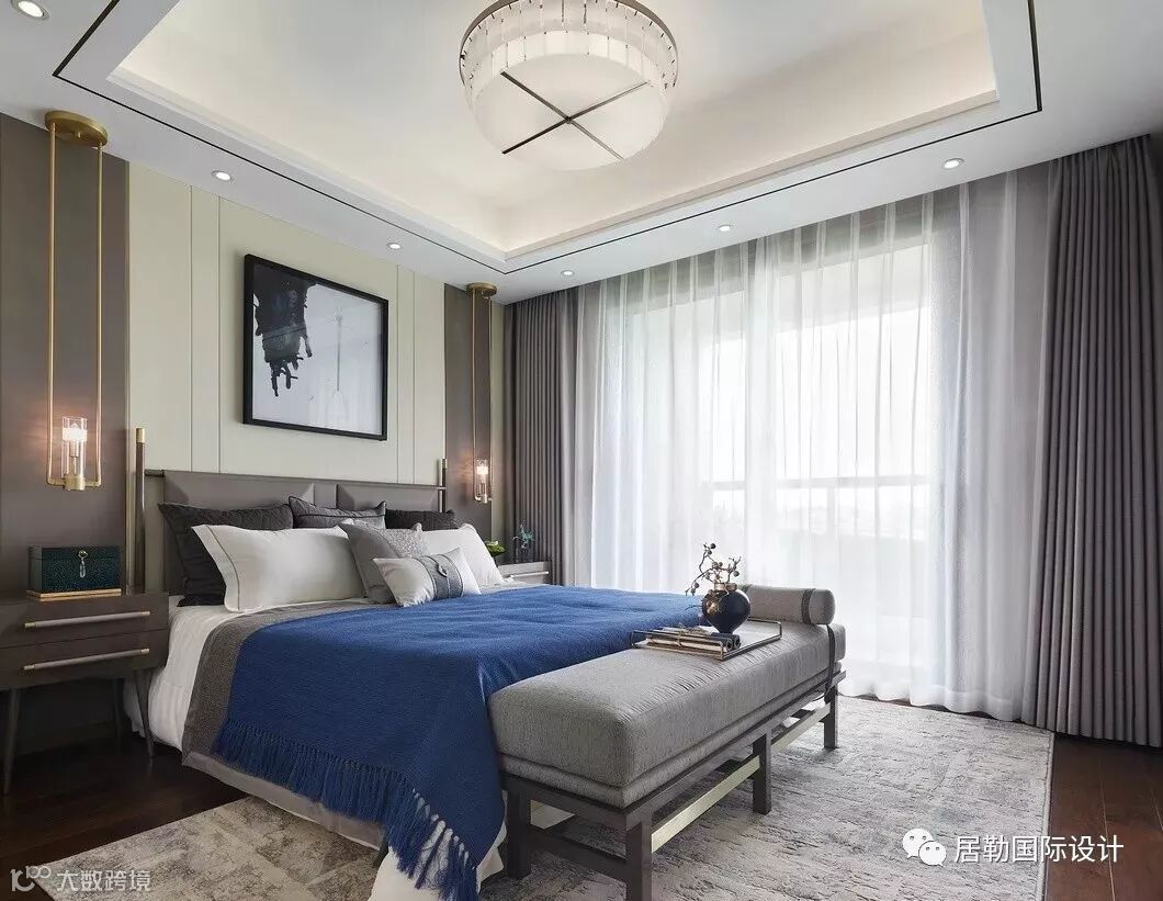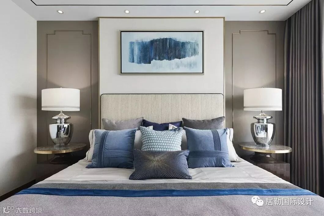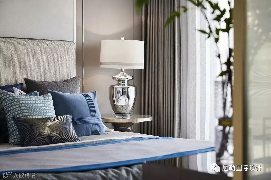 主卧套房独占一层,宽敞的卧室与卫浴间、步入式的衣帽间以及梳妆区,打造主人房礼序与尊贵并具的生活仪式。湖蓝与水墨灰糅合、木制与大理石搭配、棉麻与丝绸互映……空间所用的材质均显露着典雅的质感,现代简约形制与东方意蕴无缝融合,营造沉稳高雅的居室氛围。