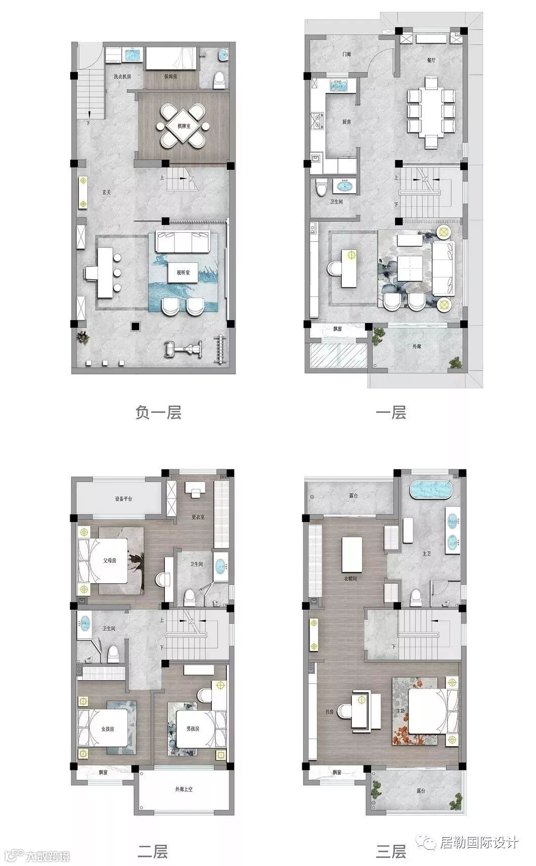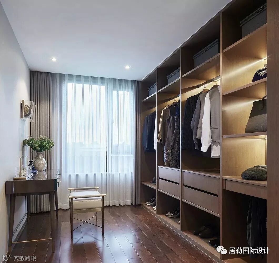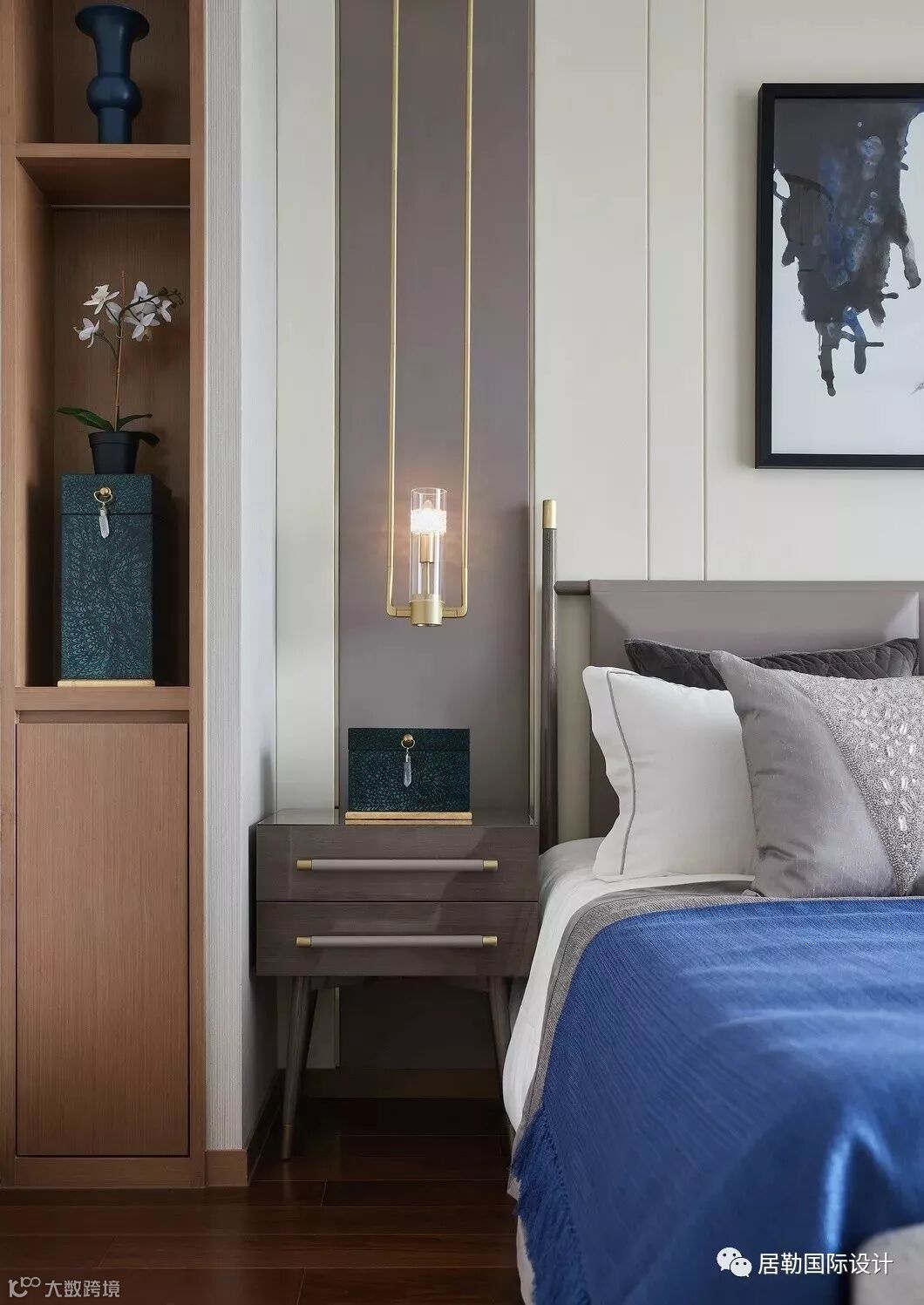 主卧套房独占一层,宽敞的卧室与卫浴间、步入式的衣帽间以及梳妆区,打造主人房礼序与尊贵并具的生活仪式。湖蓝与水墨灰糅合、木制与大理石搭配、棉麻与丝绸互映……空间所用的材质均显露着典雅的质感,现代简约形制与东方意蕴无缝融合,营造沉稳高雅的居室氛围。