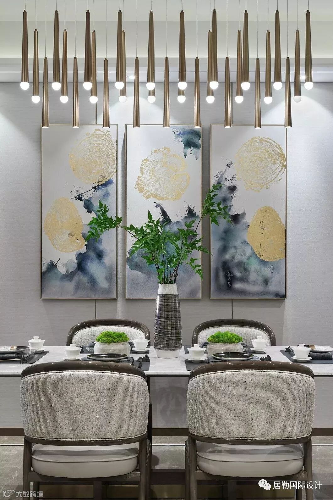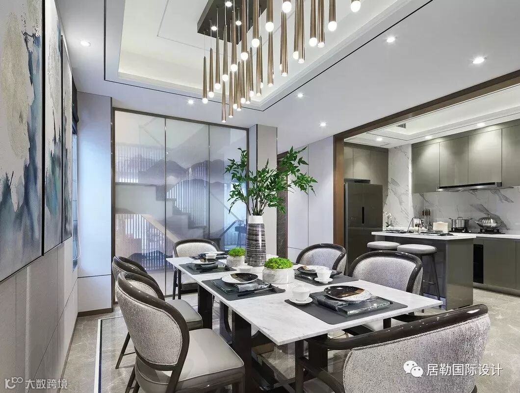 餐厅采用对称式的布局构设,用烟灰色的淡雅铺陈空间。一幅描绘着缥缈烟岚的水墨画,将中式风格的特征注入,与大理石、软包、棉麻等现代材质加以融合,打造出更贴切当下审美风格的就餐空间,格调更显高雅端妍。
