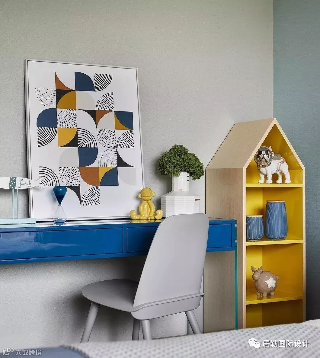 男孩房的设计偏向现代风格,生趣的各式动物摆件加以装饰,多样的色彩与纹理交织其中,传统屉柜的中式特征与亚克力材质搭配融合,令空间的情致韵律更显丰富。