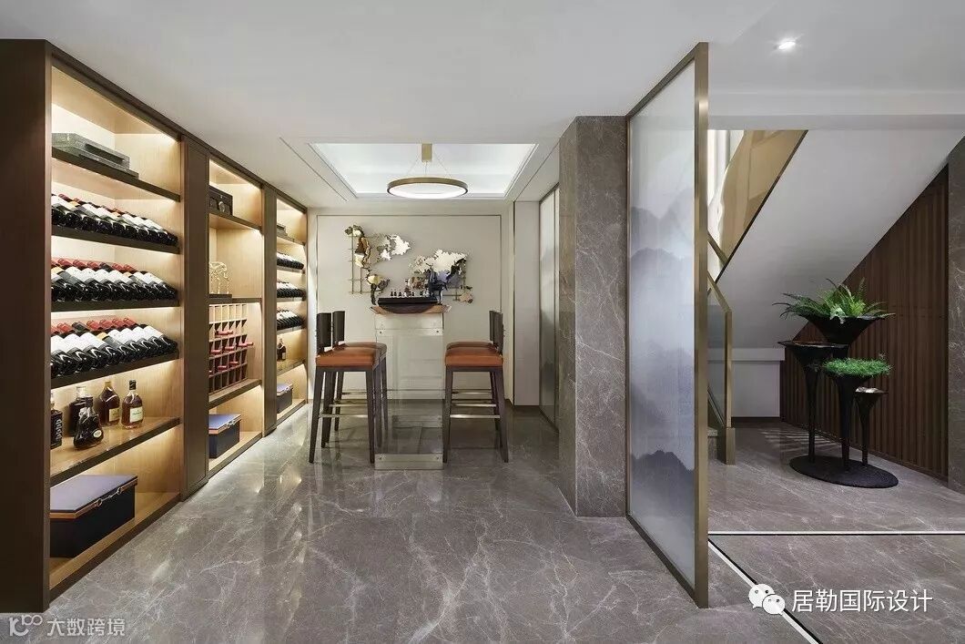 负一层空间设置为休闲区,沿着步梯往下,毛面玻璃与木格栅区隔空间,各个分区遵循着细致的对称美感,凸显东方传统的礼序文化。视听区的设计犹为简雅大方,浅灰、木棕与孔雀蓝互映搭配,现代家具的简约品相与饰品上装点的中式文韵交织相融,呈现空间丰盈且极致的内在精神。