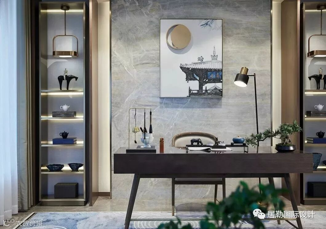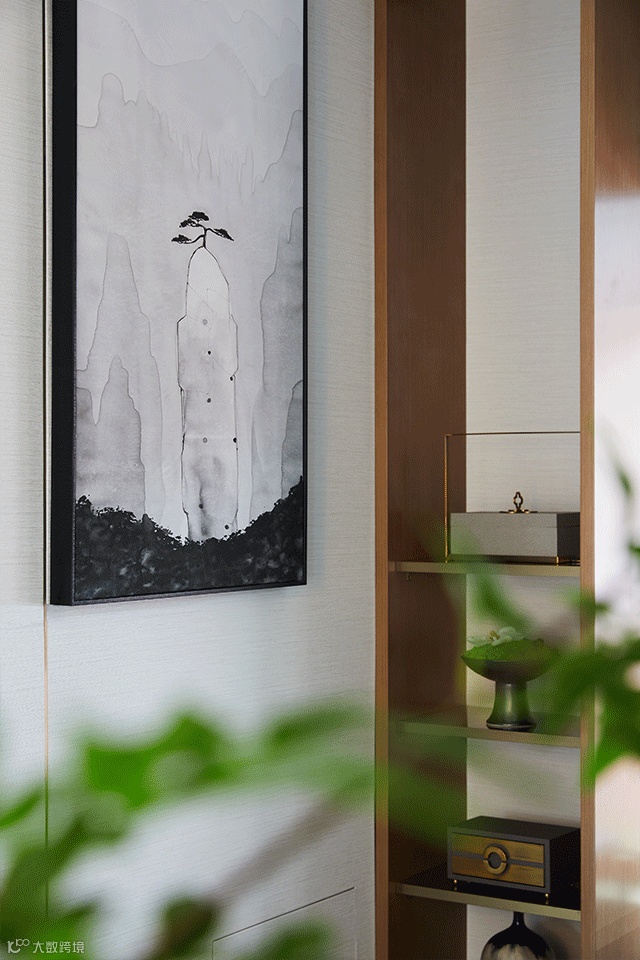 撤去传统会客厅设计中的电视墙,构设出一方可书写读阅的天地,设计彰显着对回归传统精神生活方式的主张。笔墨纸砚、茶道瓷品、绿植小件表现着空间的中式情怀,于端庄大气中透着内敛的文雅风韵。