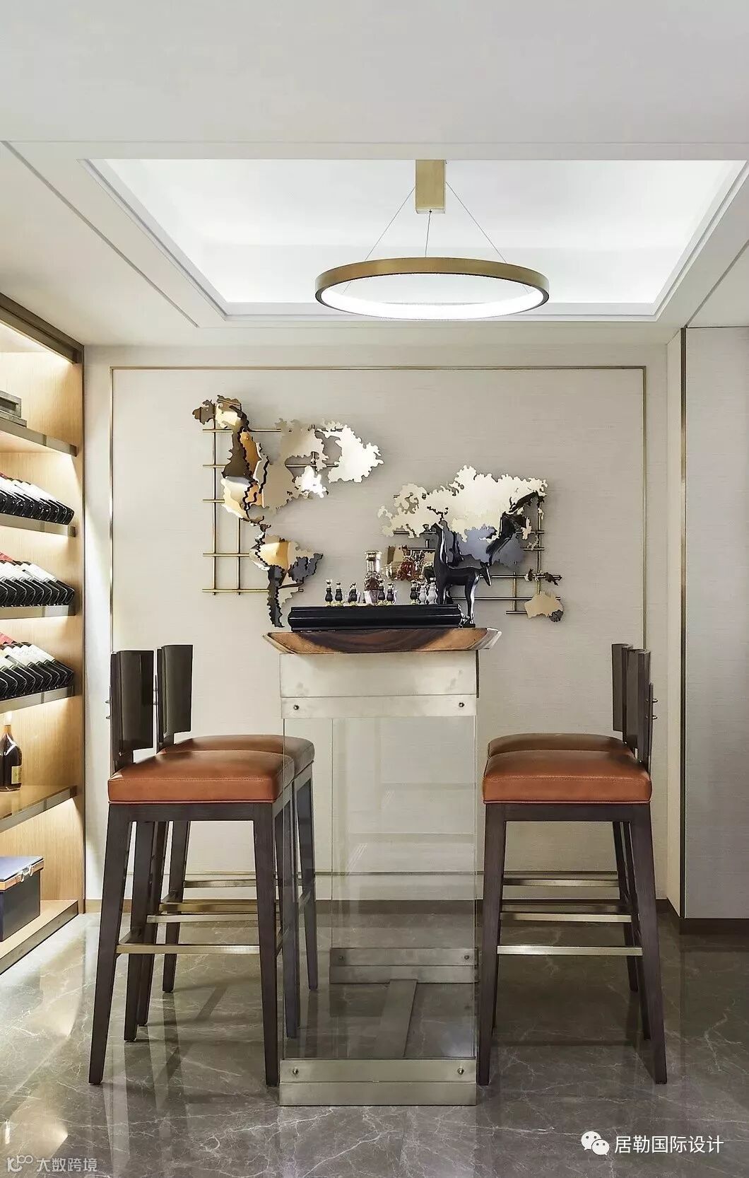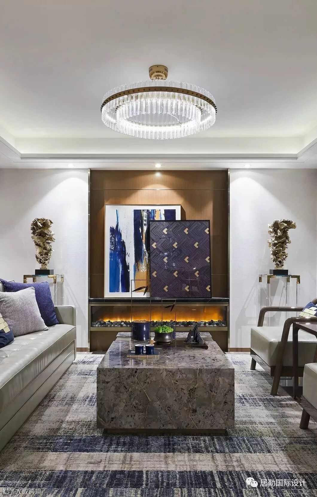 走入空间,可见水纹的柔美点染于软包、画饰、地毯等软装上,渲染出怡人舒适的空间氛围。三扇大面积玻璃门窗,将四时风光纳入框景中,邀人坐看自然的生机、时间的足痕。