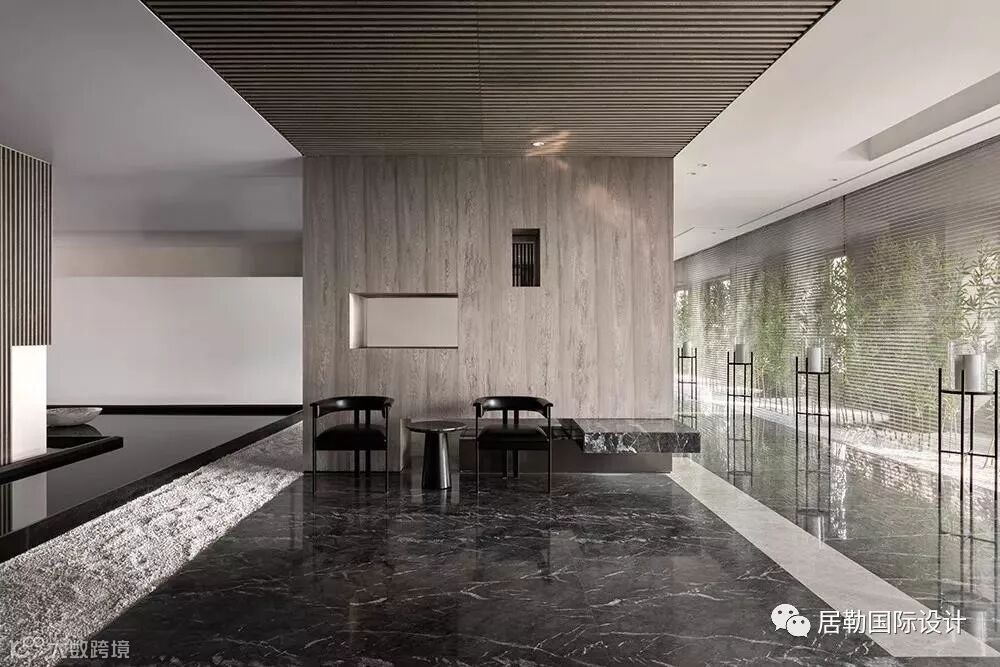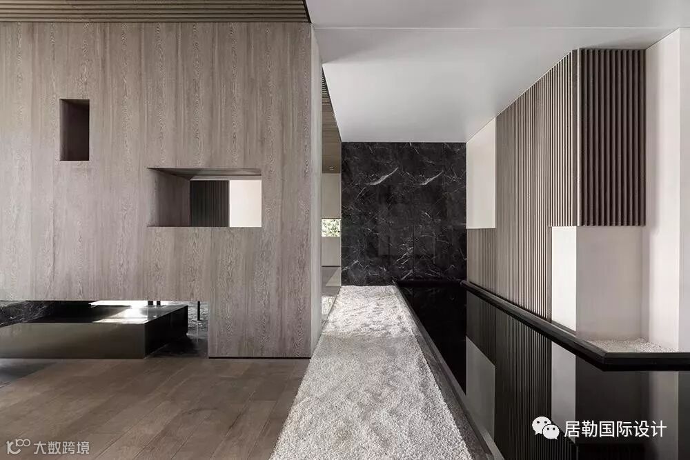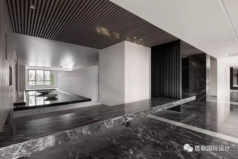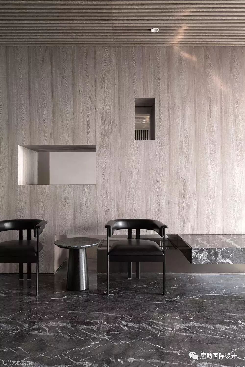 电梯区域采用了黑白两种明暗色调与量体空间构造等划分空间格局,天花板、地面、墙面不再是规整对称的水平线,而是通过对于天然材质的自然色彩与肌理的分辨布局,重新演绎动静。