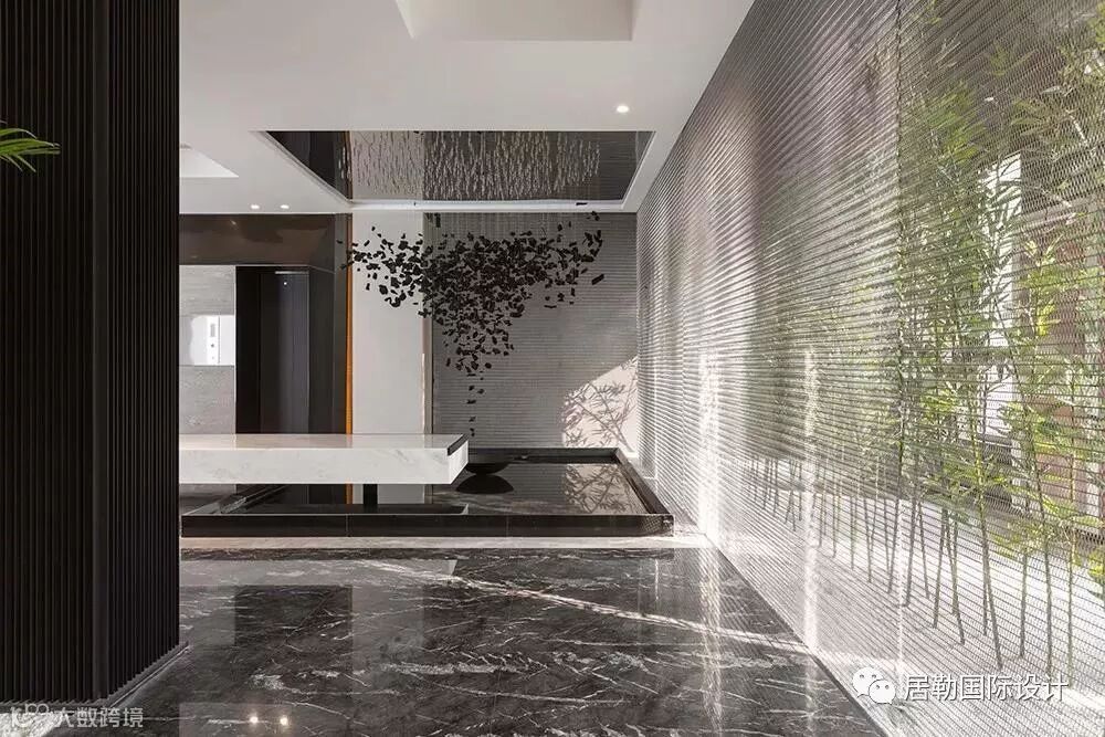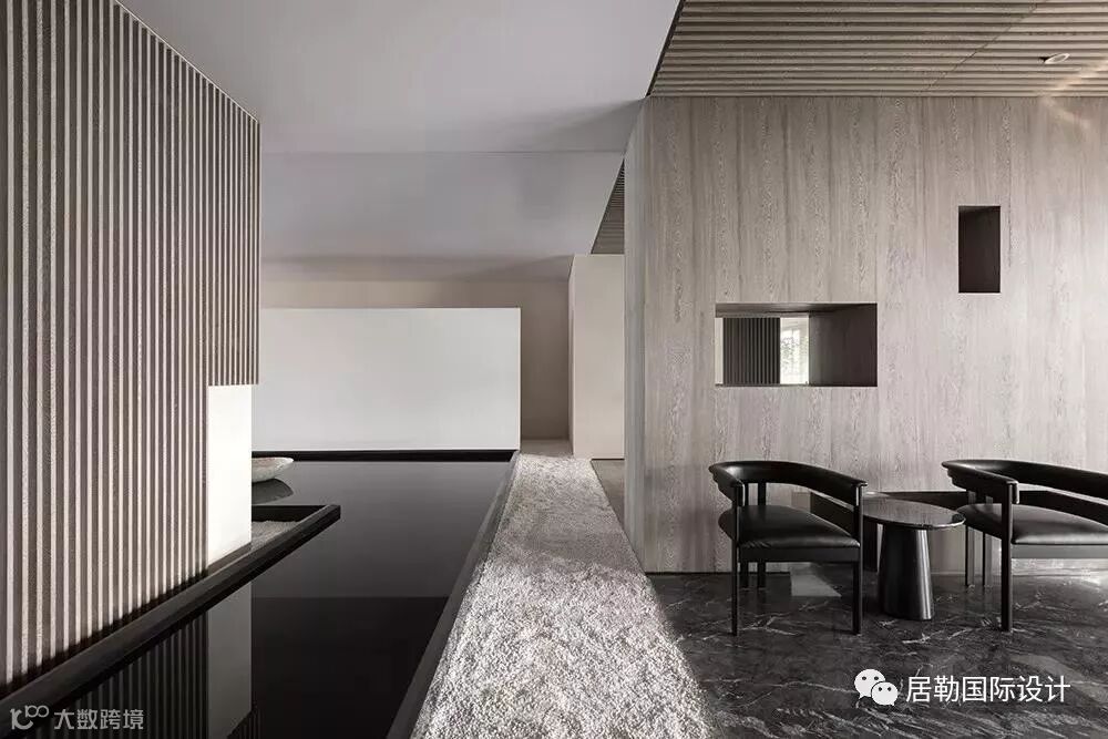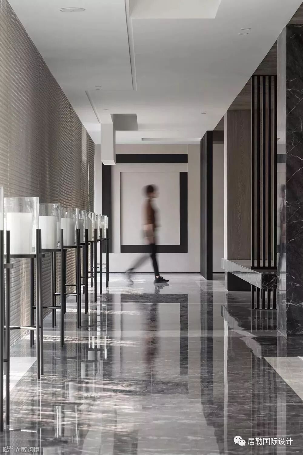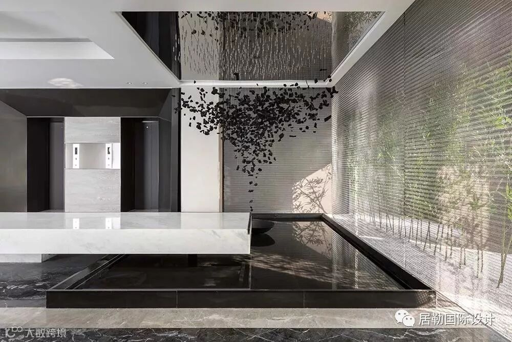 电梯区域采用了黑白两种明暗色调与量体空间构造等划分空间格局,天花板、地面、墙面不再是规整对称的水平线,而是通过对于天然材质的自然色彩与肌理的分辨布局,重新演绎动静。